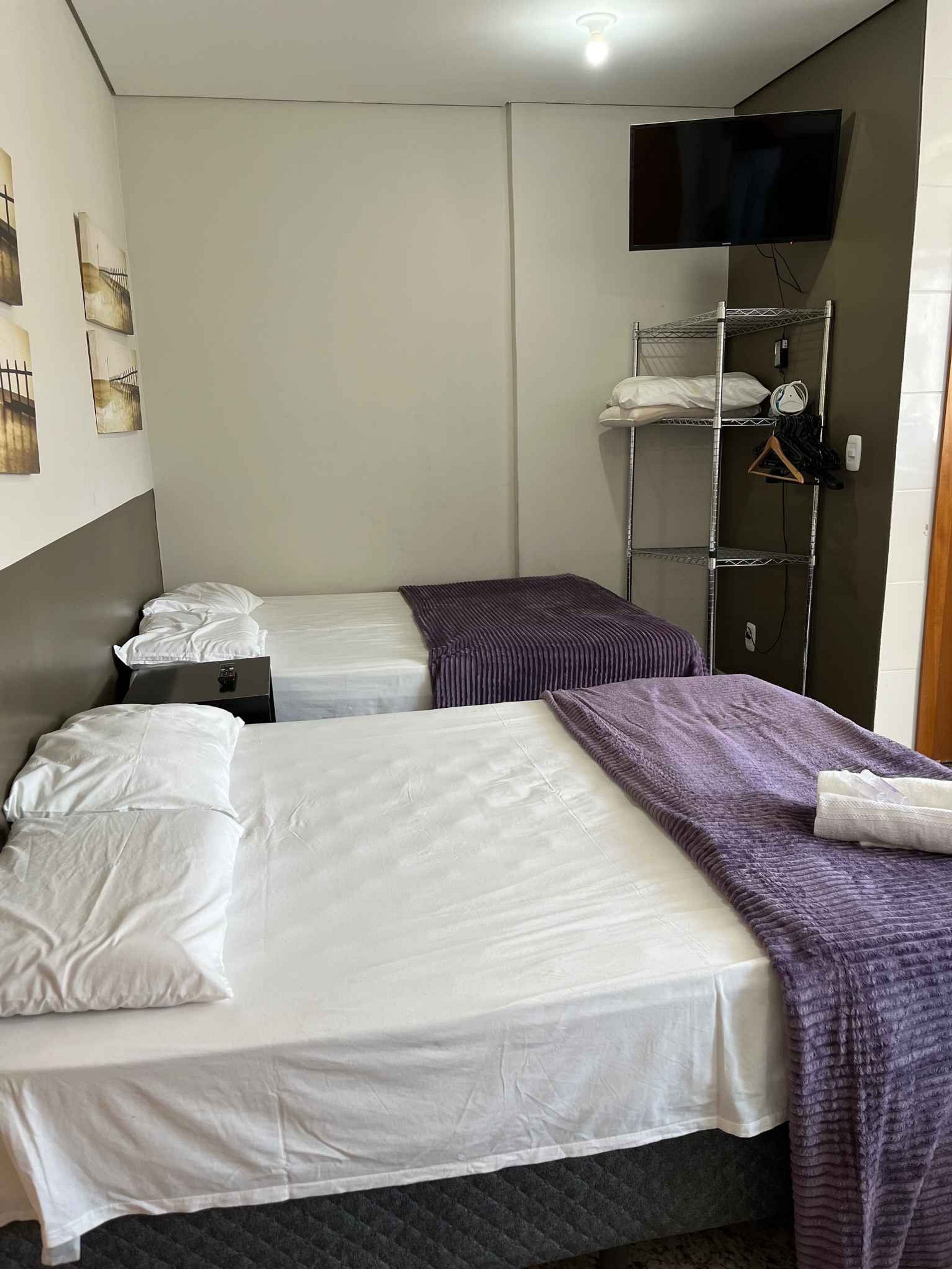 Possui no quarto duas camas de casal, um criado e aramado com cabides além de um colchão de solteiro extra e sofá dois lugares com smartv de 32". Oferece travesseiros, roupa de cama e banho, shampoo e sabonete. Na cozinha americana um cooktop de uma boca, forno de Micro-ondas de 20L, sanduicheira inox grill, liquidificador, garrafa térmica com base de filtro para café e cafeteira elétrica, copos, taças, pratos rasos, pratos fundos, tigelas e talheres e xícaras para seis pessoas. Esta disponível ferro e tábua de passar.