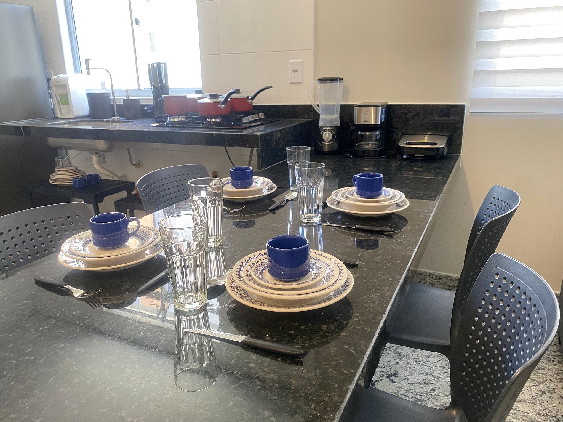A suíte possui uma cama de casal e um de solteiro com uma cômoda e criado de apoio. O quarto, uma cama de casal, criado mudo e cômoda. Todos os quartos e banheiros possuem travesseiros, roupa de cama e banho, shampoo e sabonete. A sala de estar possui um ambiente de jantar com uma mesa com quatro cadeiras, o outro ambiente conta com um sofá-cama de casal para duas pessoas, um rack em madeira e uma TV de 32”. A cozinha está equipada com refrigerador Consul de 320 L, forno de Micro-ondas Eletrolux de 27L, cooktop de quatro bocas com acendimento automático, sanduicheira inox grill, liquidificador, garrafa térmica com base de filtro para café e cafeteira elétrica. A cozinha possui também um jogo de seis panelas (frigideira, leiteira e panela de pressão) taboa e faca de corte, escorredor de macarrão, marinex, assadeiras, copos, taças, pratos rasos, pratos fundos, tigelas e talheres e xícaras para seis pessoas, e utensílios básicos de cozinha (escumadeira, peneira, concha, fouet, abridor de garrafa, saca rolha, cortador de pizza, cortador de queijo, etc). A área de serviço possui taboa e ferro de passar, balde, vassoura, rodo e pá, aspirador de pó, além de produtos básicos de limpeza.