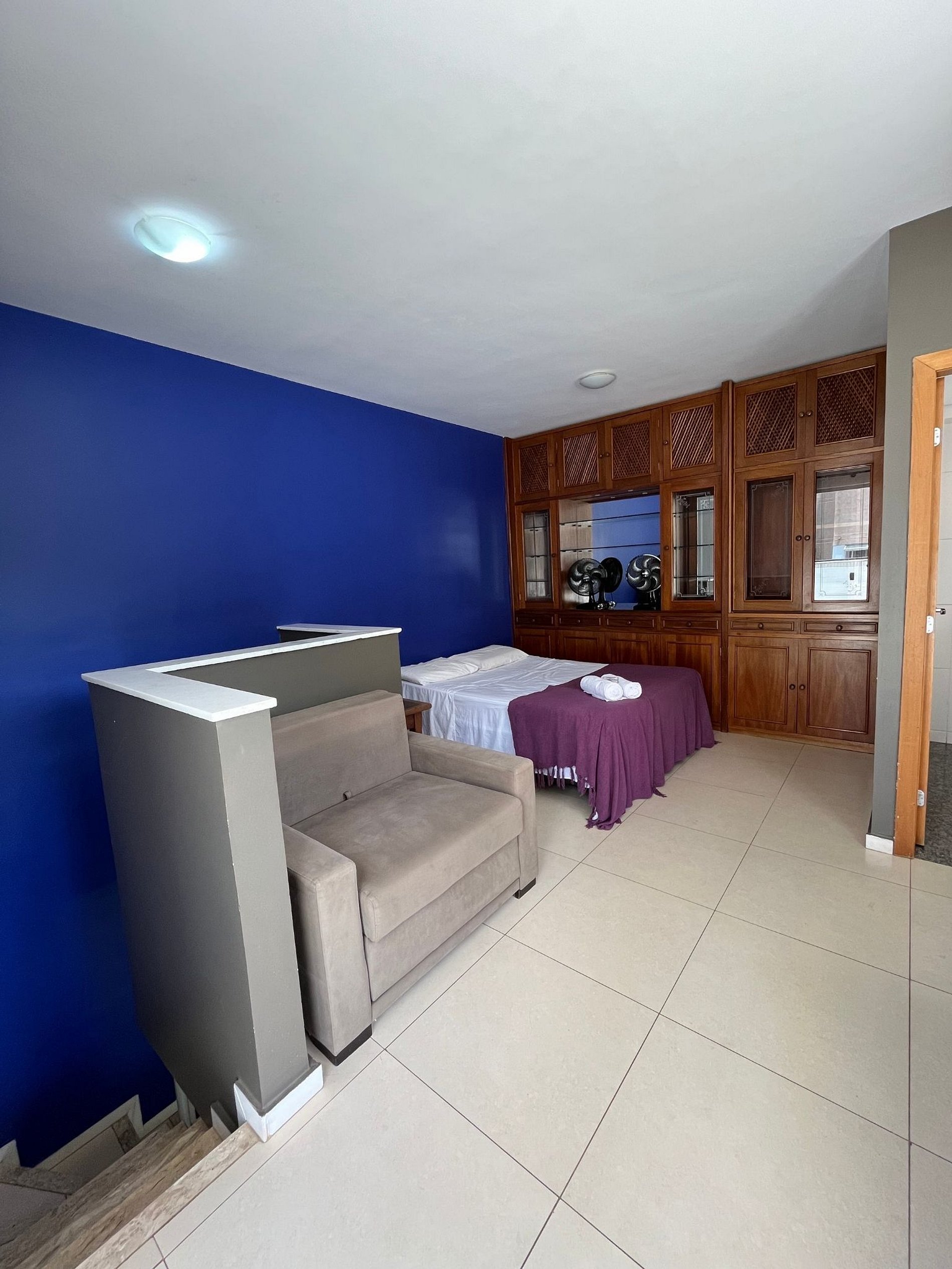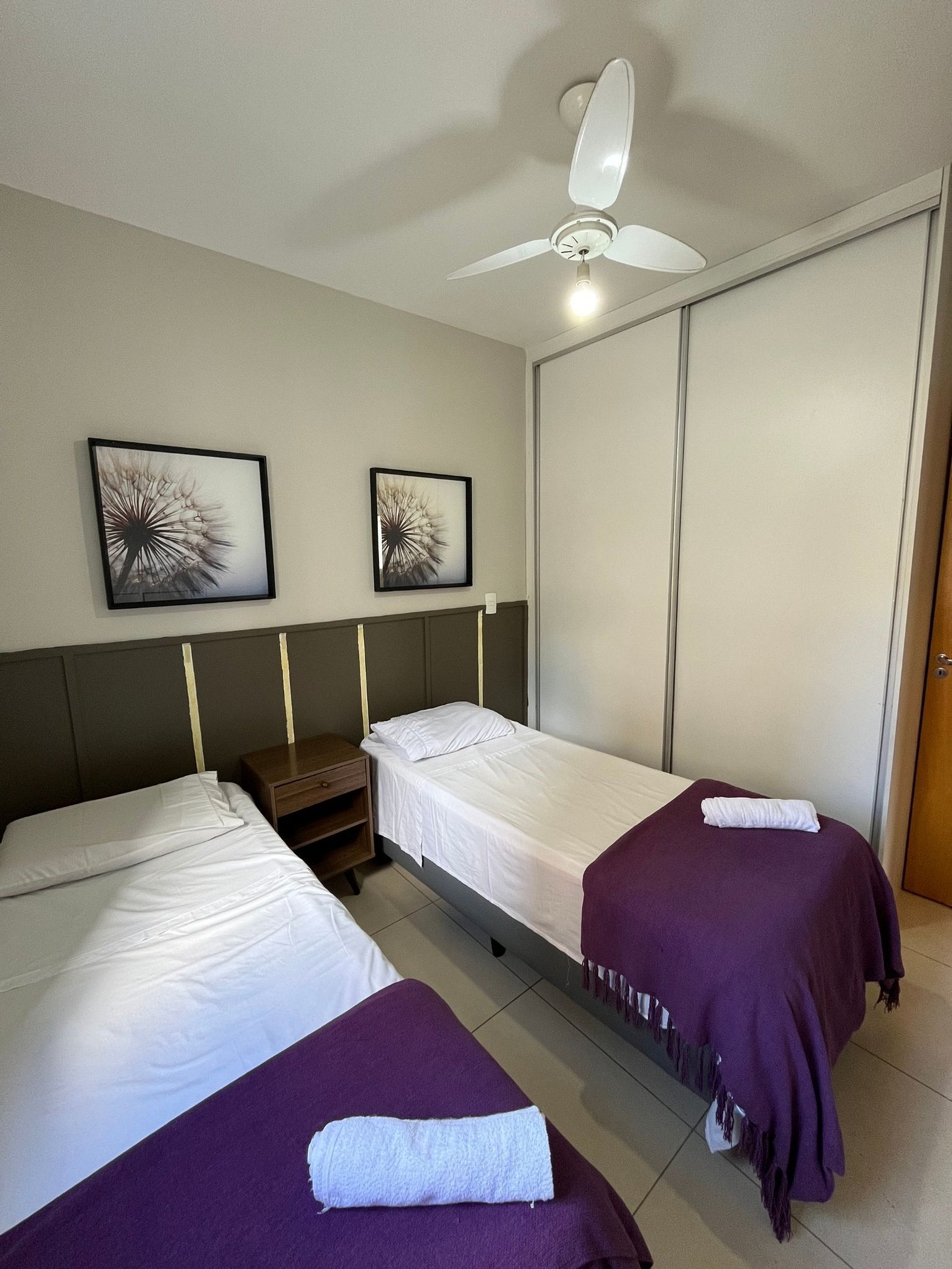 A suíte possui uma cama box de casal padrão, uma mesa de cabeceira e armário com cabides. O outro quarto possui duas camas de solteiro, mesa de cabeceira e armários. Os quartos e banheiros possuem travesseiros, roupa de cama e banho. A sala de estar possui um ambiente com uma estação de trabalho, o outro ambiente conta com um sofá para duas pessoas, uma smart TV 32” já conectada ao Wi-Fi do apartamento (acesso ao NETFLIX e aos canais abertos). A mesa de jantar com quatro cadeiras esta integrada com a bancada da cozinha. A cozinha, com armários, está equipada com Refrigerador de 240 L, forno de Micro-ondas de 20L, fogão de quatro bocas com acendimento automático, sanduicheira inox grill, liquidificador, garrafa térmica com base de filtro para café e filtro de água. Além de um jogo de quatro panelas, taboa e faca de corte, escorredor de macarrão, copos, pratos e talheres e xícaras para seis pessoas, e utensílios básicos de cozinha. A área de serviço possui um tanque de 20 litros, lavadora de roupas 8 kg turbo, tábua e ferro de passar, varal de chão, cesto para roupa suja, balde, vassoura, rodo e pá, além de produtos básicos de limpeza. No segundo nível da cobertura uma sala foi adaptada para funcionar como o terceiro quarto com uma cama de casal, uma cama de solteiro e um sofá cama. O ambiente conta com um lavabo e um terraço amplo.