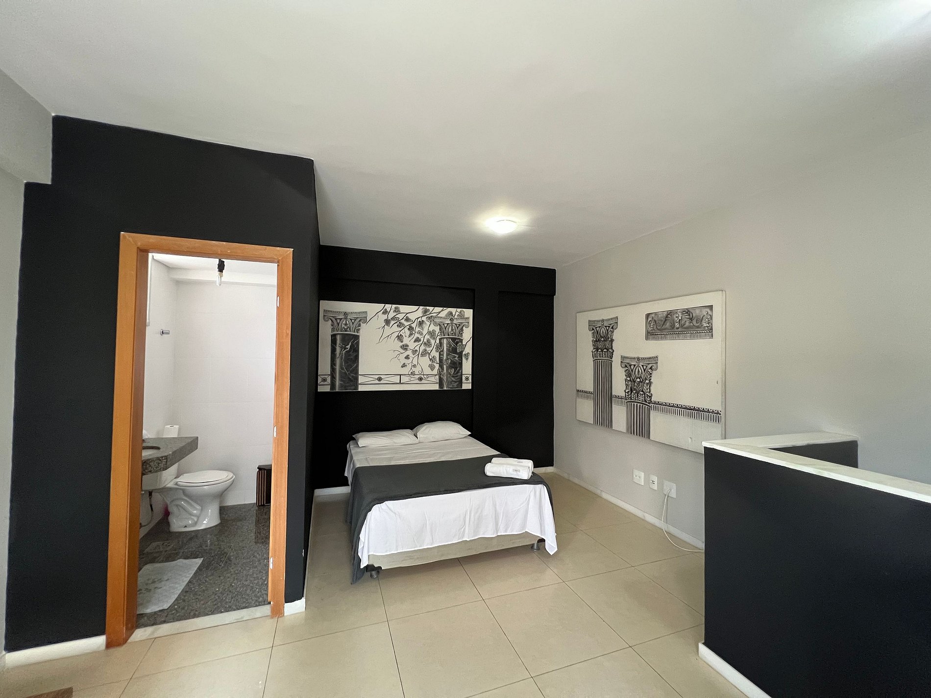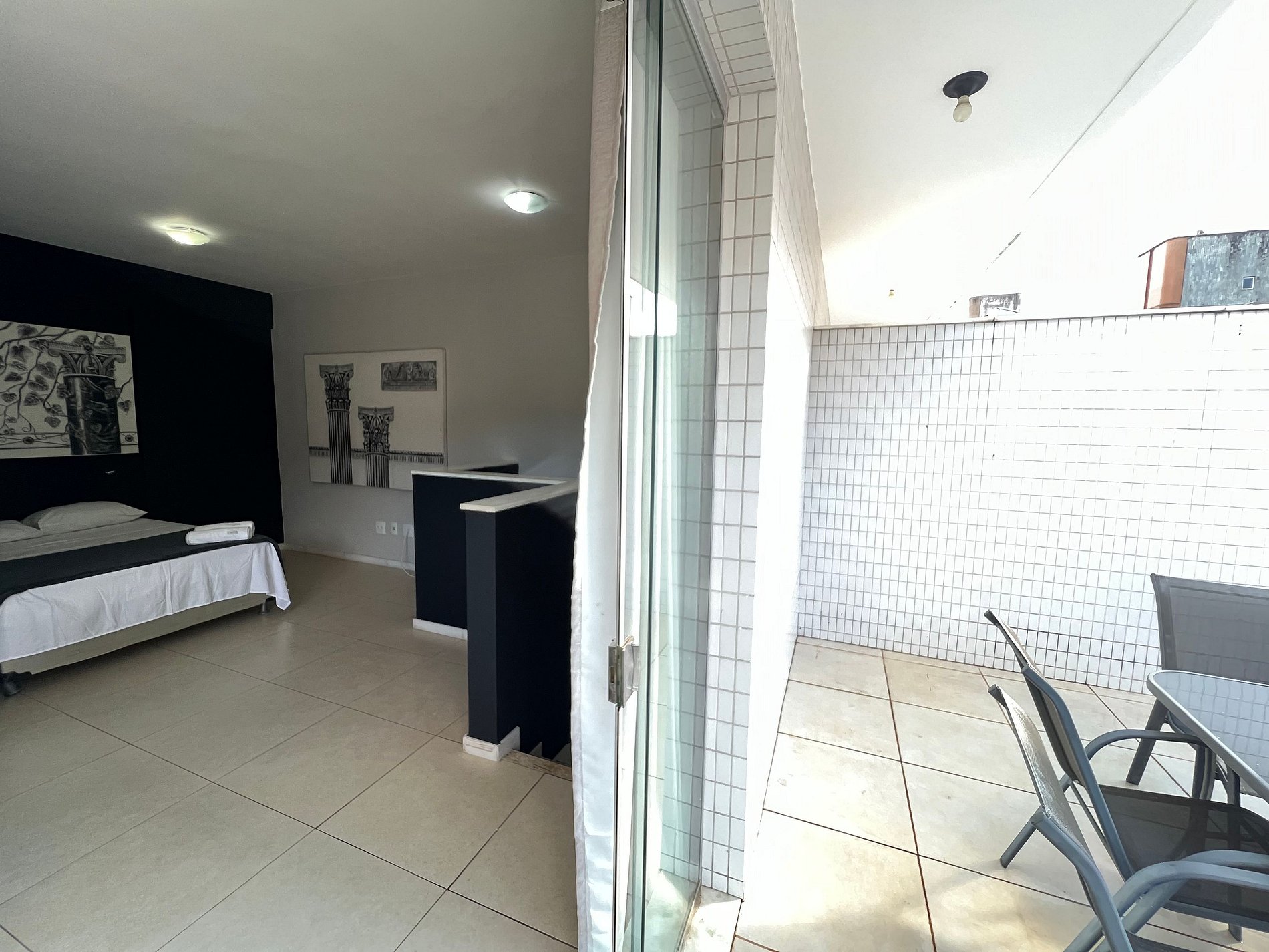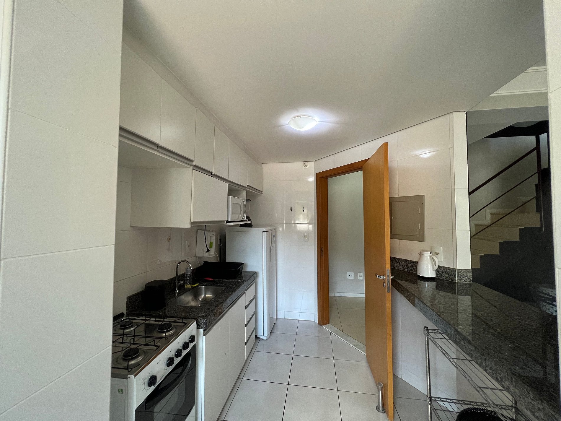 A suíte possui uma cama box de casal padrão, uma mesa de cabeceira e armário com cabides. O outro quarto no primeiro piso também possui cama box de casal padrão, uma mesa de cabeceira e armário com cabides. Os quartos e banheiros possuem travesseiros, roupa de cama e banho. A sala de estar possui um ambiente com uma mesa de jantar para quatro pessoas, o outro ambiente conta com um sofá-cama para duas pessoas, uma smart TV. A varanda também possui uma segunda mesa com quatro cadeiras. A cozinha, com armários, está equipada com Refrigerador 240 L, forno de micro-ondas de 20L, fogão de quatro bocas com acendimento automático, sanduicheira inox grill, liquidificador, garrafa térmica com base de filtro para café e filtro de água. Além de um jogo de quatro panelas, taboa e faca de corte, escorredor de macarrão, copos, pratos e talheres e xícaras para seis pessoas, e utensílios básicos de cozinha. A área de serviço possui um tanque de 20 litros, lavadora de roupas 8 kg turbo, taboa e ferro de passar, varal de chão, cesto para roupa suja, balde, vassoura, rodo e pá, além de produtos básicos de limpeza. No segundo nível a sala foi adaptada para um terceiro quarto com uma cama box de casal e uma de solteiro, além do terraço, com mesa externa e cadeiras.