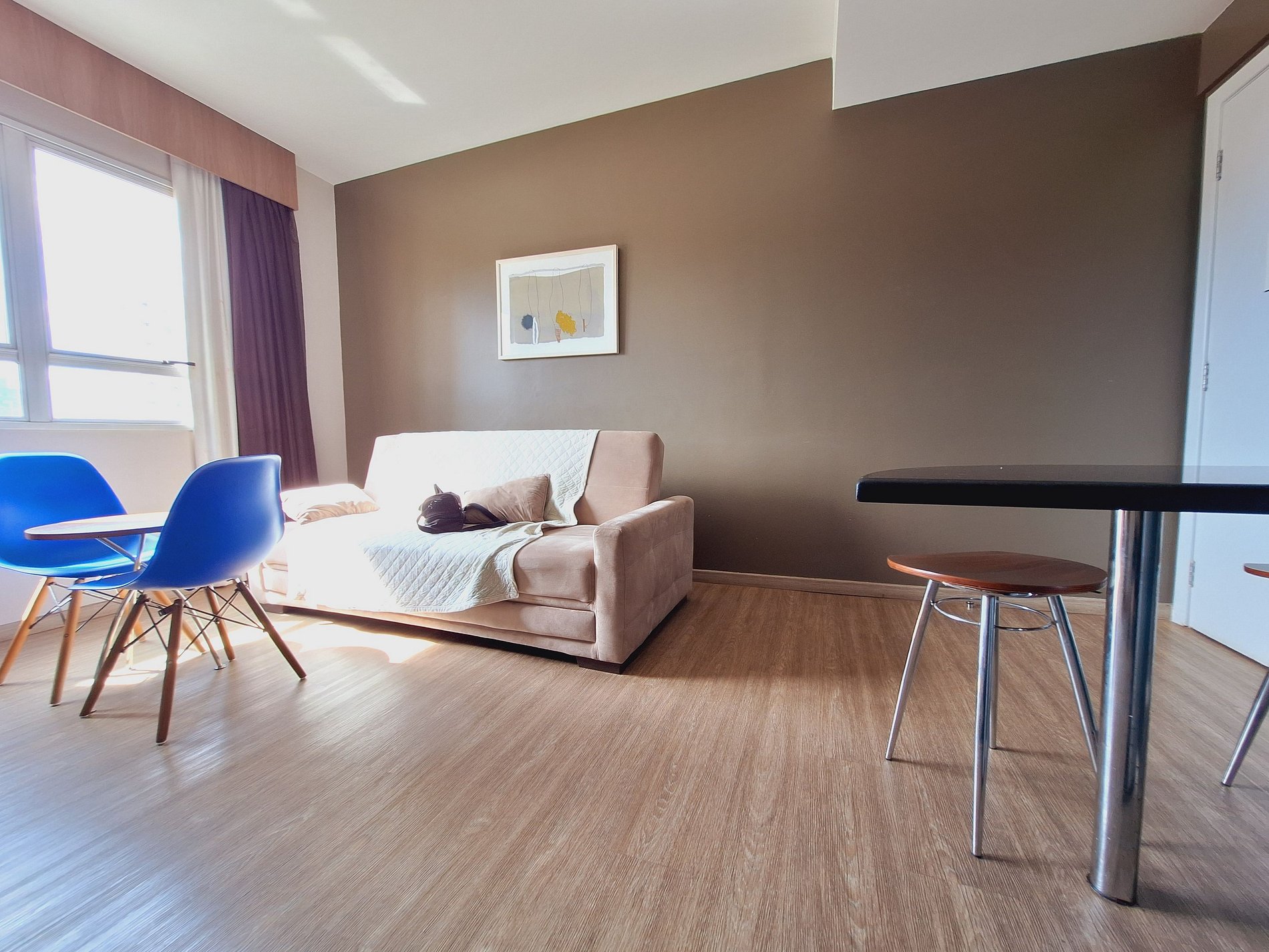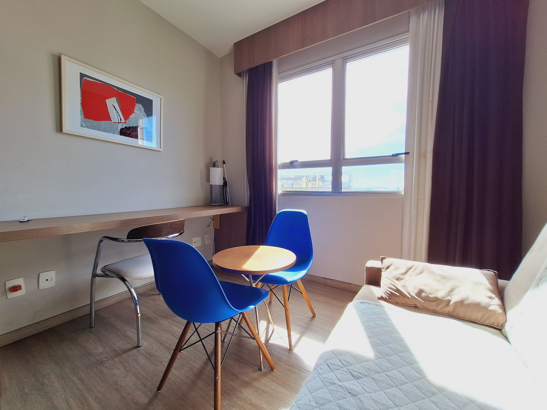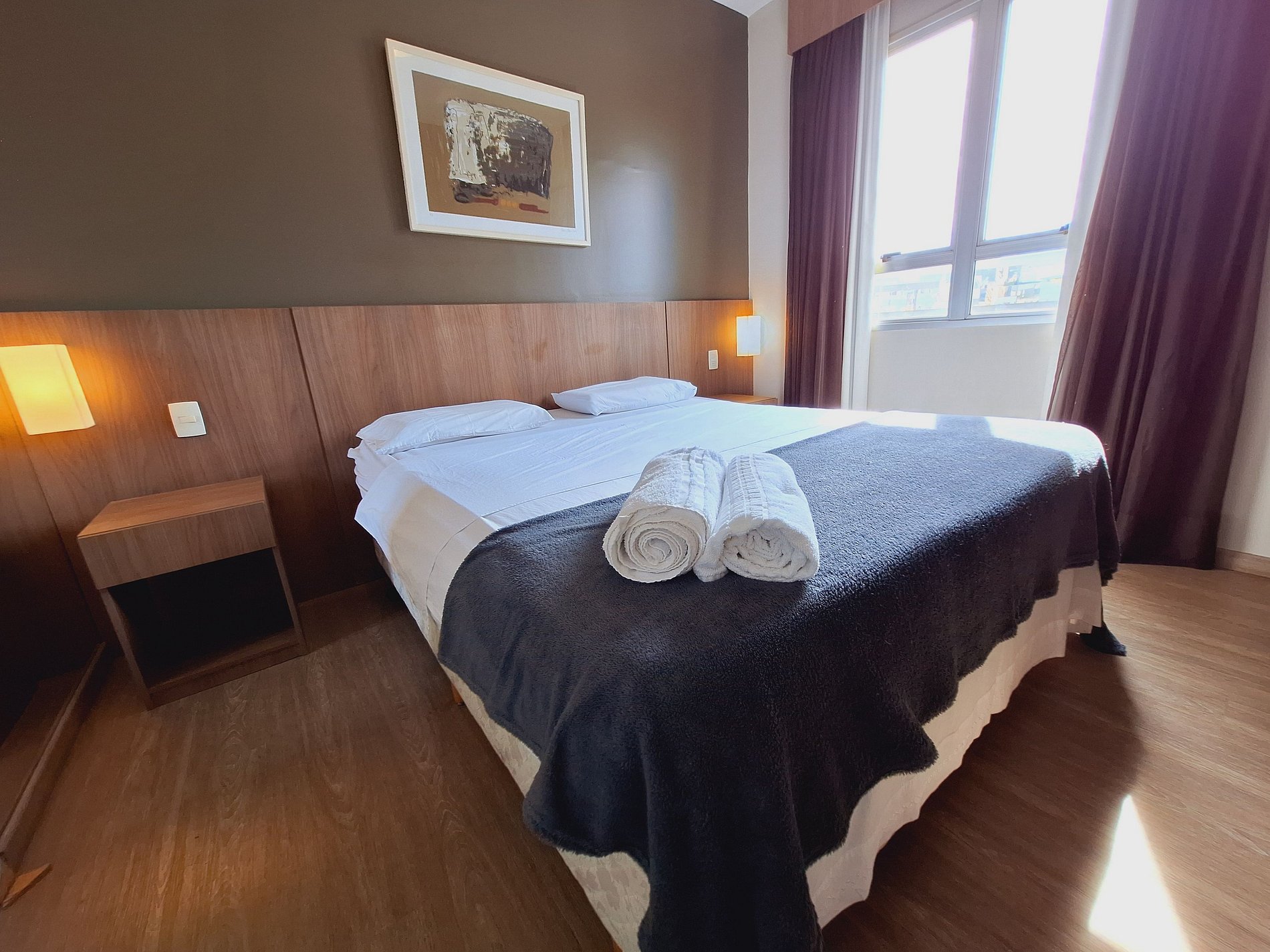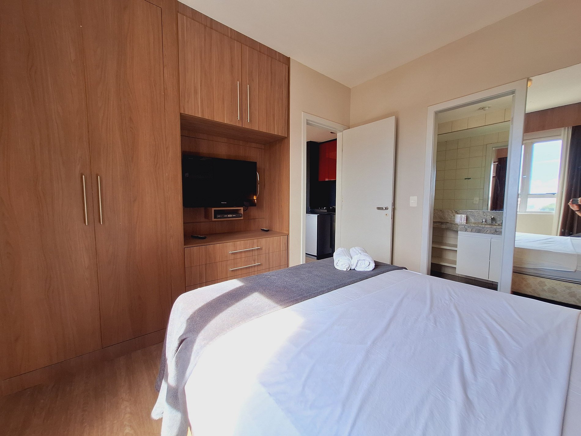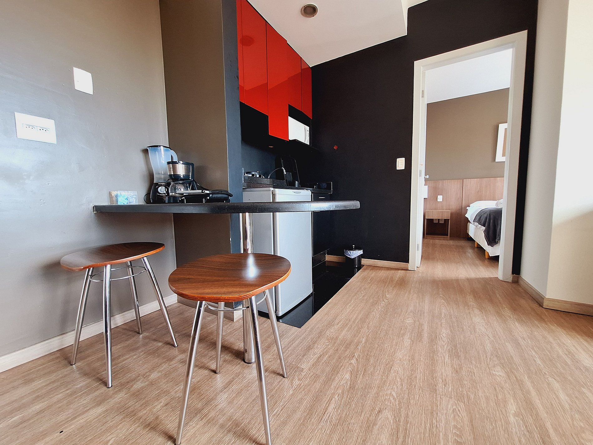 A suíte possui uma cama box de casal padrão, uma mesa de cabeceira com luminária e armário com cabides e televisão. O apartamento oferece travesseiros, roupa de cama e banho, shampoo e sabonete. A sala de estar possui um ambiente com uma estação de trabalho e uma mesa com duas cadeiras, um sofá-cama em tecido para duas pessoas. O outro ambiente é uma cozinha americana com armários, bancada com duas outras cadeiras, e está equipada com refrigerador tipo frigobar, forno de Micro-ondas de 20L, cooktop de duas bocas, sanduicheira inox grill, liquidificador, garrafa térmica com base de filtro para café e cafeteira elétrica. A cozinha possui também copos, taças, pratos rasos, pratos fundos, tigelas e talheres e xícaras. Estão disponíveis ferro, tábua de passar e produtos de limpeza.