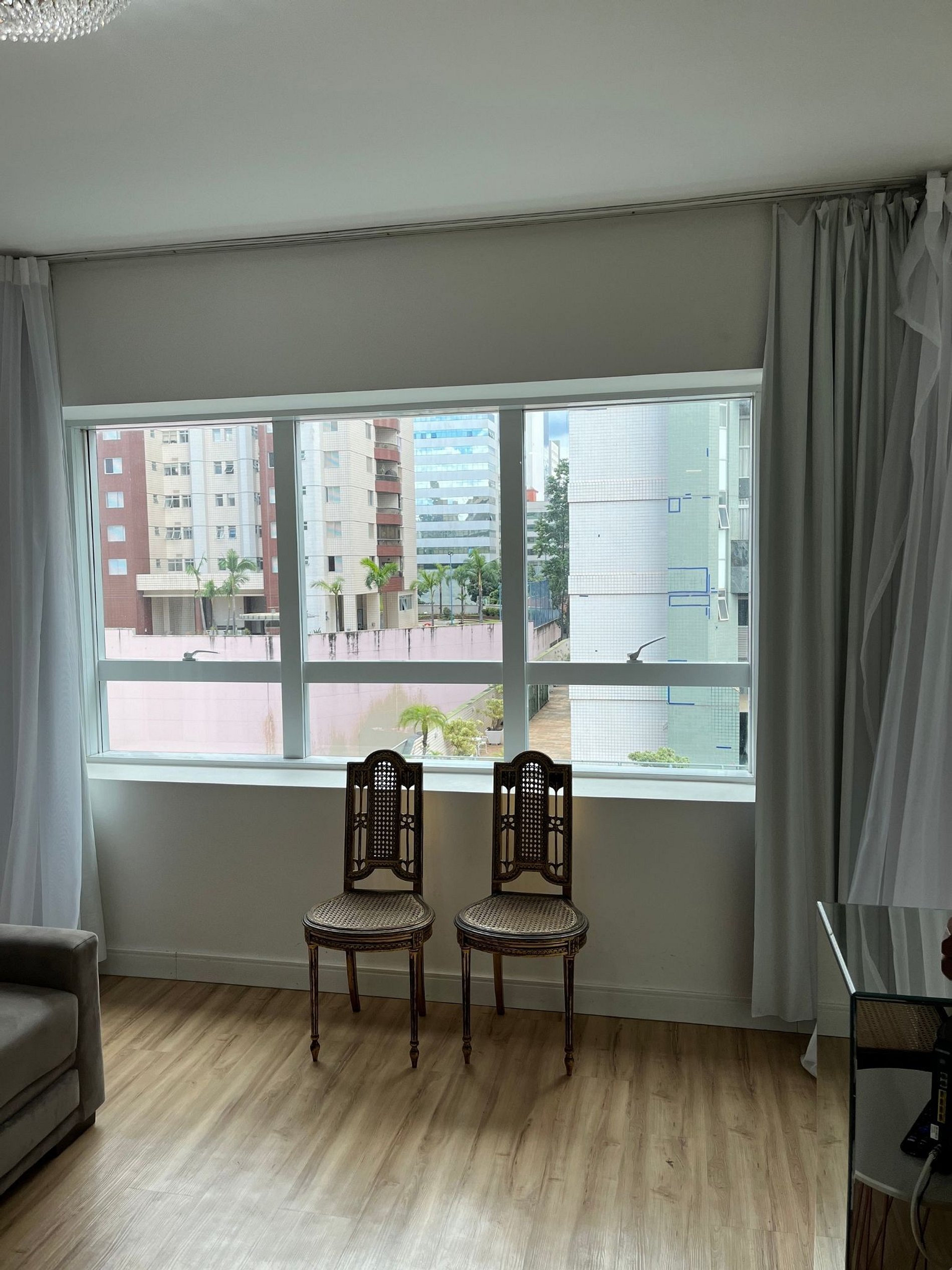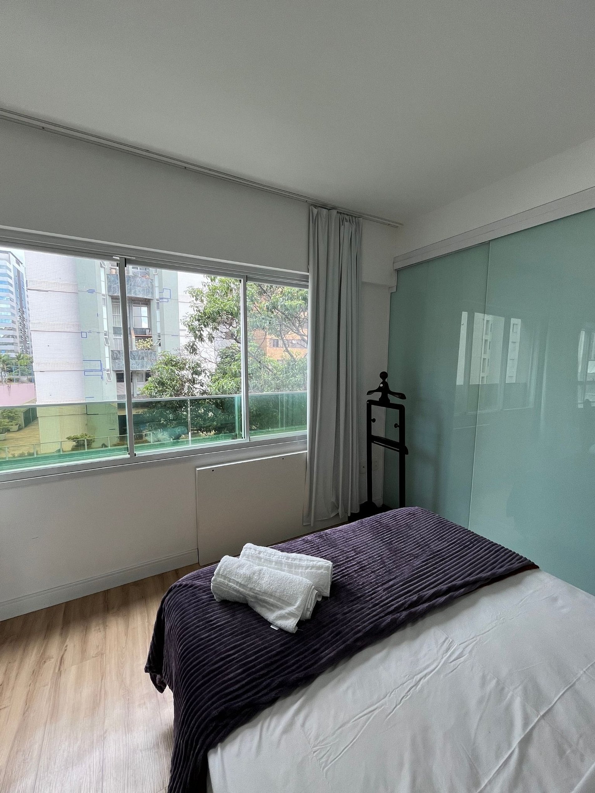 O apartamento conta com com dois ambientes sendo o primeiro uma sala com cozinha americana e o segundo com uma camas de casal, um mesa de cabeceira e armário com cabides, além do banheiro. Oferece travesseiros, roupa de cama e banho, shampoo e sabonete. Ar condicionado na suíte.A cozinha americana conta com cooktop de duas bocas, geladeira 240 litros forno de Micro-ondas de 20L, sanduicheira inox grill, liquidificador, garrafa térmica com base de filtro para café e cafeteira elétrica, copos, taças, pratos rasos, pratos fundos, tigelas e talheres e xícaras. Possui máquina de lavar roupa. Esta disponível ferro e tábua de passar. Na sala há um sofá cama, TV 34" e um colchão de solteiro avulso.