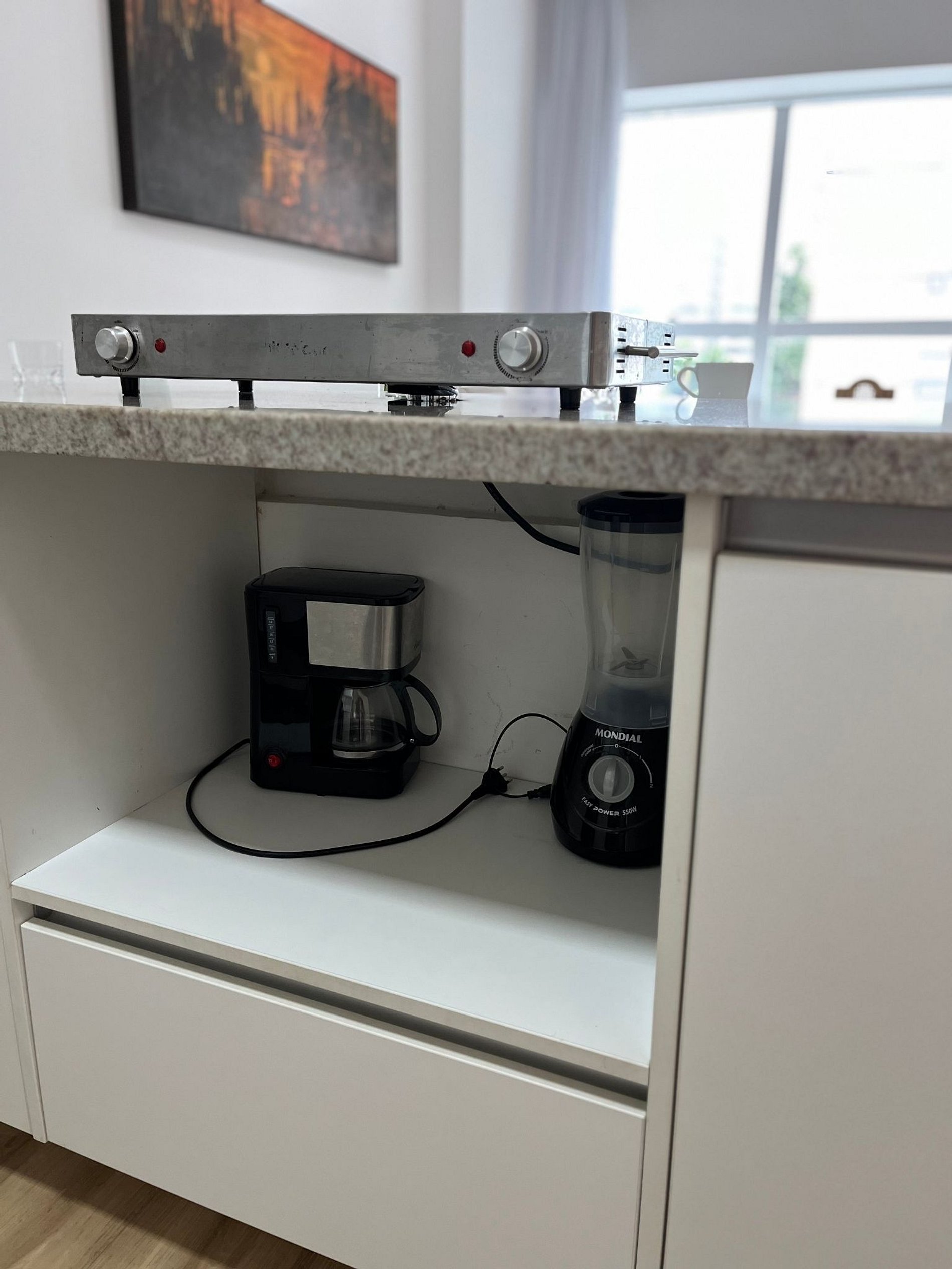 O apartamento conta com com dois ambientes sendo o primeiro uma sala com cozinha americana e o segundo com uma camas de casal, um mesa de cabeceira e armário com cabides, além do banheiro. Oferece travesseiros, roupa de cama e banho, shampoo e sabonete. Ar condicionado na suíte.A cozinha americana conta com cooktop de duas bocas, geladeira 240 litros forno de Micro-ondas de 20L, sanduicheira inox grill, liquidificador, garrafa térmica com base de filtro para café e cafeteira elétrica, copos, taças, pratos rasos, pratos fundos, tigelas e talheres e xícaras. Possui máquina de lavar roupa. Esta disponível ferro e tábua de passar. Na sala há um sofá cama, TV 34" e um colchão de solteiro avulso.