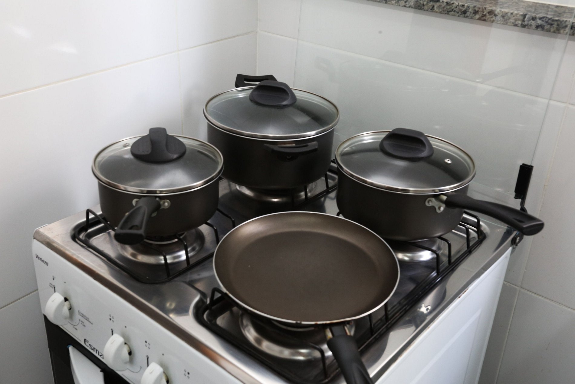 A suíte possui uma cama box de casal padrão com armário e cabides. O segundo e terceiro quartos possuem cama box de casal, criado mudo e também armário com cabides. Os dois quartos são atendidos por um banheiro social. Todos os quartos e banheiros possuem travesseiros, roupa de cama e banho, shampoo e sabonete. A sala de estar possui um ambiente com uma estação de trabalho e uma mesa com quatro cadeiras, o outro ambiente conta com um sofá em tecido para três pessoas, um rack em madeira e uma TV de 24”. A cozinha, com armários, está equipada com refrigerador de 240 L, forno de Micro-ondas de 20L, fogão de quatro bocas com acendimento automático, sanduicheira inox grill, liquidificador, garrafa térmica com base de filtro para café e cafeteira elétrica.A cozinha possui também um jogo de seis panelas (frigideira, leiteira e panela de pressão) taboa e faca de corte, escorredor de macarrão, marinex, assadeiras, copos, taças, pratos rasos, pratos fundos, tigelas e talheres e xícaras para seis pessoas, e utensílios básicos de cozinha (escumadeira, peneira, concha, fouet, abridor de garrafa, saca rolha, cortador de pizza, cortador de queijo, etc). A área de serviço possui um tanque de 20 litros, lavadora de roupas 8 kg turbo, taboa e ferro de passar, varal de chão, cesto para roupa suja, balde, vassoura, rodo e pá, aspirador de pó, além de produtos básicos de limpeza.
