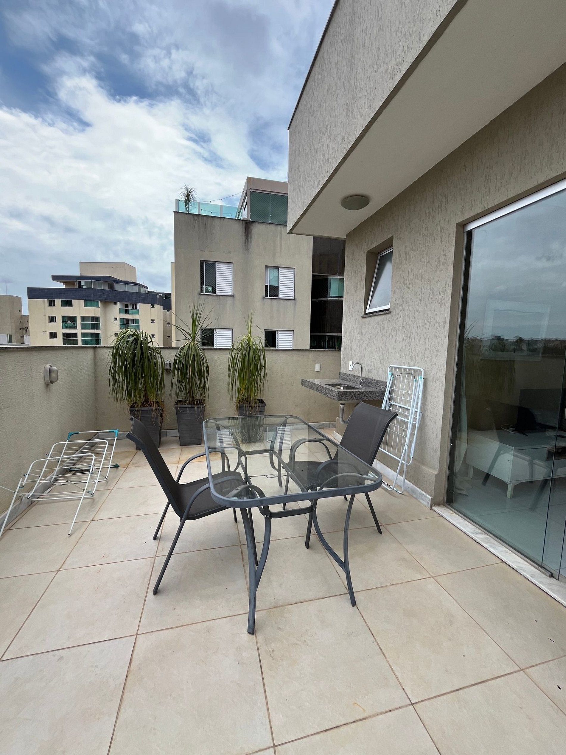No segundo nível da cobertura o terceiro quarto possui uma cama box de casal padrão com uma estação de trabalho e armário e cabides. Uma sala com sofá em tecido para duas pessoas, um rack com outra TV de 32". O quarto e a sala são atendidos por um terceiro banheiro social. No terraço, uma mesa com seis cadeiras e um ombrelone.