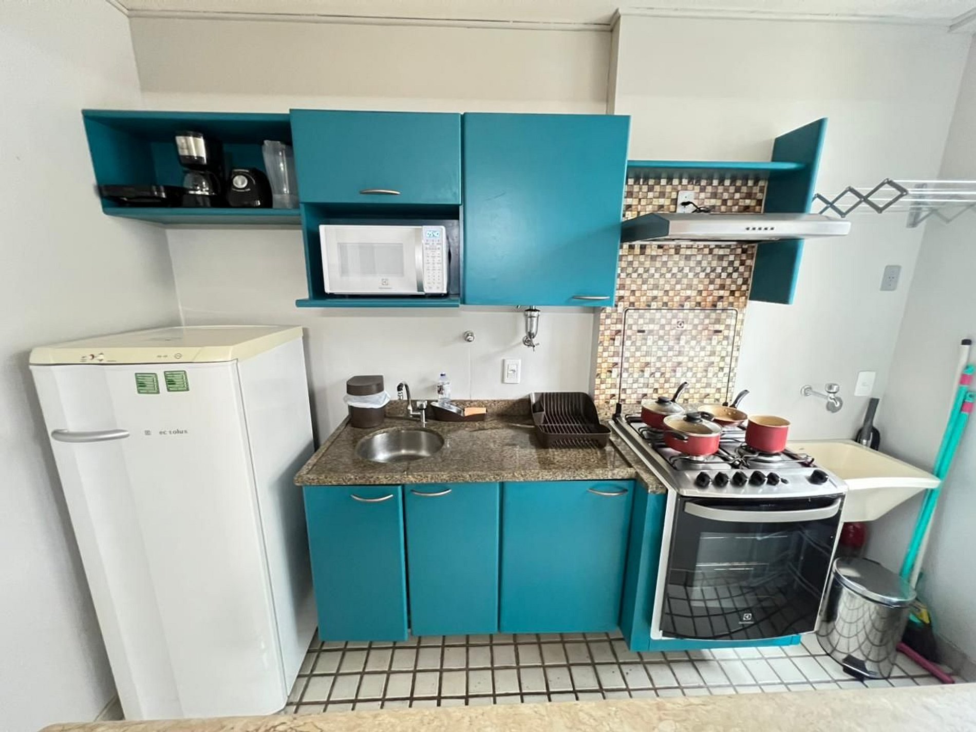 O quarto possui uma cama queen, um criado e armário com cabides e televisão. O apartamento oferece travesseiros, roupa de cama e banho, shampoo e sabonete. A sala de estar possui um ambiente com uma uma mesa com duas cadeiras para refeição e trabalho e uma cama de casal com televisão 43". O outro ambiente é uma cozinha americana com armários, e está equipada com refrigerador fogão quatro bocas com forno, Micro-ondas de 20L, sanduicheira inox grill, liquidificador, garrafa térmica com base de filtro para café e cafeteira elétrica .A cozinha possui também copos, taças, pratos rasos, pratos fundos, tigelas e talheres e xícaras para quatro pessoas. Esta disponível ferro e tábua de passar.