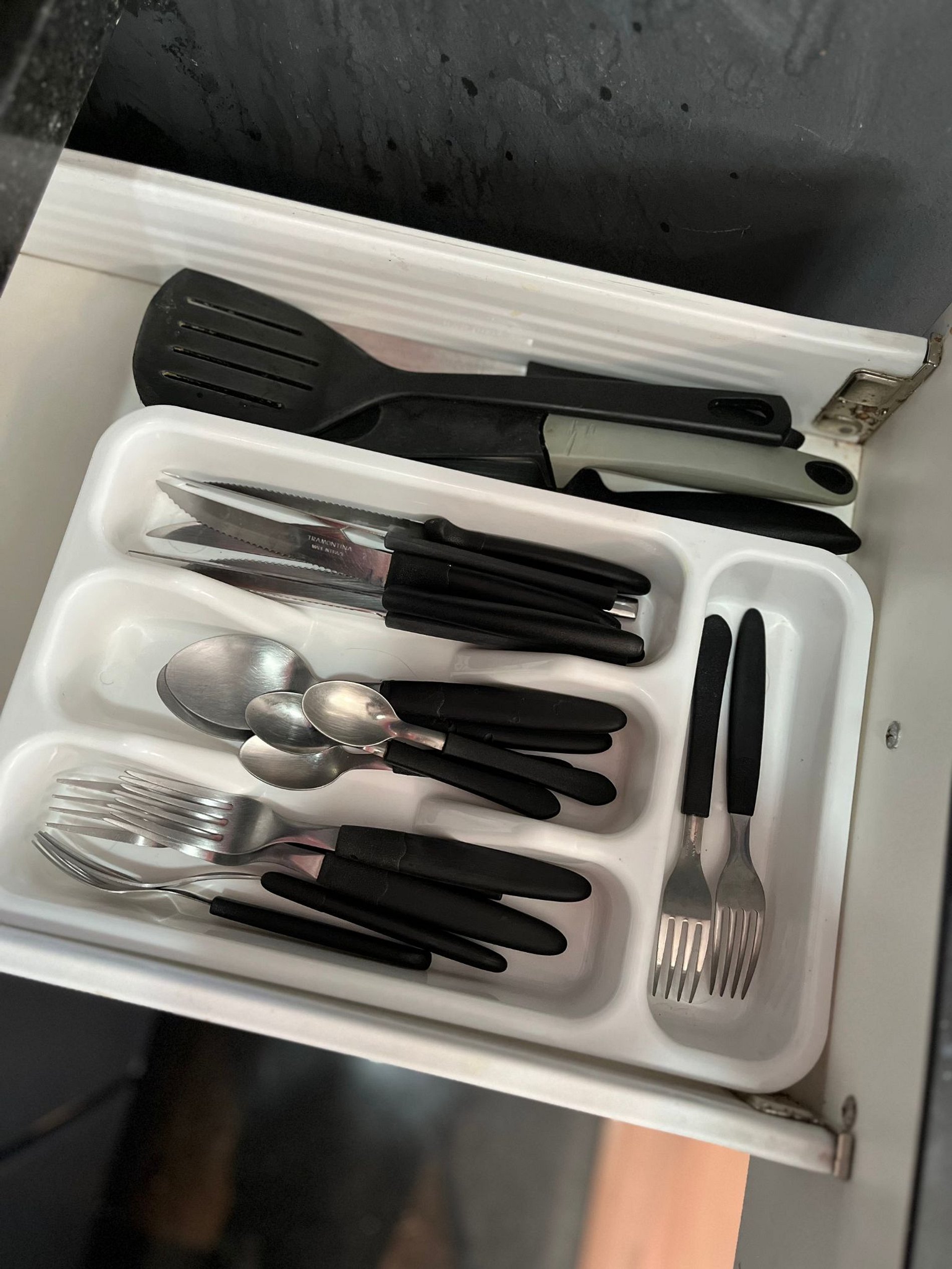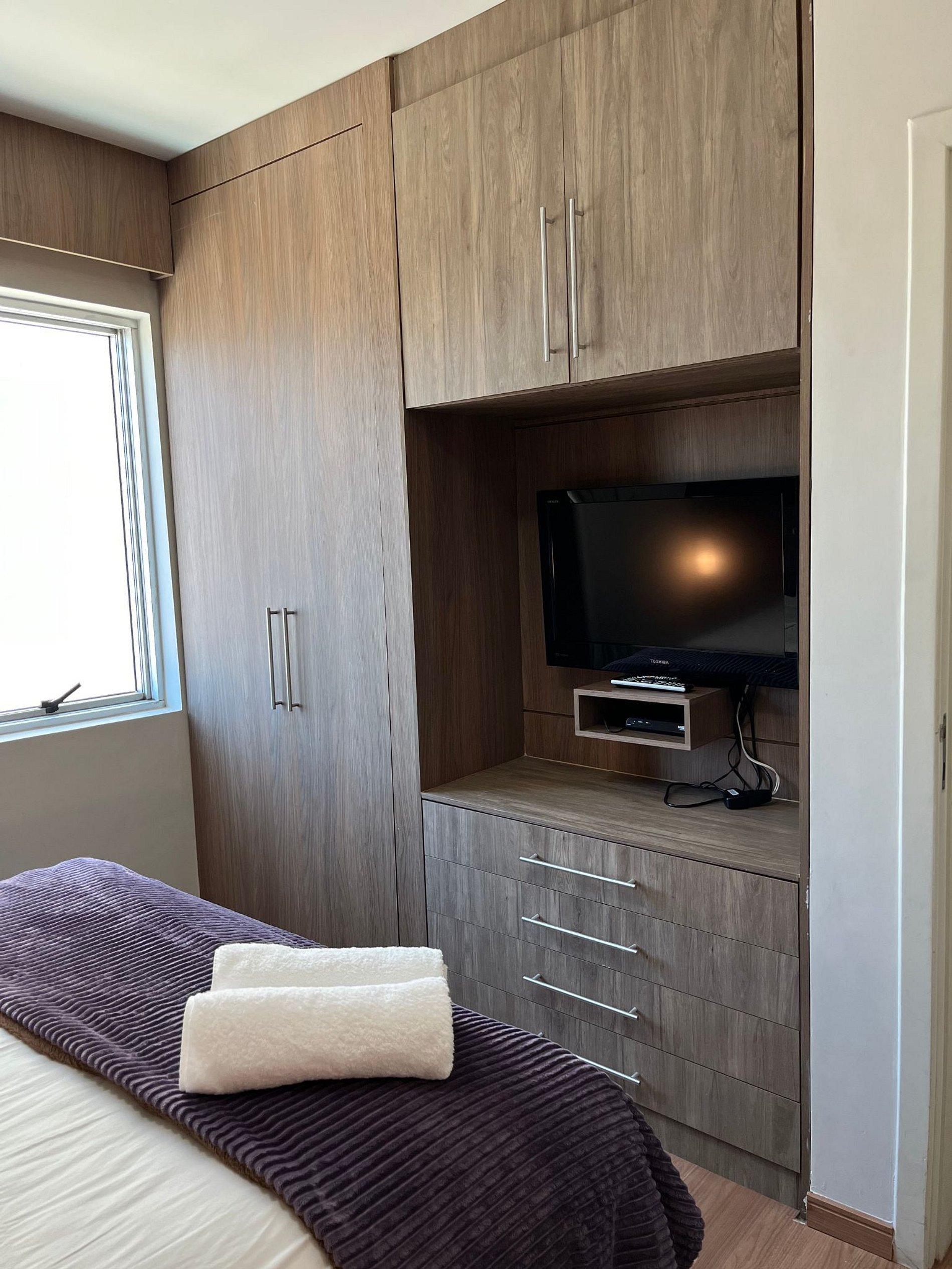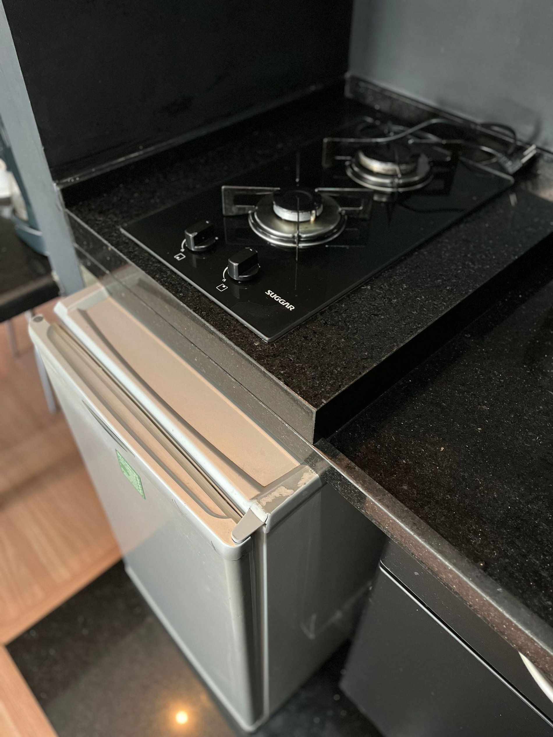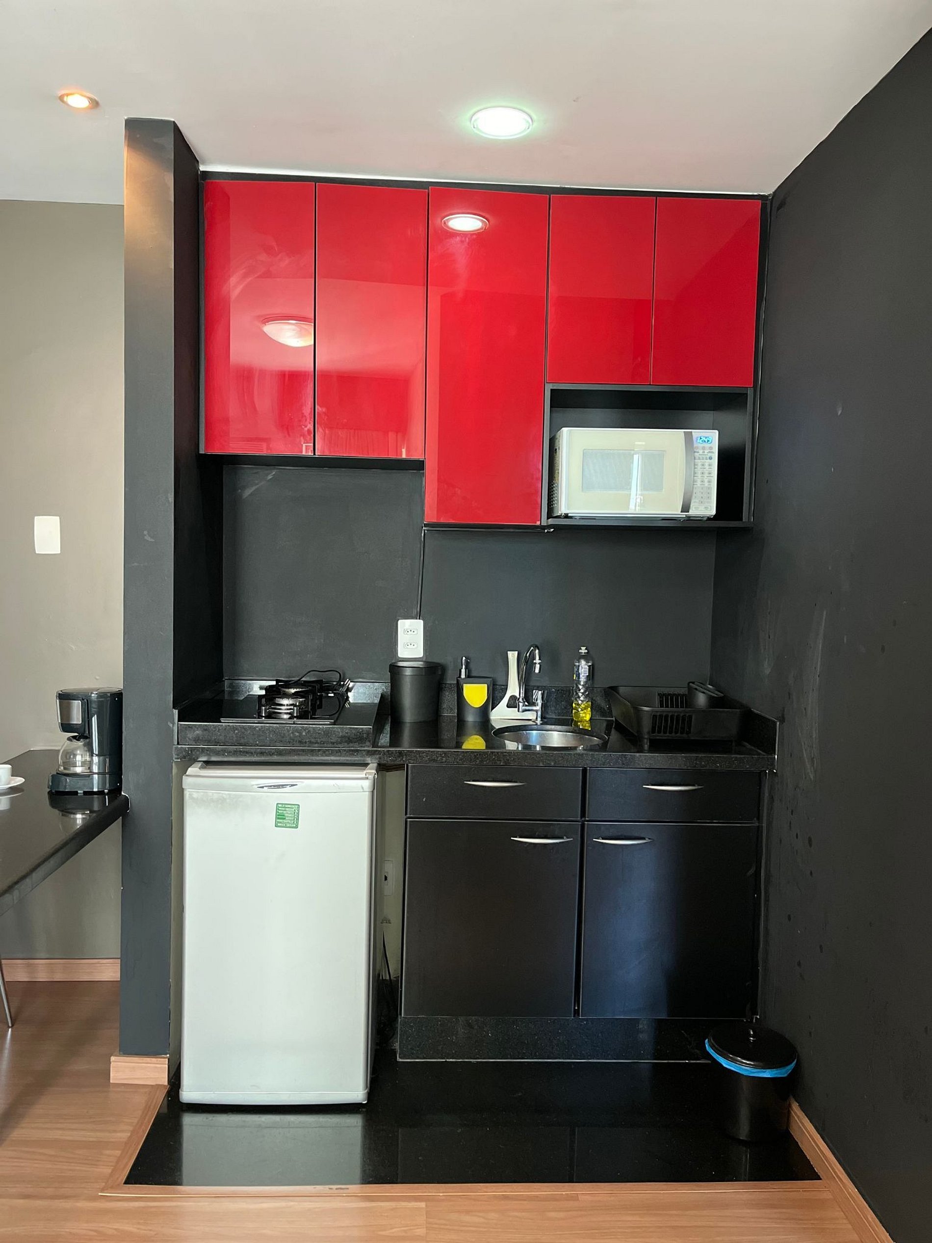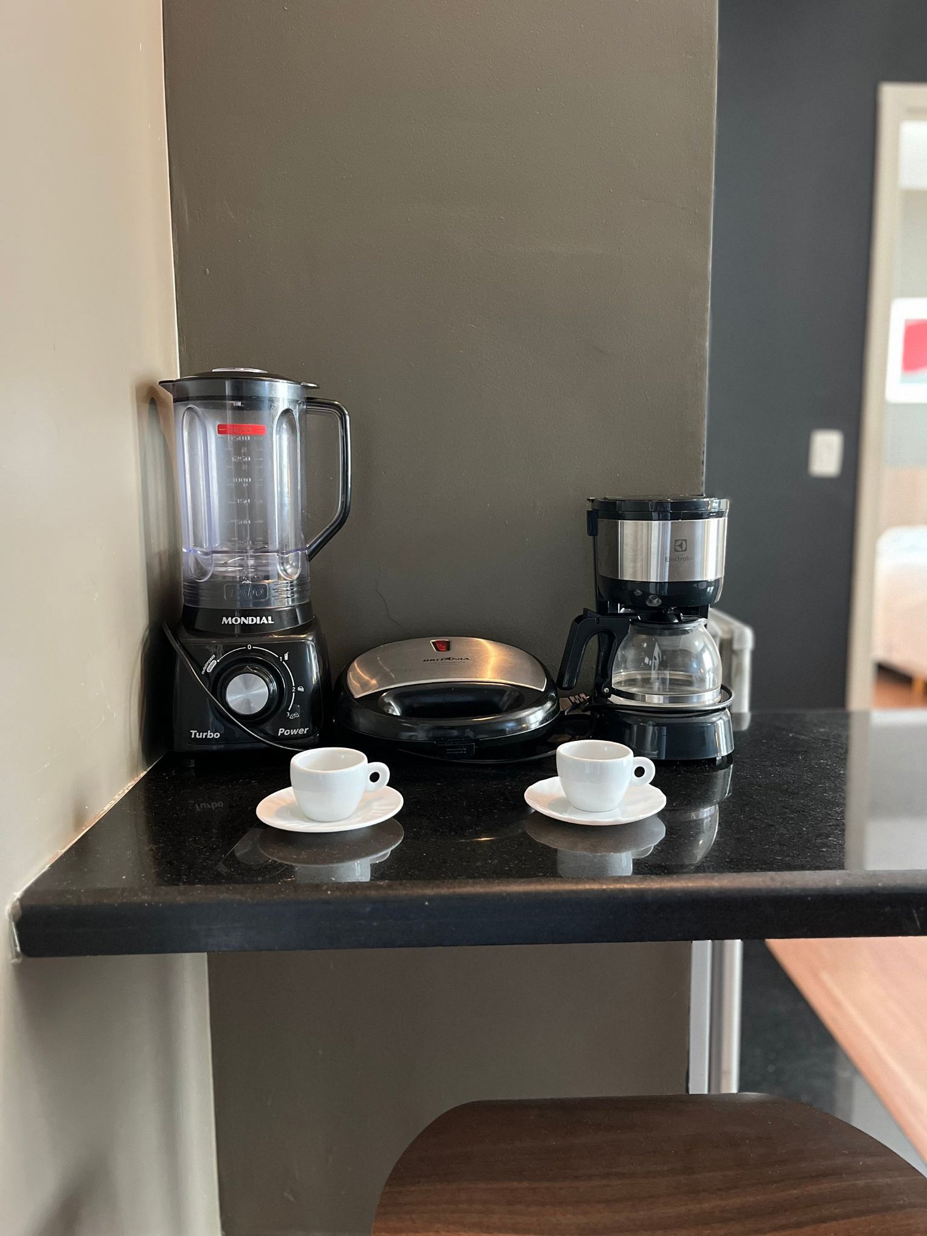 A suíte possui uma cama box queen, uma mesa de cabeceira com luminária e armário com cabides e televisão. O apartamento oferece travesseiros, roupa de cama e banho, shampoo e sabonete. A sala de estar possui um ambiente com uma estação de trabalho e uma mesa com duas cadeiras, um sofá-cama em tecido para duas pessoas. O outro ambiente é uma cozinha americana com armários, bancada com duas outras cadeiras, e está equipada com refrigerador tipo frigobar, forno de Micro-ondas de 20L, cooktop de duas bocas, sanduicheira inox grill, liquidificador, garrafa térmica com base de filtro para café e cafeteira elétrica. A cozinha possui também copos, taças, pratos rasos, pratos fundos, tigelas e talheres e xícaras. Estão disponíveis ferro, tábua de passar e produtos de limpeza.