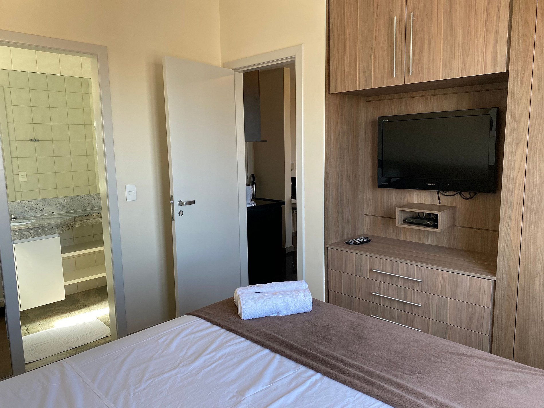A suíte possui uma cama box de casal padrão, um criado e armário com cabides e televisão. O apartamento oferece travesseiros, roupa de cama e banho, shampoo e sabonete. A sala de estar possui um ambiente com uma estação de trabalho e uma mesa com duas cadeiras, um sofá-cama em tecido para duas pessoas. O outro ambiente é uma cozinha americana com armários, bancada com duas outras cadeiras, e está equipada com refrigerador tipo frigobar, forno de Micro-ondas Eletrolux de 20L, cooktop de duas bocas, sanduicheira inox grill, liquidificador, garrafa térmica com base de filtro para café e cafeteira elétrica.A cozinha possui também copos, taças, pratos rasos, pratos fundos, tigelas e talheres e xícaras para quatro pessoas. Está disponível ferro e tábua de passar.