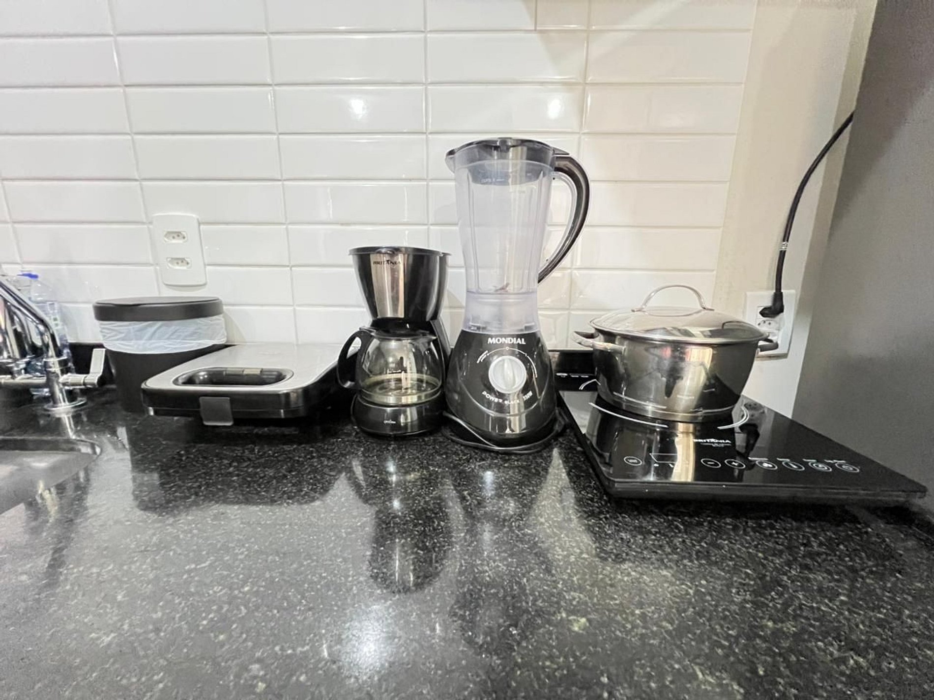 A suíte possui uma cama de casal, uma mesa de cabeceira e aramados com cabides. O segundo quarto conta com duas camas de solteiro. O apartamento oferece travesseiros, roupa de cama e banho, shampoo e sabonete. A sala de estar possui um ambiente com uma uma mesa com quatro cadeiras para refeição e trabalho e um sofá com televisão 43". Possui ainda varanda. O outro ambiente é uma cozinha americana , e está equipada com refrigerador, fogão de indução, micro-ondas de 20L, sanduicheira inox grill, liquidificador, garrafa térmica com base de filtro para café e cafeteira elétrica . Máquina de lavar e produtos de limpeza à disposição. A cozinha possui também copos, taças, pratos rasos, pratos fundos, tigelas e talheres e xícaras para quatro pessoas. Esta disponível ferro e tábua de passar.