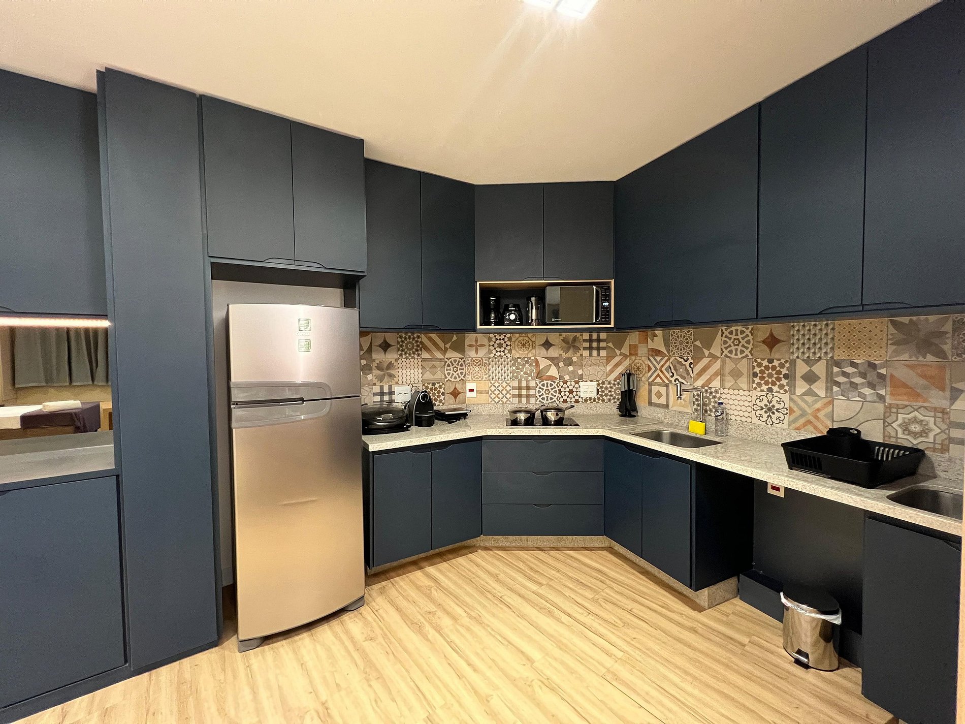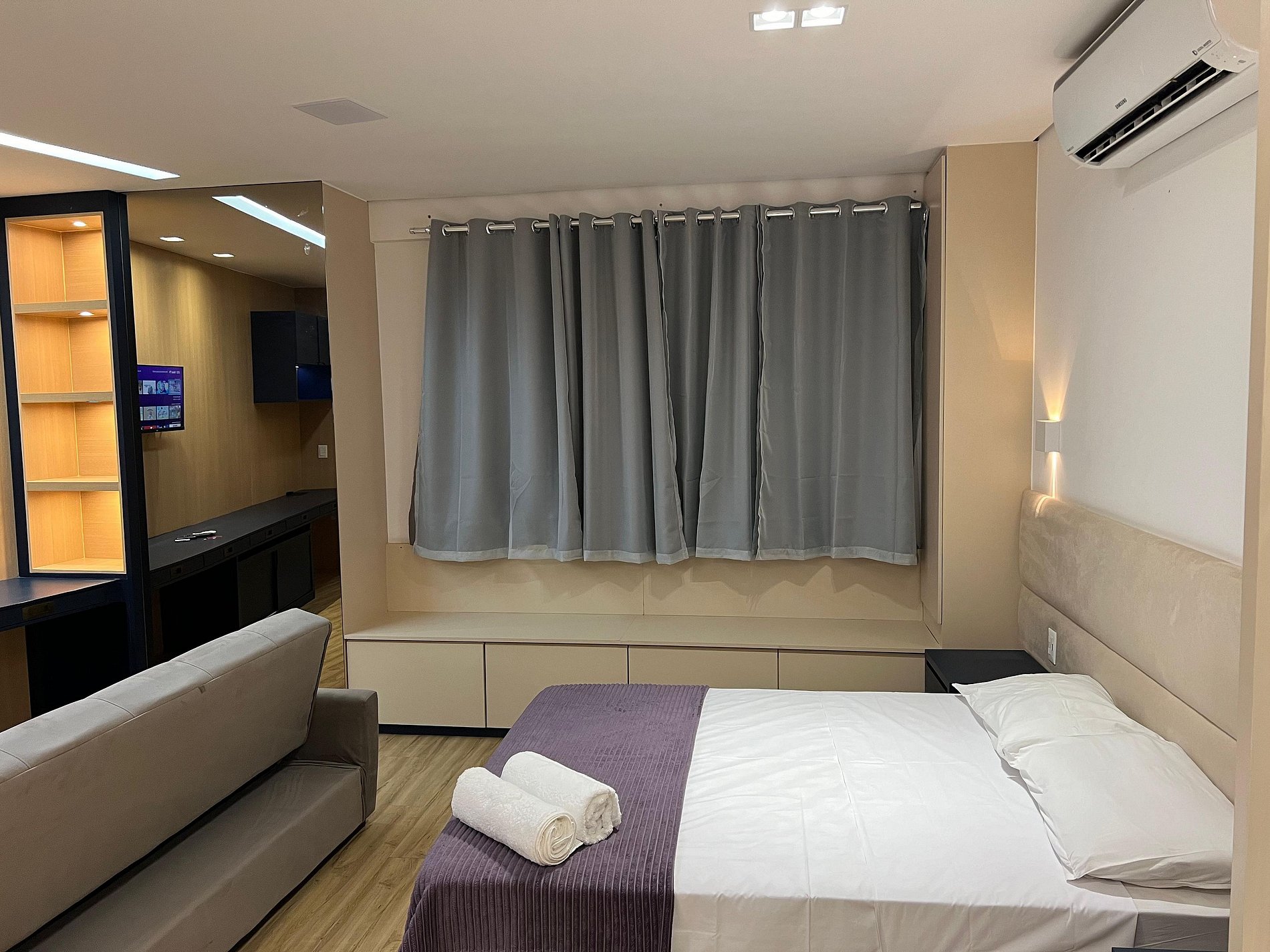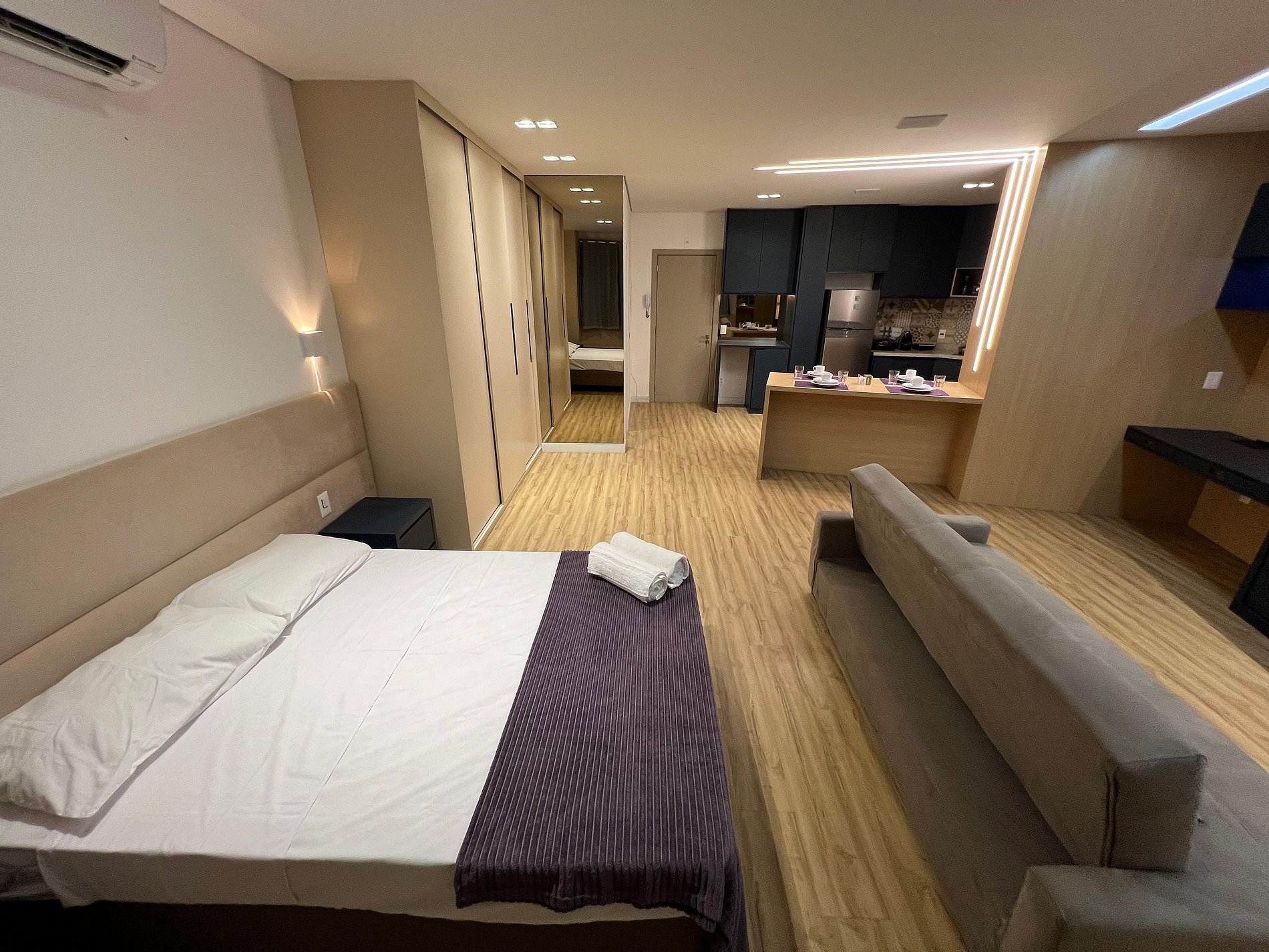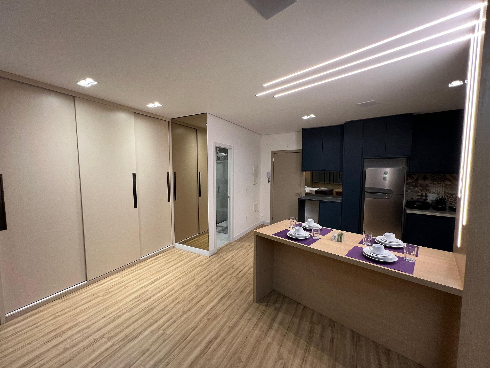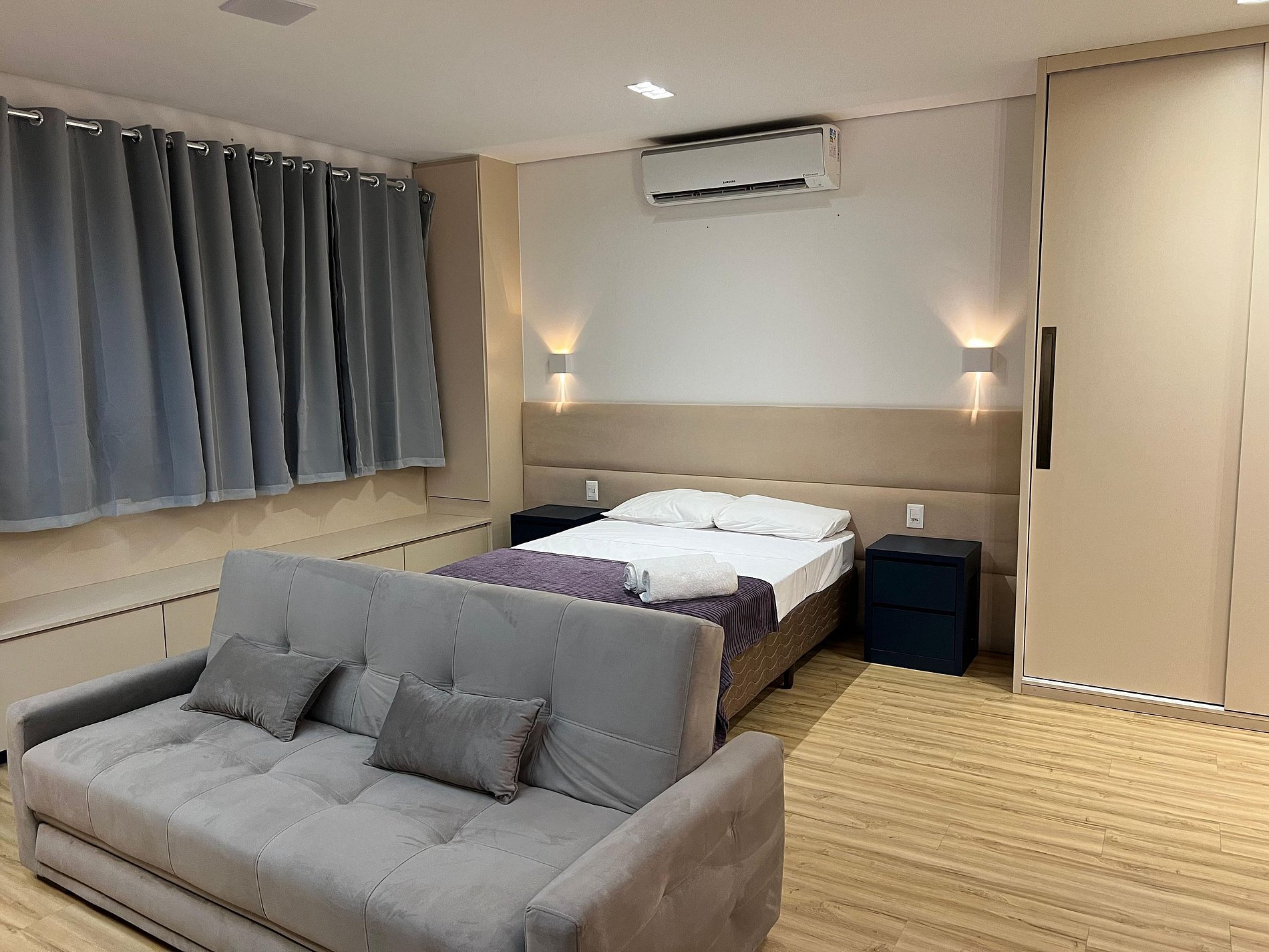 Possui uma camas de casal, um criado e armário com cabides e televisão. Oferece travesseiros, roupa de cama e banho, shampoo e sabonete. A cozinha americana conta com cooktop de quatro bocas, forno de Micro-ondas de 20L, sanduicheira inox grill, liquidificador, garrafa térmica com base de filtro para café e cafeteira elétrica, copos, taças, pratos rasos, pratos fundos, tigelas e talheres e xícaras. Esta disponível ferro e taboa de passar.