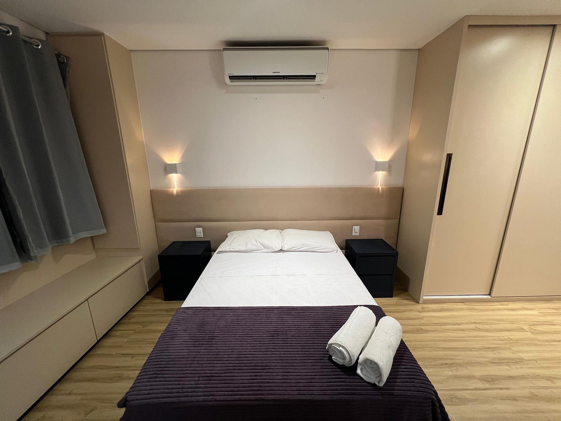 Possui uma camas de casal, um criado e armário com cabides e televisão. Oferece travesseiros, roupa de cama e banho, shampoo e sabonete. A cozinha americana conta com cooktop de quatro bocas, forno de Micro-ondas de 20L, sanduicheira inox grill, liquidificador, garrafa térmica com base de filtro para café e cafeteira elétrica, copos, taças, pratos rasos, pratos fundos, tigelas e talheres e xícaras. Esta disponível ferro e taboa de passar.