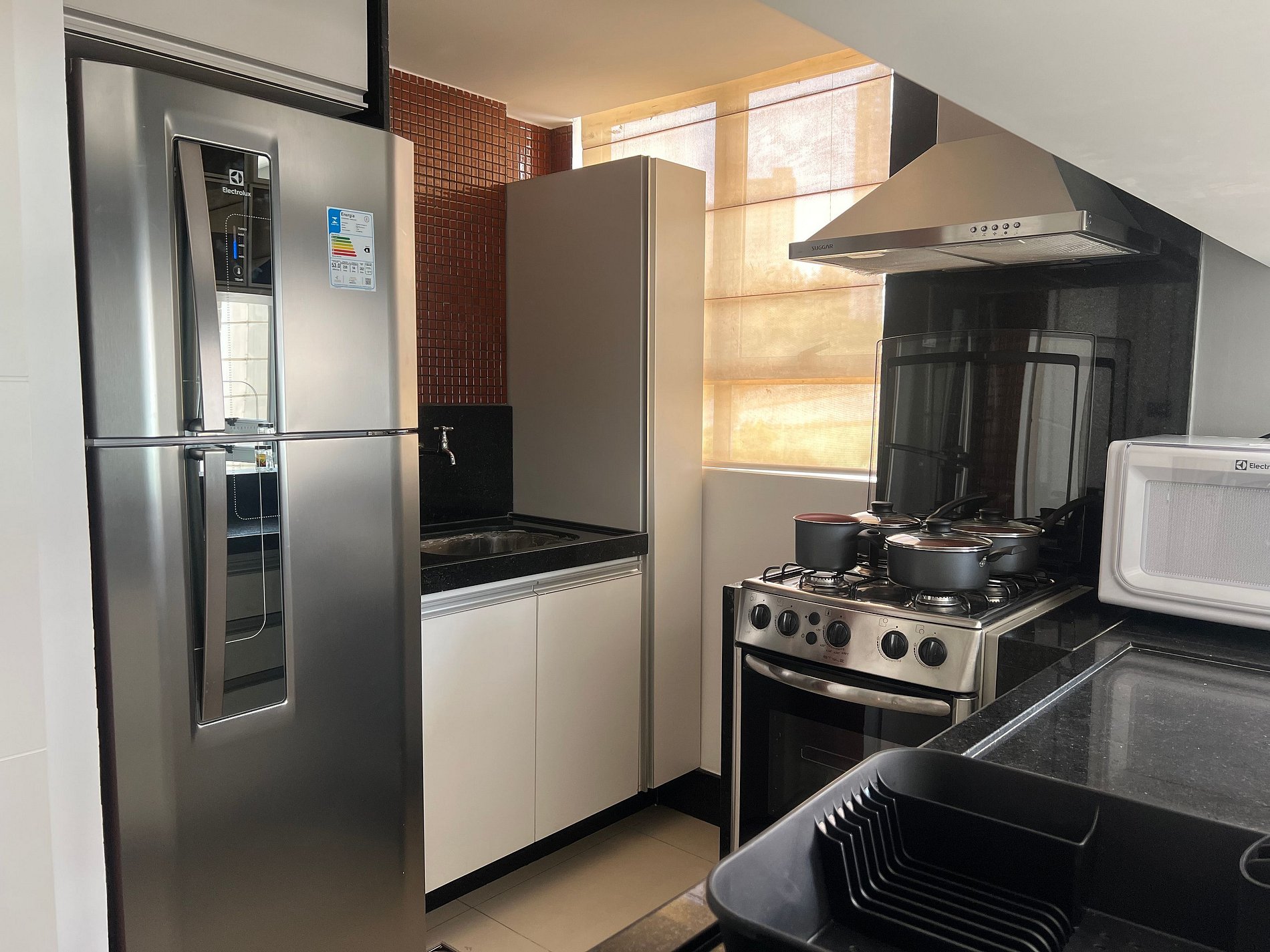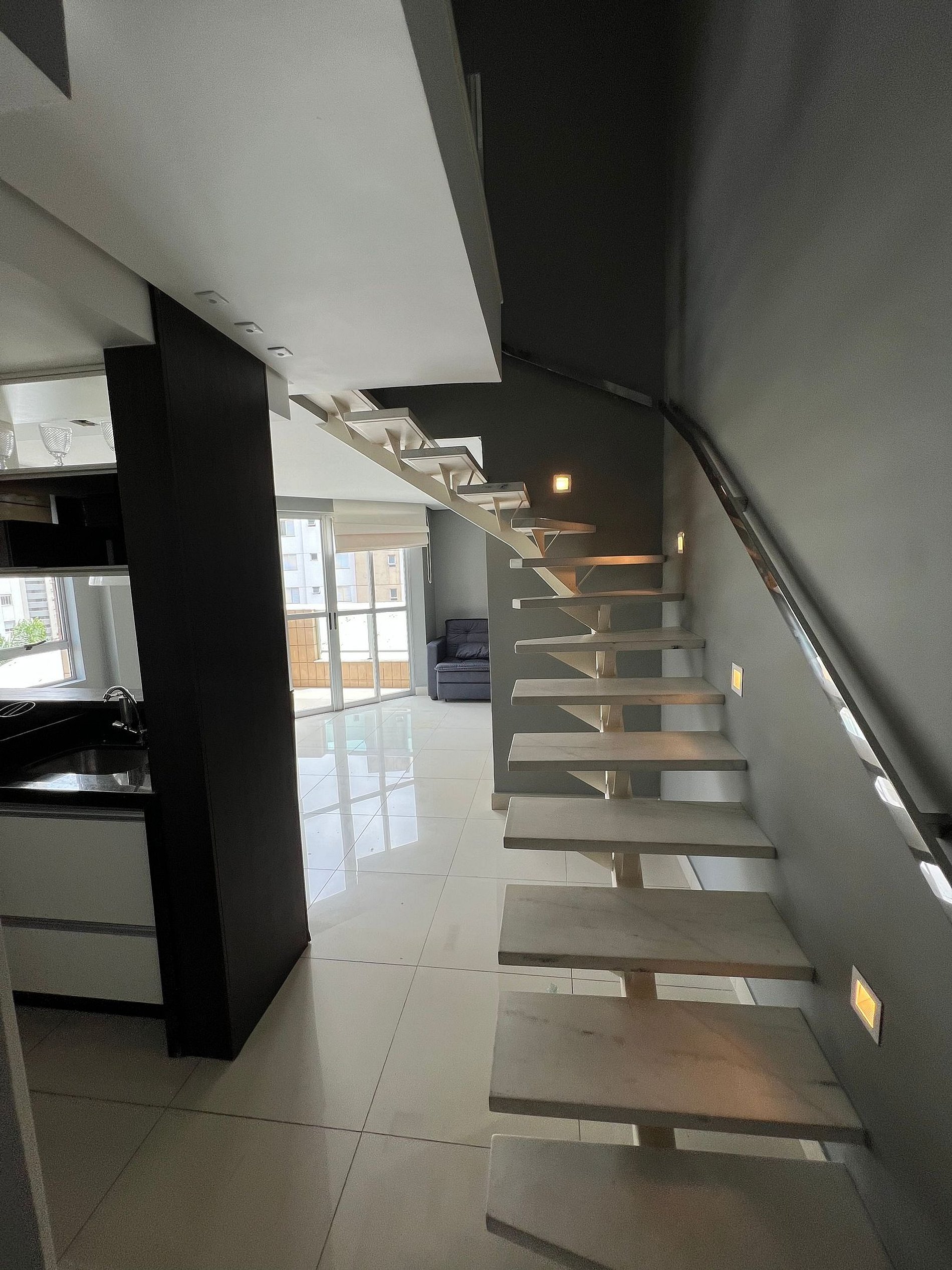 No primeiro nível do apartamento há uma sala com sofá cama de casal, um lavabo, cozinha americana e área de serviço. No segundo nível há uma segunda sala com camas de casal, um criado e varanda. No segundo nível também há uma suíte com uma cama de casal, criado, SmarTV de 32" e armários amplos. Oferece travesseiros, roupa de cama e banho, shampoo e sabonete. A cozinha americana conta com fogão de quatro bocas, geladeira Eletrolux 340 litros forno de Micro-ondas Eletrolux de 20L, sanduicheira inox grill, liquidificador, garrafa térmica com base de filtro para café e cafeteira elétrica, copos, taças, pratos rasos, pratos fundos, tigelas e talheres e xícaras. Esta disponível ferro e taboa de passar. Na sala também há um colchão de solteiro avulso.