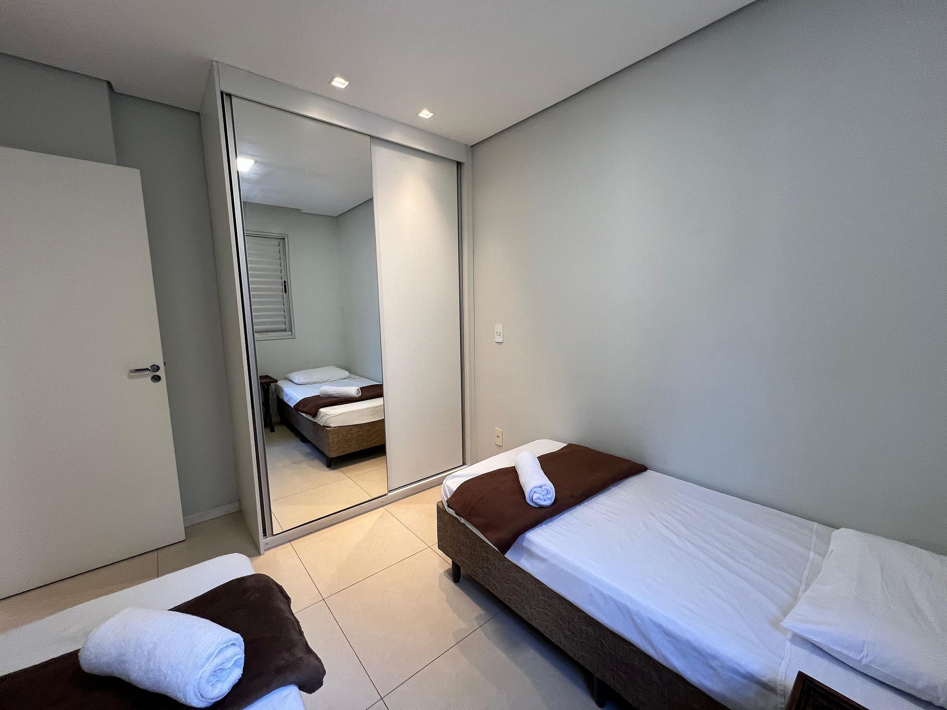Na suíte, você encontrará uma confortável cama box de casal, mesa de cabeceira e um armário com cabides — ideal para quem gosta de se organizar bem durante a estadia. O segundo quarto conta com duas camas de solteiro, mesa de apoio e uma prática estante em aramado cromado. Ambos os quartos e banheiros estão equipados com travesseiros, roupas de cama e toalhas para o seu conforto.