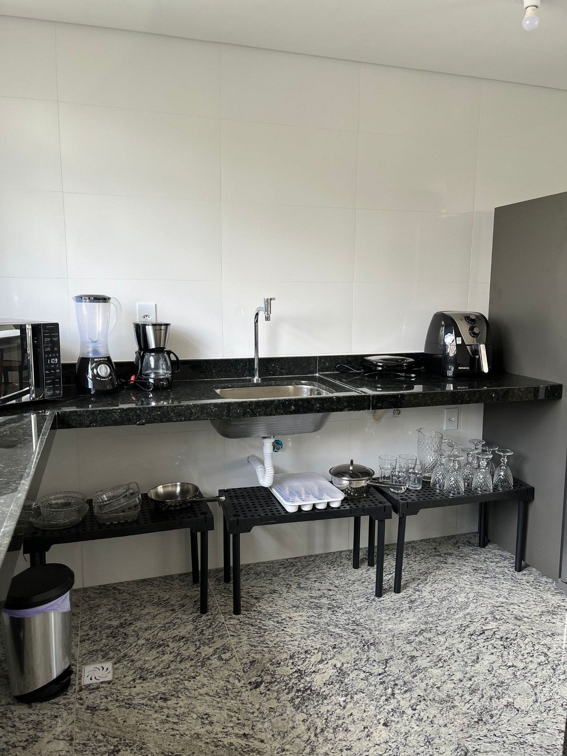 A sala de estar possui um ambiente com sala de televisão e uma estação de trabalho (uma mesa com cadeira). Conta ainda com sofá-cama, uma cama de solteiro e um lavabo. O outro ambiente é uma cozinha americana com armários, bancada com quatro outras cadeiras, e está equipada com geladeira, forno de Micro-ondas de 20L, cooktop de quatro bocas, sanduicheira inox grill, liquidificador, garrafa térmica com base de filtro para café e cafeteira elétrica. A cozinha possui também copos, taças, pratos rasos, pratos fundos, tigelas e talheres e xícaras para quatro pessoas. Está disponível ferro, tábua de passar e produtos de limpeza.