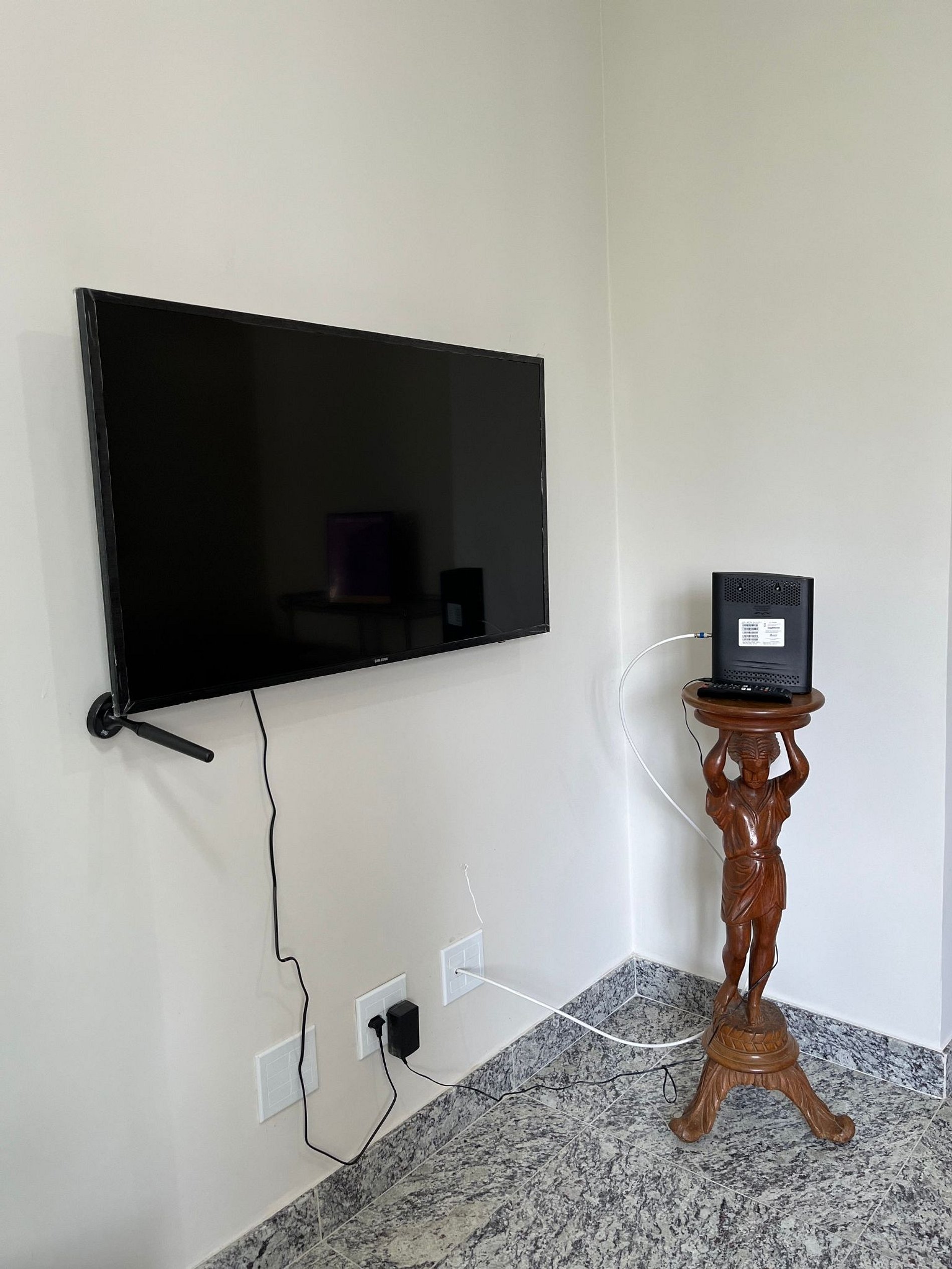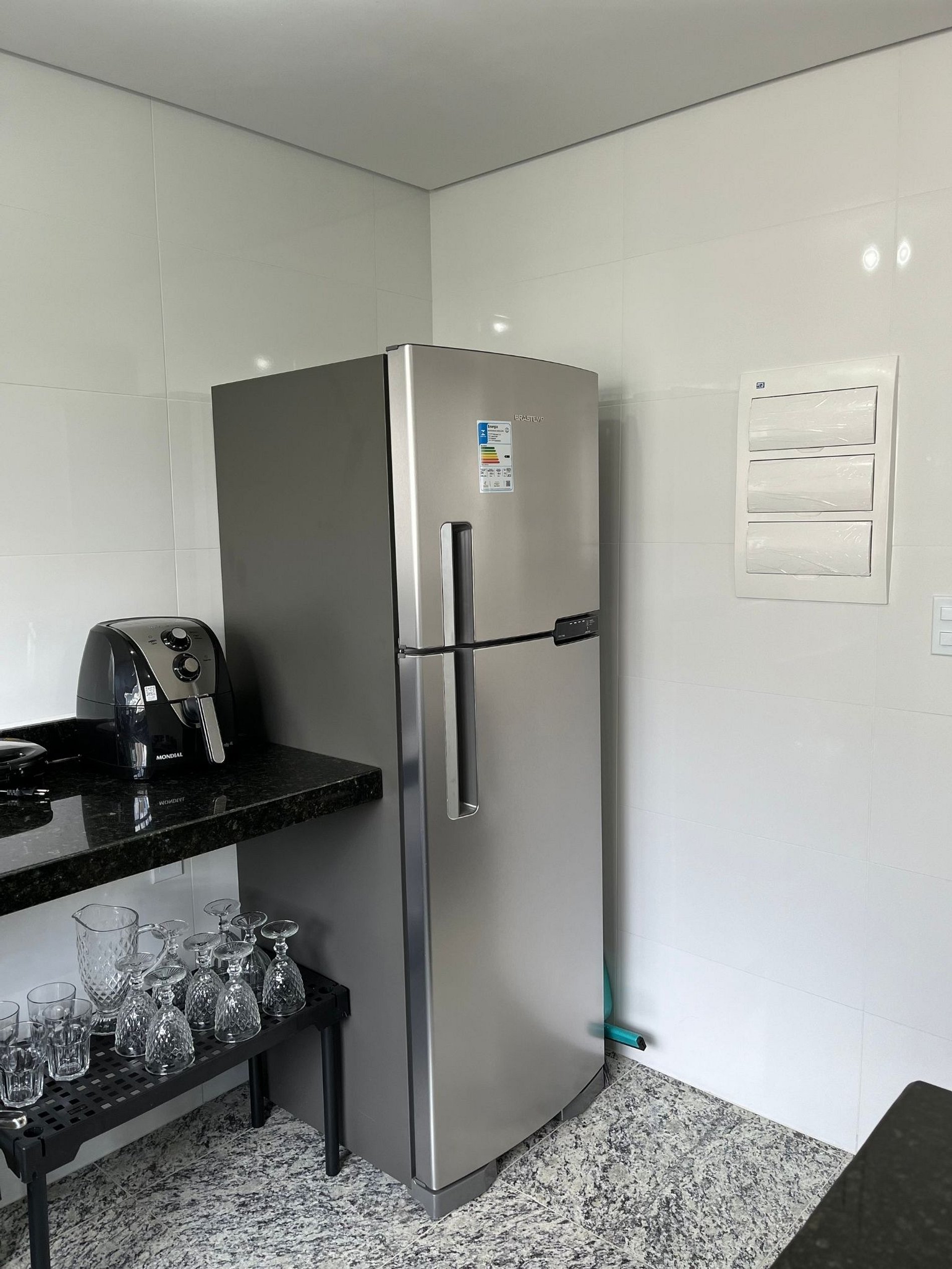 A sala de estar possui um ambiente com sala de televisão e uma estação de trabalho (uma mesa com cadeira). Conta ainda com sofá-cama, uma cama de solteiro e um lavabo. O outro ambiente é uma cozinha americana com armários, bancada com quatro outras cadeiras, e está equipada com geladeira, forno de Micro-ondas de 20L, cooktop de quatro bocas, sanduicheira inox grill, liquidificador, garrafa térmica com base de filtro para café e cafeteira elétrica. A cozinha possui também copos, taças, pratos rasos, pratos fundos, tigelas e talheres e xícaras para quatro pessoas. Está disponível ferro, tábua de passar e produtos de limpeza.