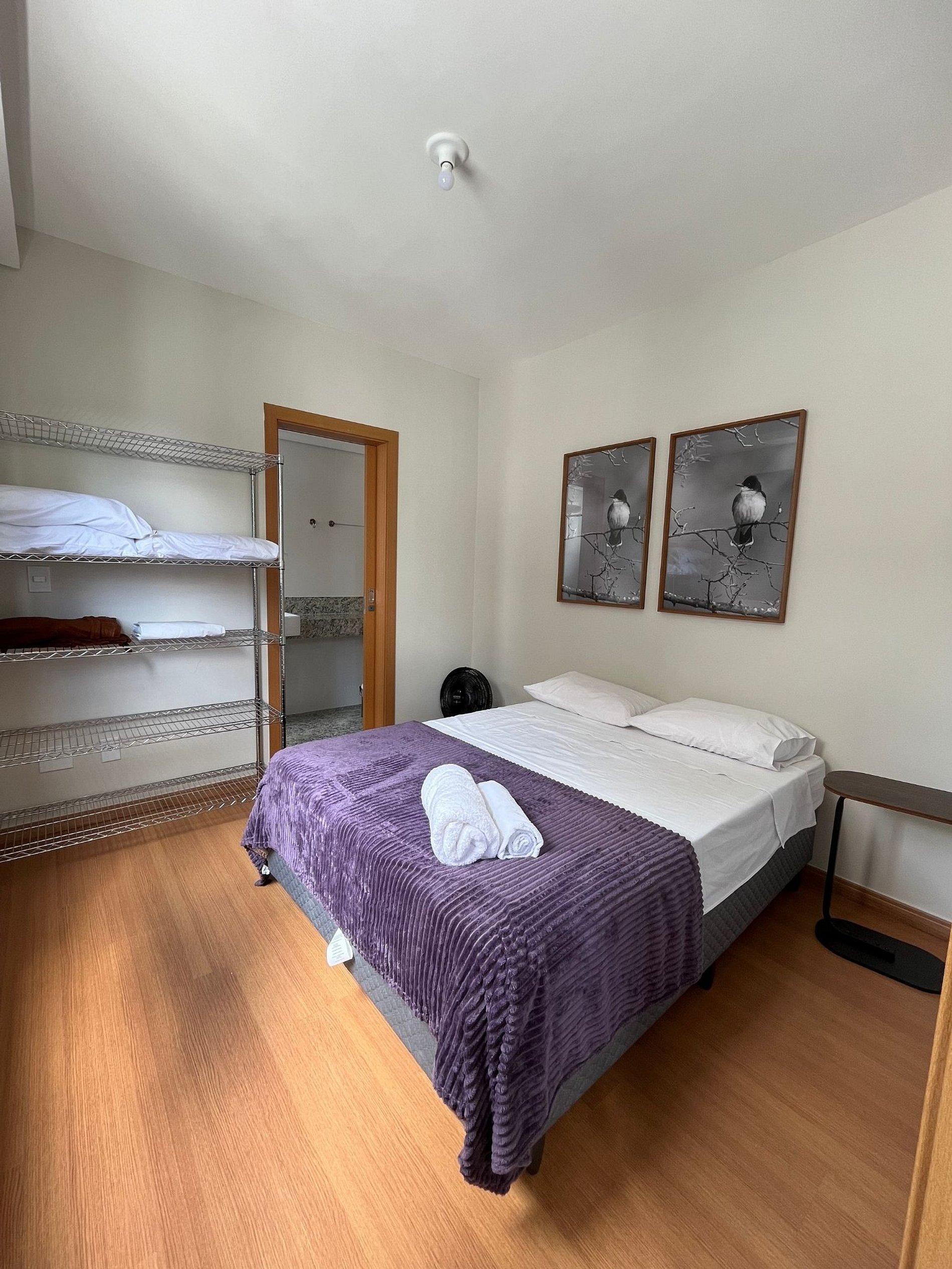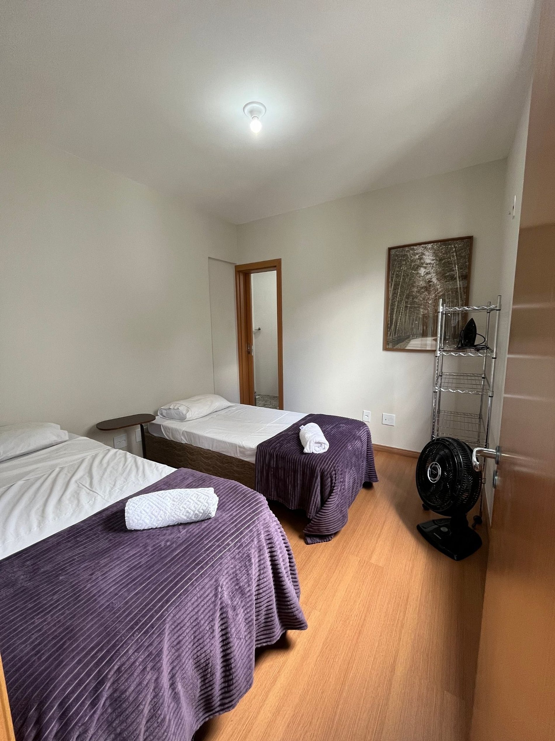 Duas suítes, sendo 01 com cama de casal e arara para roupas, e 01 com duas camas de solteiro e arara para roupas.