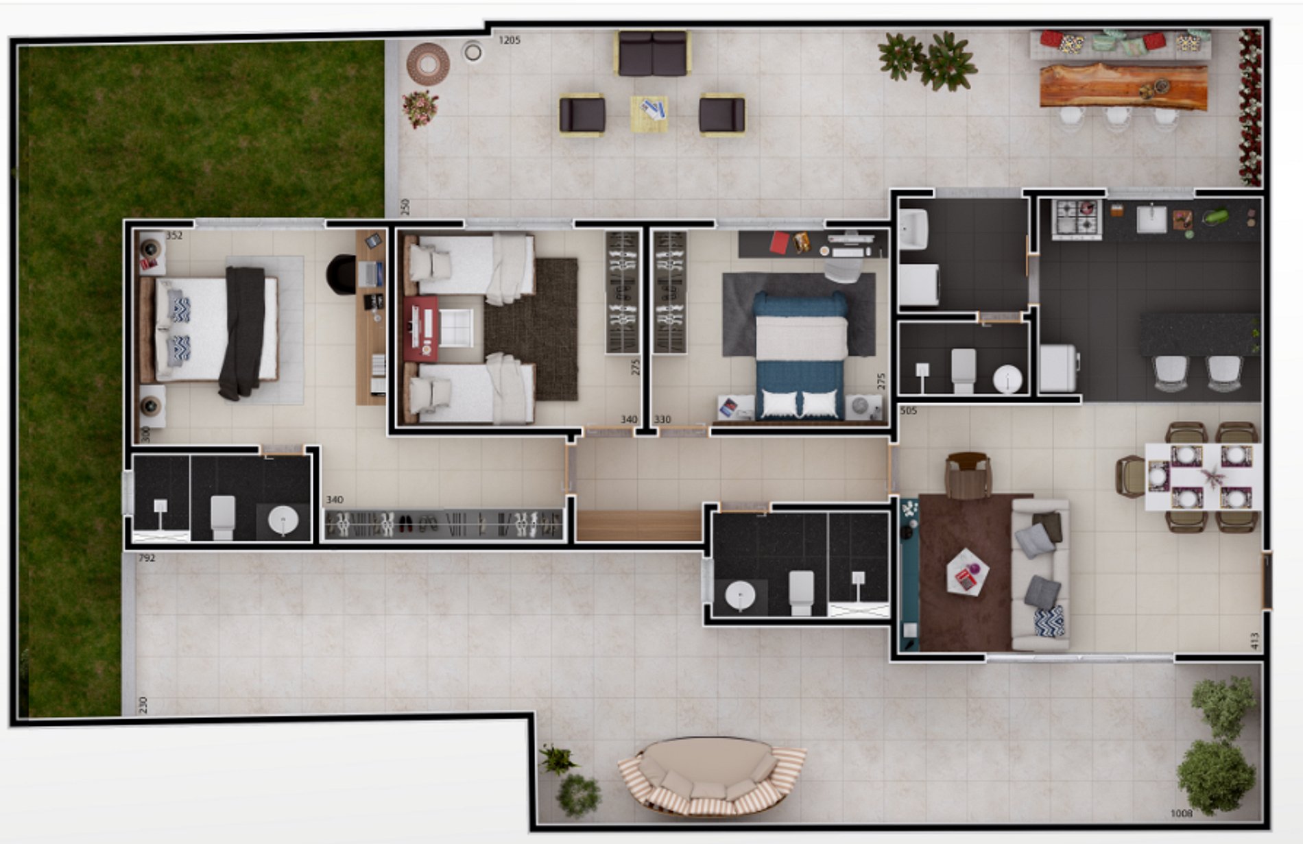 A suíte possui uma cama box de casal padrão com armário e cabides e uma cama de solteiro. O segundo e terceiro quartos possuem duas camas de solteiro cada, criado mudo e também armário com cabides. Os dois quartos são atendidos por um banheiro social. Todos os quartos e banheiros possuem travesseiros, roupa de cama e banho, shampoo e sabonete. A sala de estar possui um ambiente com uma estação de trabalho e uma mesa com quatro cadeiras, o outro ambiente conta com um sofá cama de casal, um rack em madeira e uma TV de 24”. A cozinha, com armários, está equipada com refrigerador de 240 L, forno de Micro-ondas de 20L, fogão de quatro bocas com acendimento automático, sanduicheira inox grill, liquidificador, garrafa térmica com base de filtro para café e cafeteira elétrica.A cozinha possui também um jogo de seis panelas (frigideira, leiteira e panela de pressão) taboa e faca de corte, escorredor de macarrão, marinex, assadeiras, copos, taças, pratos rasos, pratos fundos, tigelas e talheres e xícaras para seis pessoas, e utensílios básicos de cozinha (escumadeira, peneira, concha, fouet, abridor de garrafa, saca rolha, cortador de pizza, cortador de queijo, etc). A área de serviço possui um tanque de 20 litros, lavadora de roupas 8 kg turbo, taboa e ferro de passar, varal de chão, cesto para roupa suja, balde, vassoura, rodo e pá, aspirador de pó, além de produtos básicos de limpeza. O terraço possui uma bancada adicional à cozinha, mesa com ombrelone e seis cadeiras.