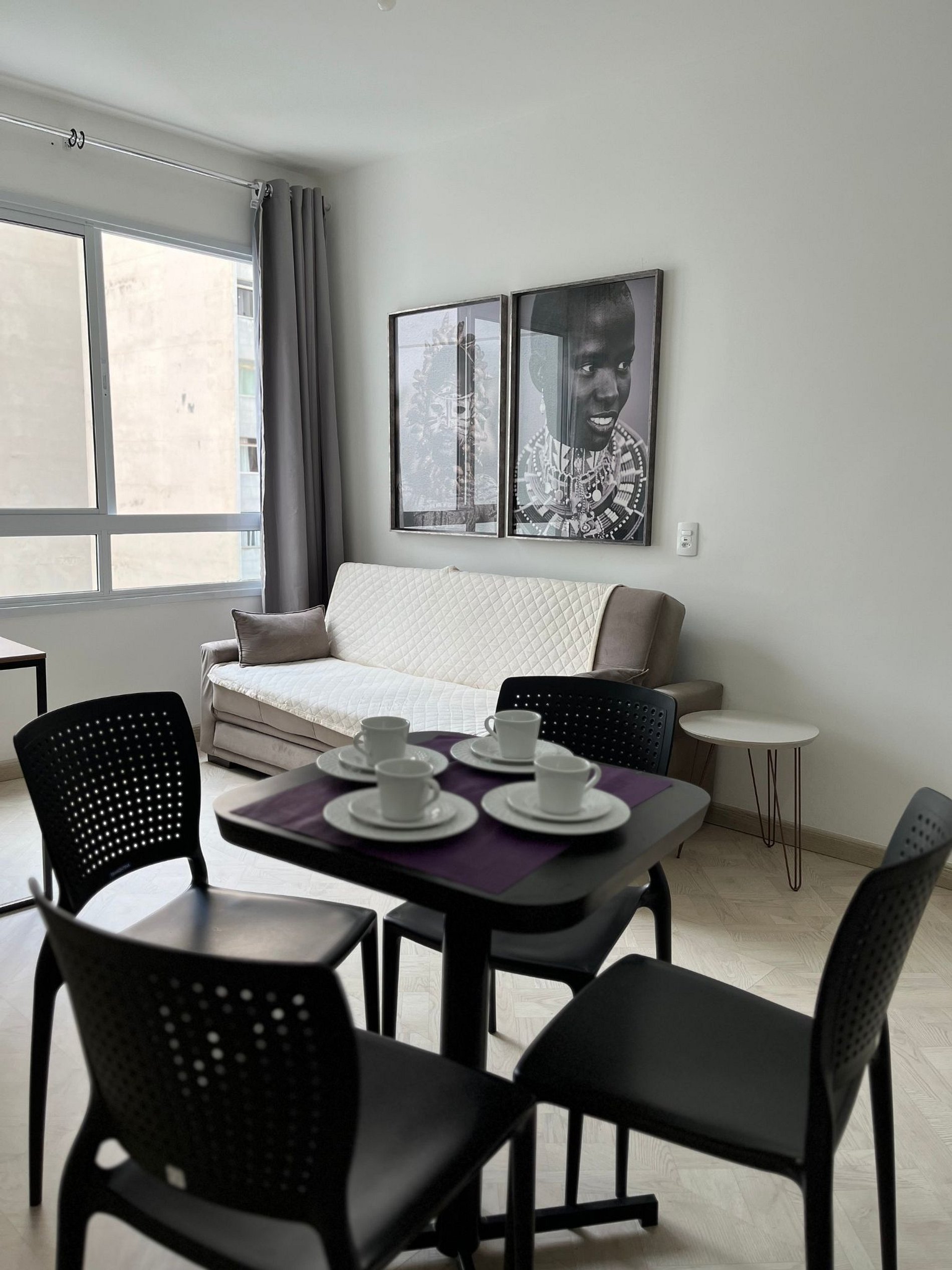 - Ambiente 1: mesa com 4 cadeiras (ideal para refeições ou trabalho), sofá confortável e TV de 43”.
