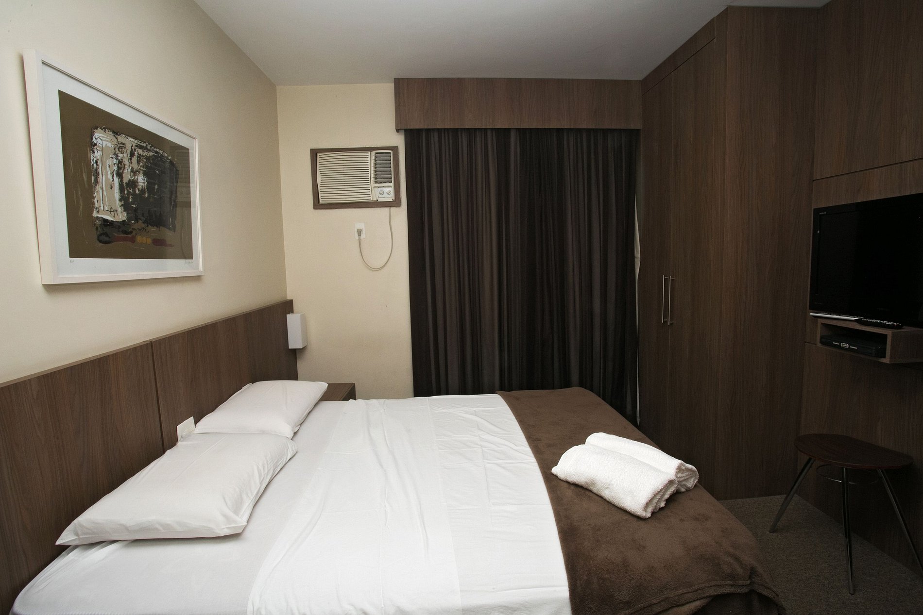 A suíte possui uma cama box queen, uma mesa de cabeceira com luminária e armário com cabides e televisão. O apartamento oferece travesseiros, roupa de cama e banho, shampoo e sabonete. A sala de estar possui um ambiente com uma estação de trabalho e uma mesa com duas cadeiras, um sofá-cama em tecido para duas pessoas. O outro ambiente é uma cozinha americana com armários, bancada com duas outras cadeiras, e está equipada com refrigerador tipo frigobar, forno de Micro-ondas de 20L, cooktop de duas bocas, sanduicheira inox grill, liquidificador, garrafa térmica com base de filtro para café e cafeteira elétrica. A cozinha possui também copos, taças, pratos rasos, pratos fundos, tigelas e talheres e xícaras. Estão disponíveis ferro, tábua de passar e produtos de limpeza.