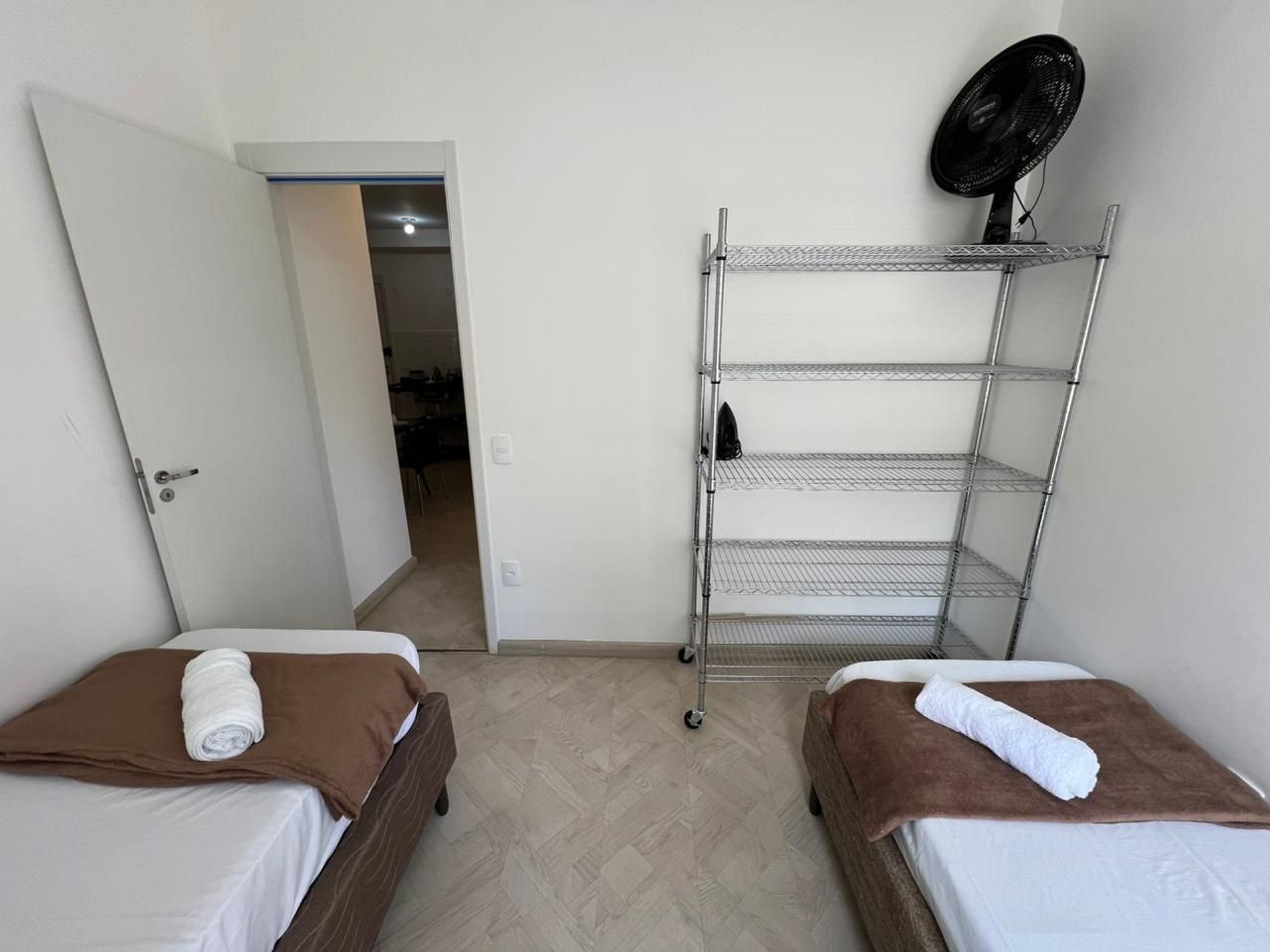 A suíte possui uma cama de casal, varanda, uma mesa de cabeceira e aramados com cabides. O segundo quarto conta com duas camas de solteiro. O apartamento oferece travesseiros, roupa de cama e banho, shampoo e sabonete. A sala de estar possui 02 ambientes, sendo um ambiente com uma uma mesa com quatro cadeiras para refeição e trabalho e um sofá com televisão 43". O outro ambiente é uma cozinha americana , e está equipada com refrigerador, fogão de indução, micro-ondas de 20L, sanduicheira inox grill, liquidificador, garrafa térmica com base de filtro para café e cafeteira elétrica . Máquina de lavar e produtos de limpeza à disposição. A cozinha possui também copos, taças, pratos rasos, pratos fundos, tigelas e talheres e xícaras para quatro pessoas. Esta disponível ferro e tábua de passar.