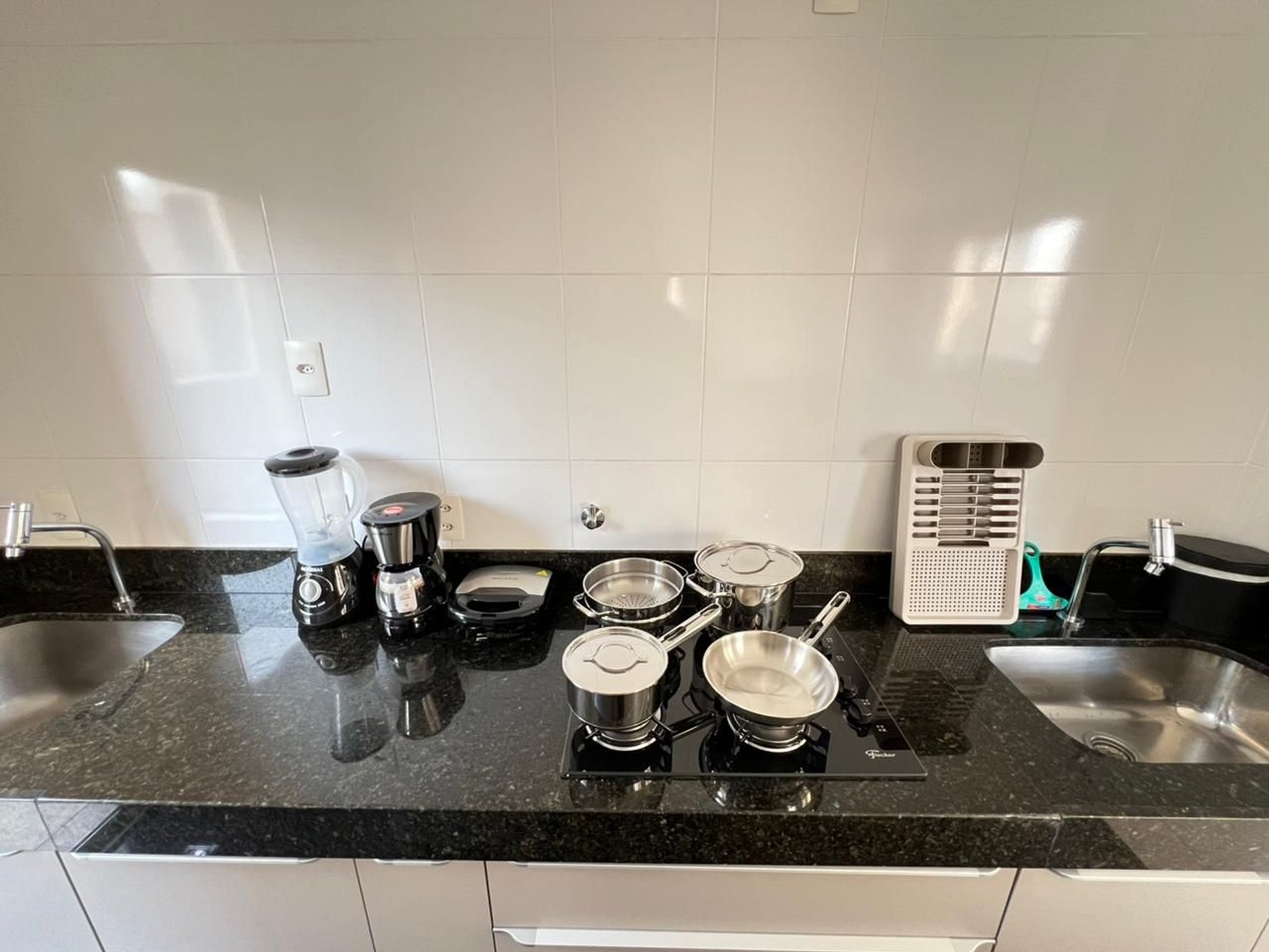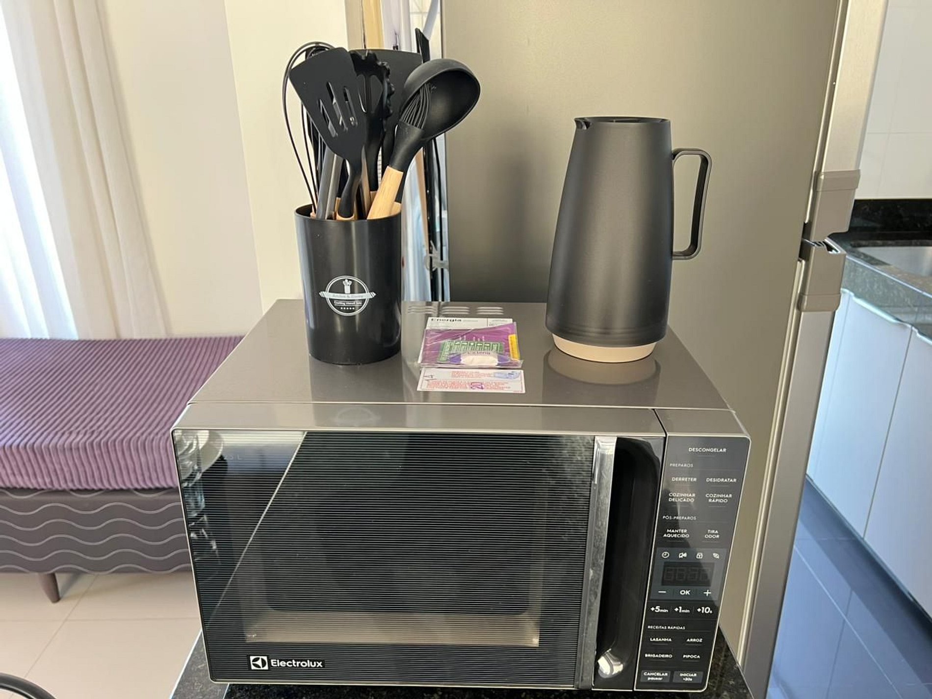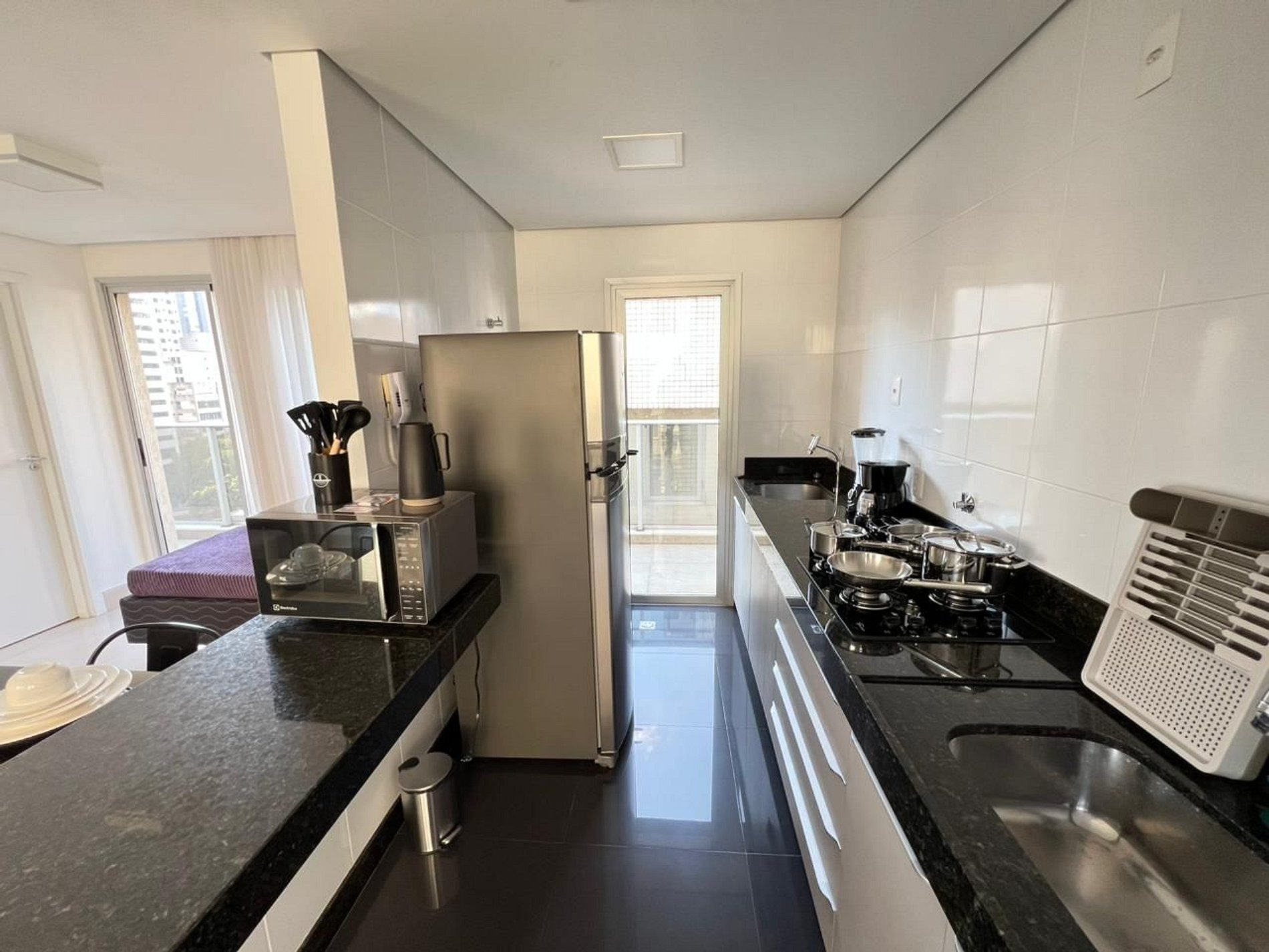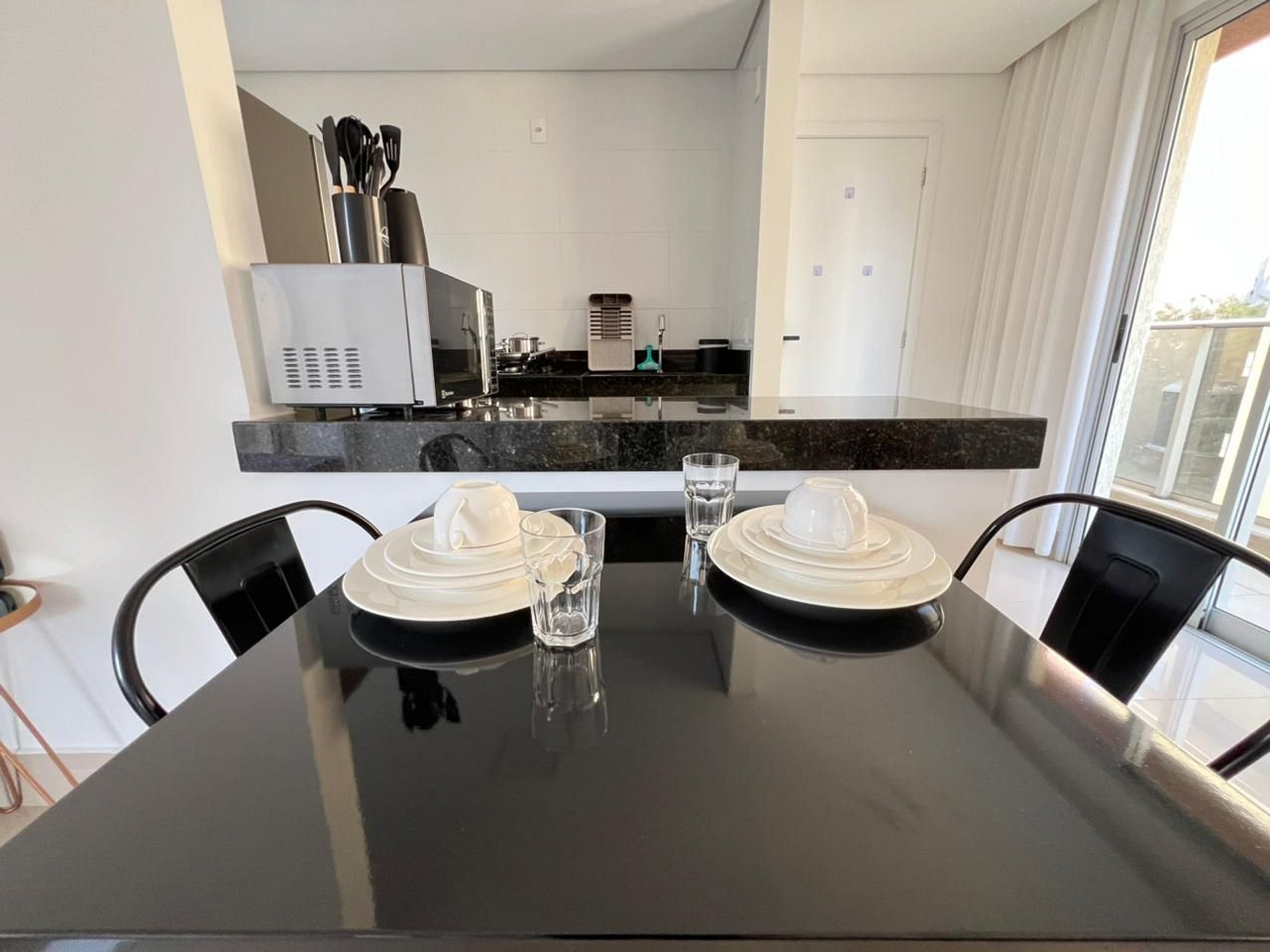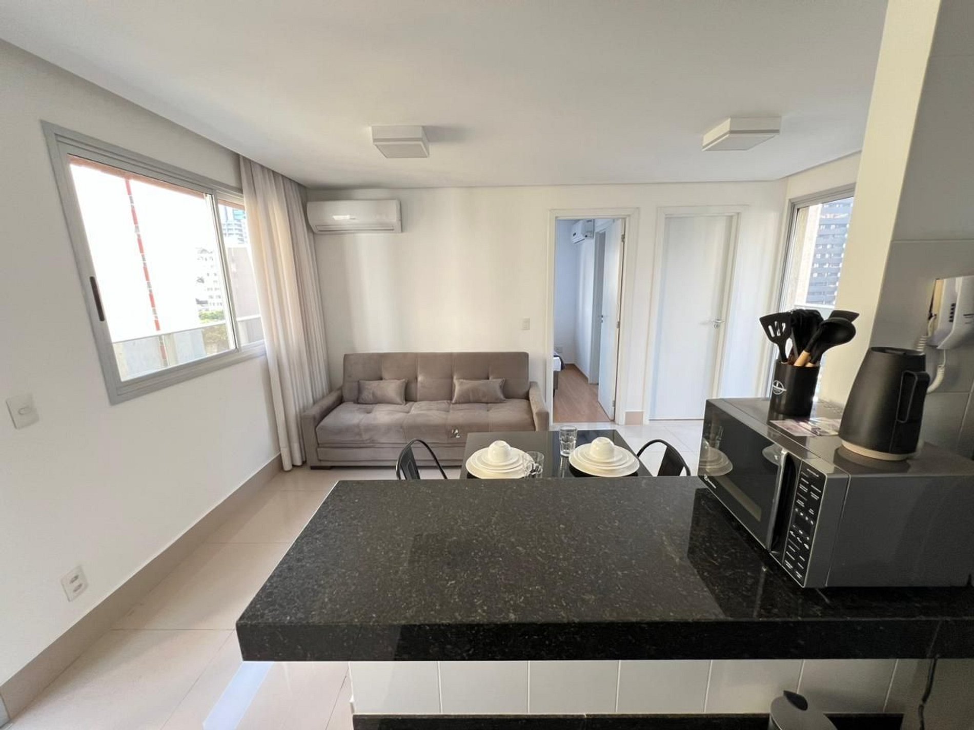 A suíte possui uma cama de casal, com armário grandee espaçoso. A sala de estar conta com varanda com vista e possui um ambiente de jantar com uma mesa com quatro cadeiras. O mesmo ambiente ainda conta com um sofá retrátil em tecido para duas pessoas, um rack em madeira e uma TV smart de 43”, além de uma cama de casal adicional. A cozinha americana, com armários, está equipada com refrigerador de 320 L, forno de micro-ondas de 32L, cooktop de quatro bocas com acendimento automático, sanduicheira inox grill, liquidificador, garrafa térmica com base de filtro para café e cafeteira elétrica. A cozinha possui também um jogo de seis panelas (frigideira, leiteira e panela de pressão) taboa e faca de corte, escorredor de macarrão, marinex, assadeiras, copos, taças, pratos rasos, pratos fundos, tigelas e talheres e xícaras para seis pessoas, e utensílios básicos de cozinha (escumadeira, peneira, concha, fouet, abridor de garrafa, saca rolha, cortador de pizza, cortador de queijo, etc). A área de serviço possui tábua e ferro de passar , balde, vassoura, rodo e pá, aspirador de pó além de produtos básicos de limpeza.