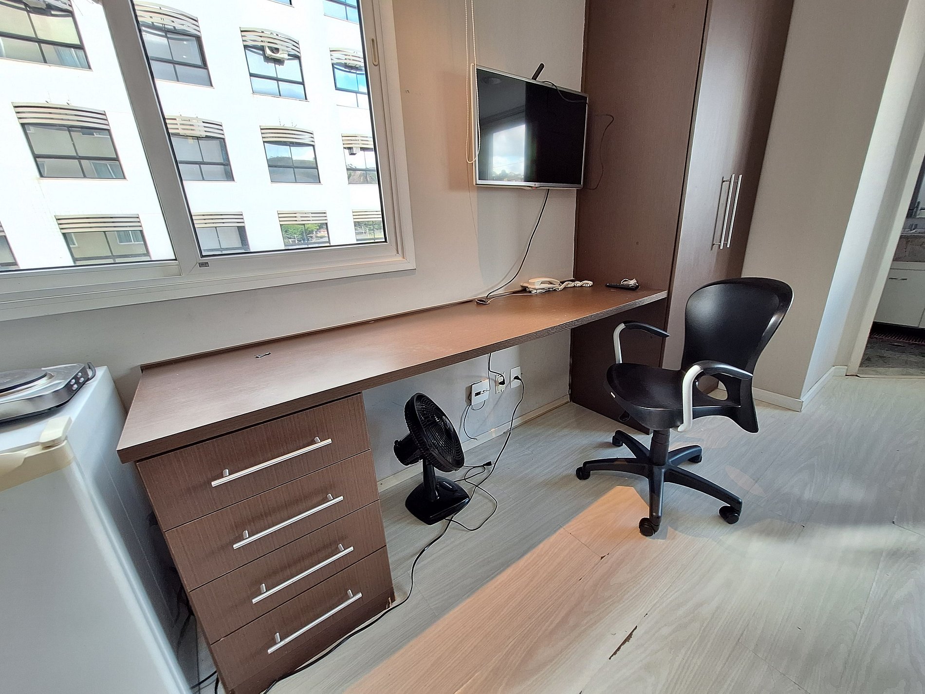 - Ambiente 1: Sala - Estação Home Office, mesa com 4 cadeiras (ideal para refeições ou trabalho), sofá confortável e TV de 32”.