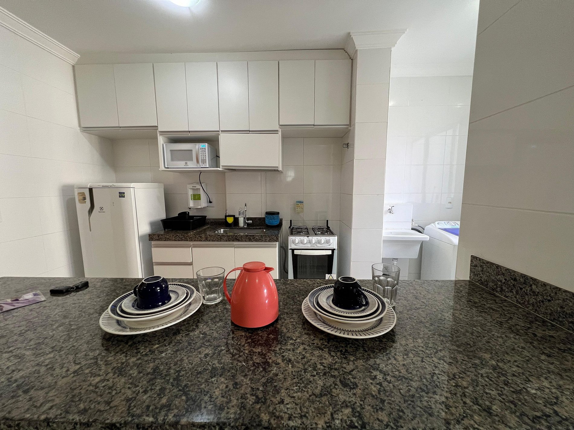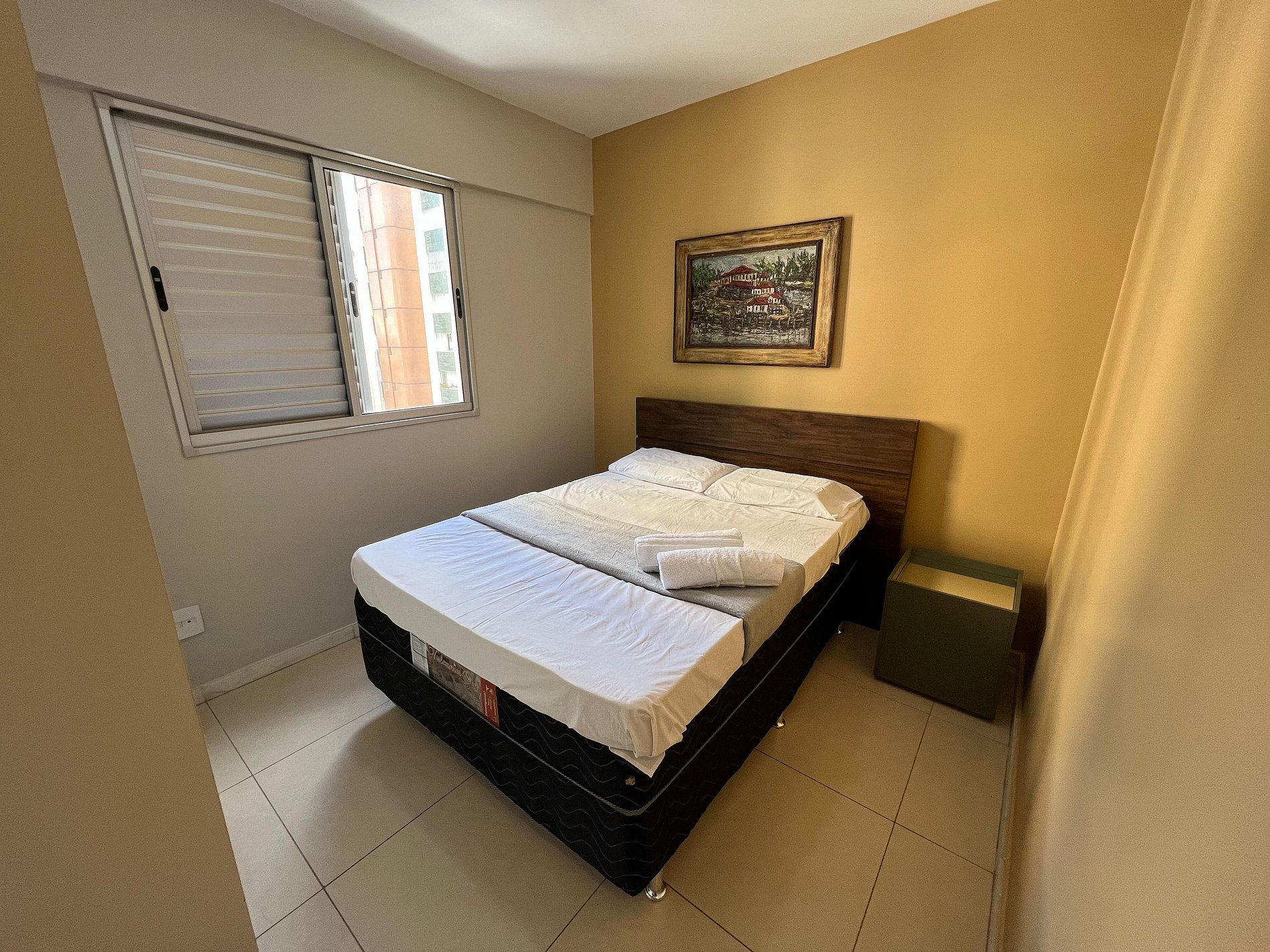A suíte possui uma cama box de casal padrão, um criado mudo e armário com cabides. O outro quarto possui cama box de casal, criado mudo e uma estande em aramado cromado com cabides. Os quartos e banheiros possuem travesseiros, roupa de cama e banho. Além de portas mais largas, como em todas as portas do apartamento. O banheiro possui piso antiderrapante, barras de apoio, bancadas e interruptores mais baixos. A sala de estar possui um ambiente com uma estação de trabalho, o outro ambiente conta com um sofá em couríssimo para duas pessoas, uma smart TV de 24” já conectada ao Wi-Fi do apartamento (acesso ao NETFLIX e aos canais abertos). A varanda possuir uma mesa com quatro cadeiras. A cozinha, com armários, está equipada com Refrigerador de 240 L, forno de Micro-ondas de 20L, fogão de quatro bocas com acendimento automático, sanduicheira inox grill, liquidificador, garrafa térmica com base de filtro para café e filtro de água. Além de um jogo de quatro panelas, taboa e faca de corte, escorredor de macarrão, copos, pratos e talheres e xícaras para seis pessoas, e utensílios básicos de cozinha. A área de serviço possui um tanque de 20 litros, lavadora de roupas 8 kg turbo, taboa e ferro de passar, varal de chão, cesto para roupa suja, balde, vassoura, rodo e pá, além de produtos básicos de limpeza.