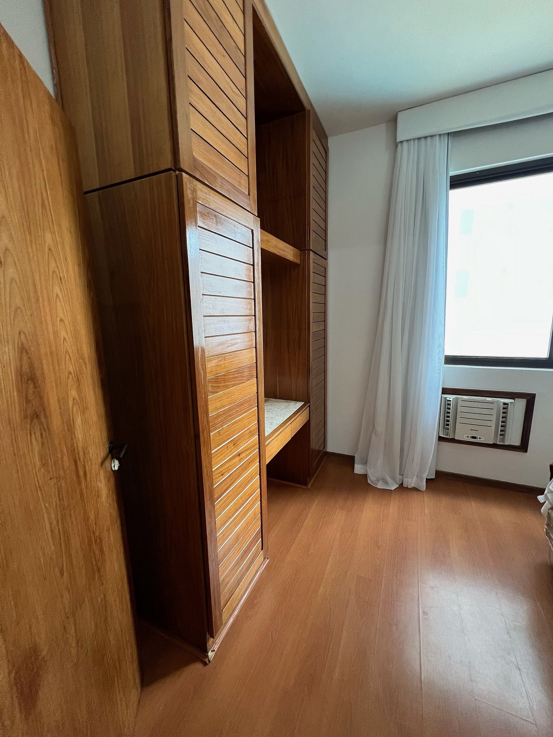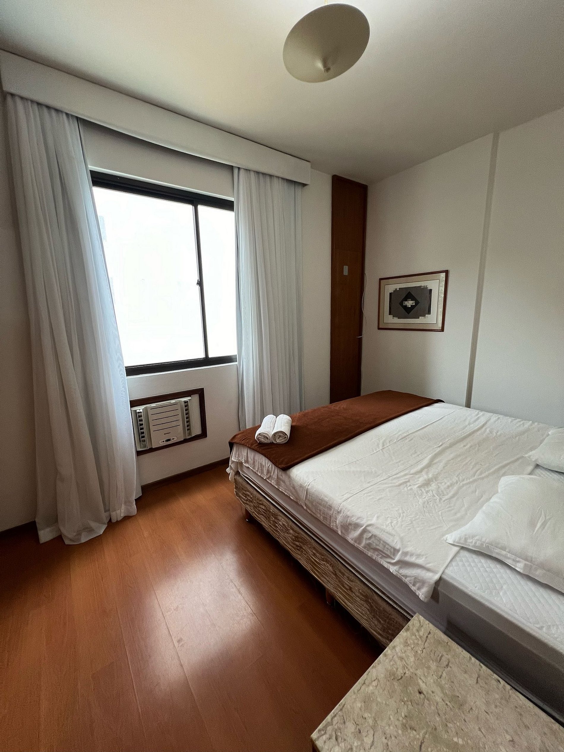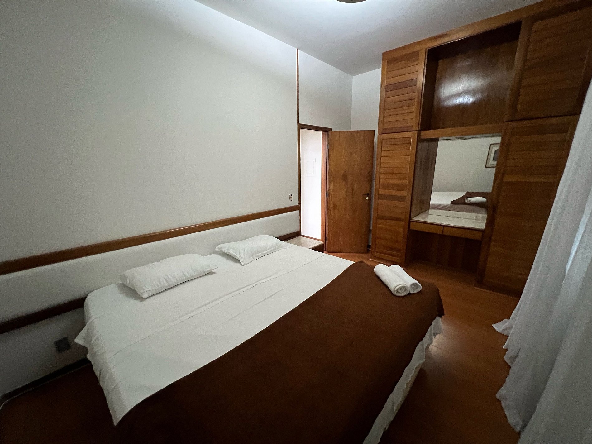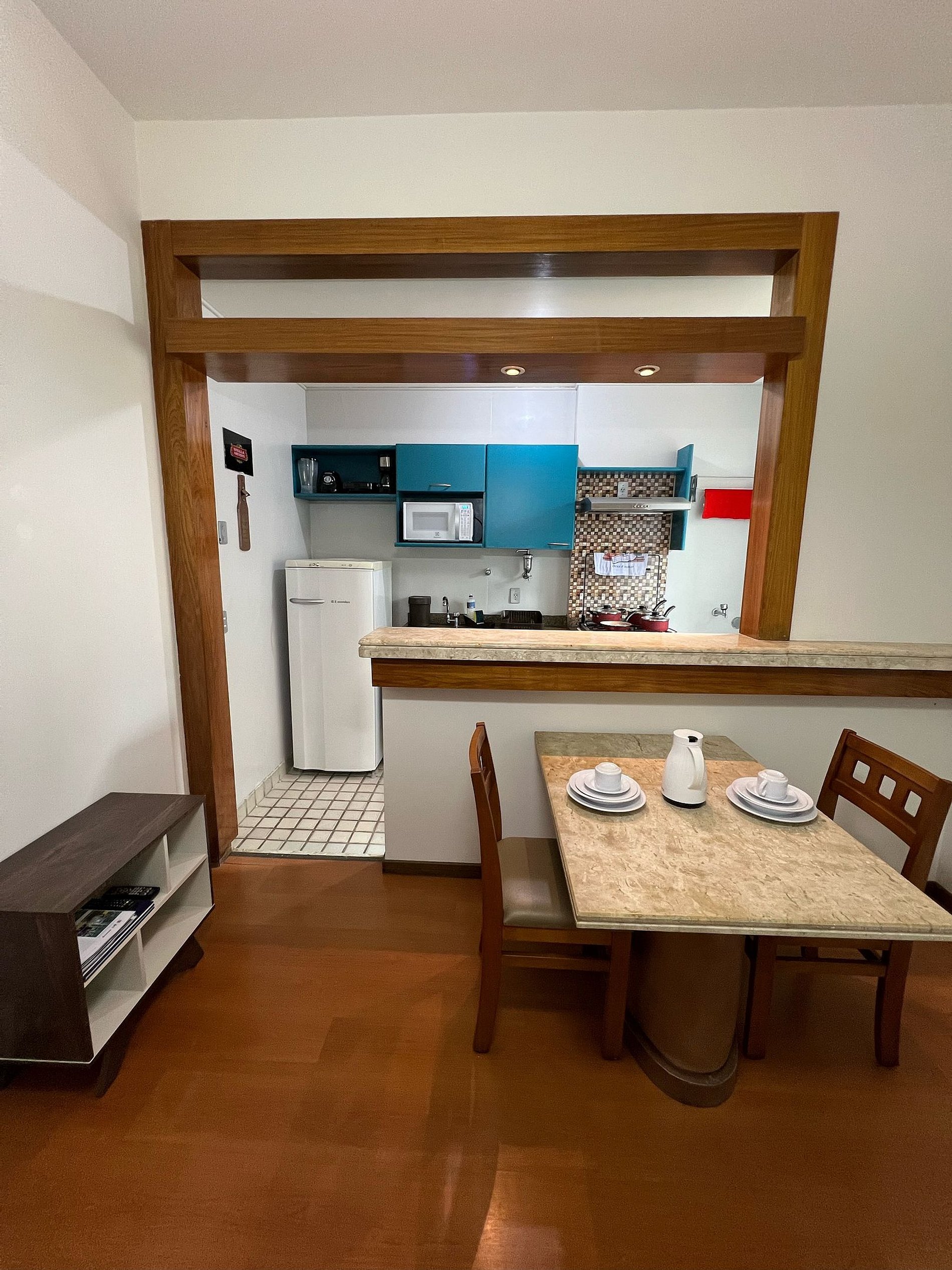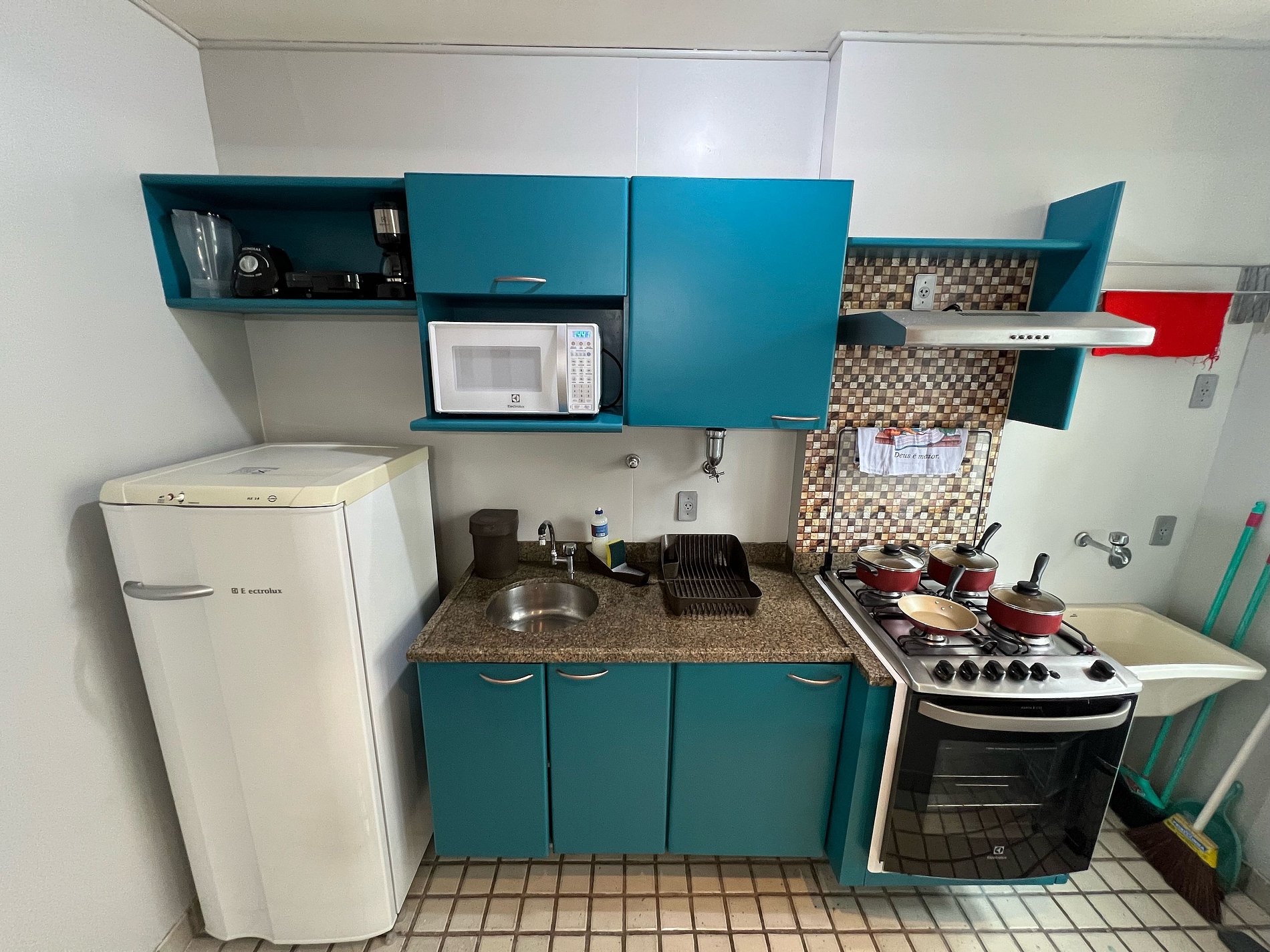 O quarto possui uma cama queen, uma mesa de cabeceira e armário com cabides e televisão. O apartamento oferece travesseiros, roupa de cama e banho, shampoo e sabonete. A sala de estar possui um ambiente com uma uma mesa com duas cadeiras para refeição e trabalho e um sofá com televisão 43". O outro ambiente é uma cozinha americana com armários, e está equipada com refrigerador fogão quatro bocas com forno, micro-ondas de 20L, sanduicheira inox grill, liquidificador, garrafa térmica com base de filtro para café e cafeteira elétrica .A cozinha possui também copos, taças, pratos rasos, pratos fundos, tigelas e talheres e xícaras. Esta disponível ferro e taboa de passar.