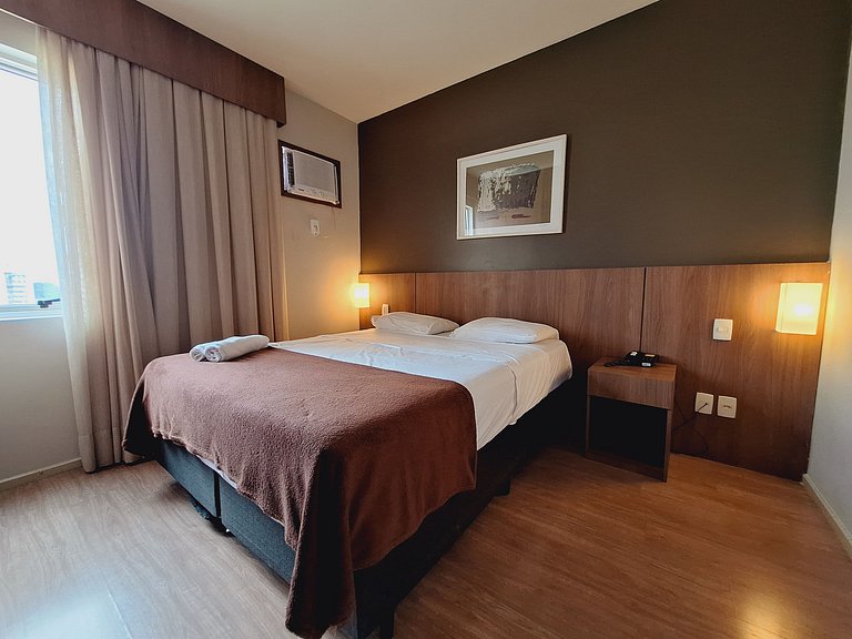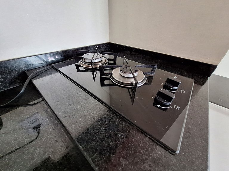 A suíte possui uma cama box de casal padrão, uma mesa de cabeceira com luminária e armário com cabides e televisão. O apartamento oferece travesseiros, roupa de cama e banho, shampoo e sabonete. A sala de estar possui um ambiente com uma estação de trabalho e uma mesa com duas cadeiras, um sofá-cama em tecido para duas pessoas. O outro ambiente é uma cozinha americana com armários, bancada com duas outras cadeiras, e está equipada com refrigerador tipo frigobar, forno de Micro-ondas de 20L, cooktop de duas bocas, sanduicheira inox grill, liquidificador, garrafa térmica com base de filtro para café e cafeteira elétrica. A cozinha possui também copos, taças, pratos rasos, pratos fundos, tigelas e talheres e xícaras. Estão disponíveis ferro, tábua de passar e produtos de limpeza.