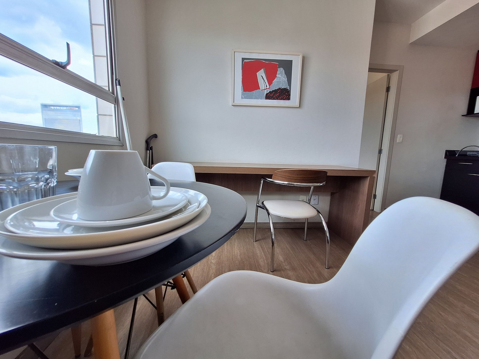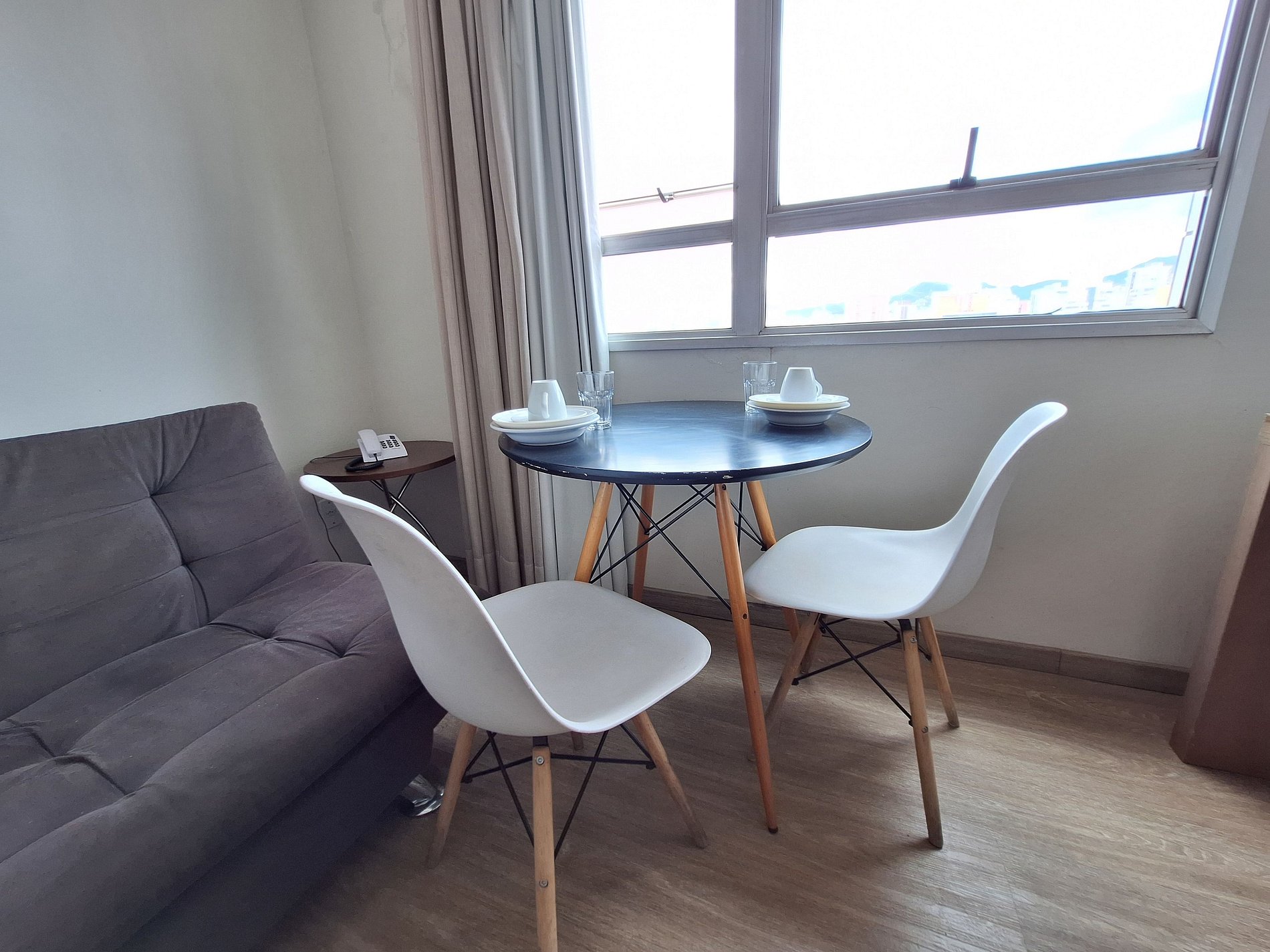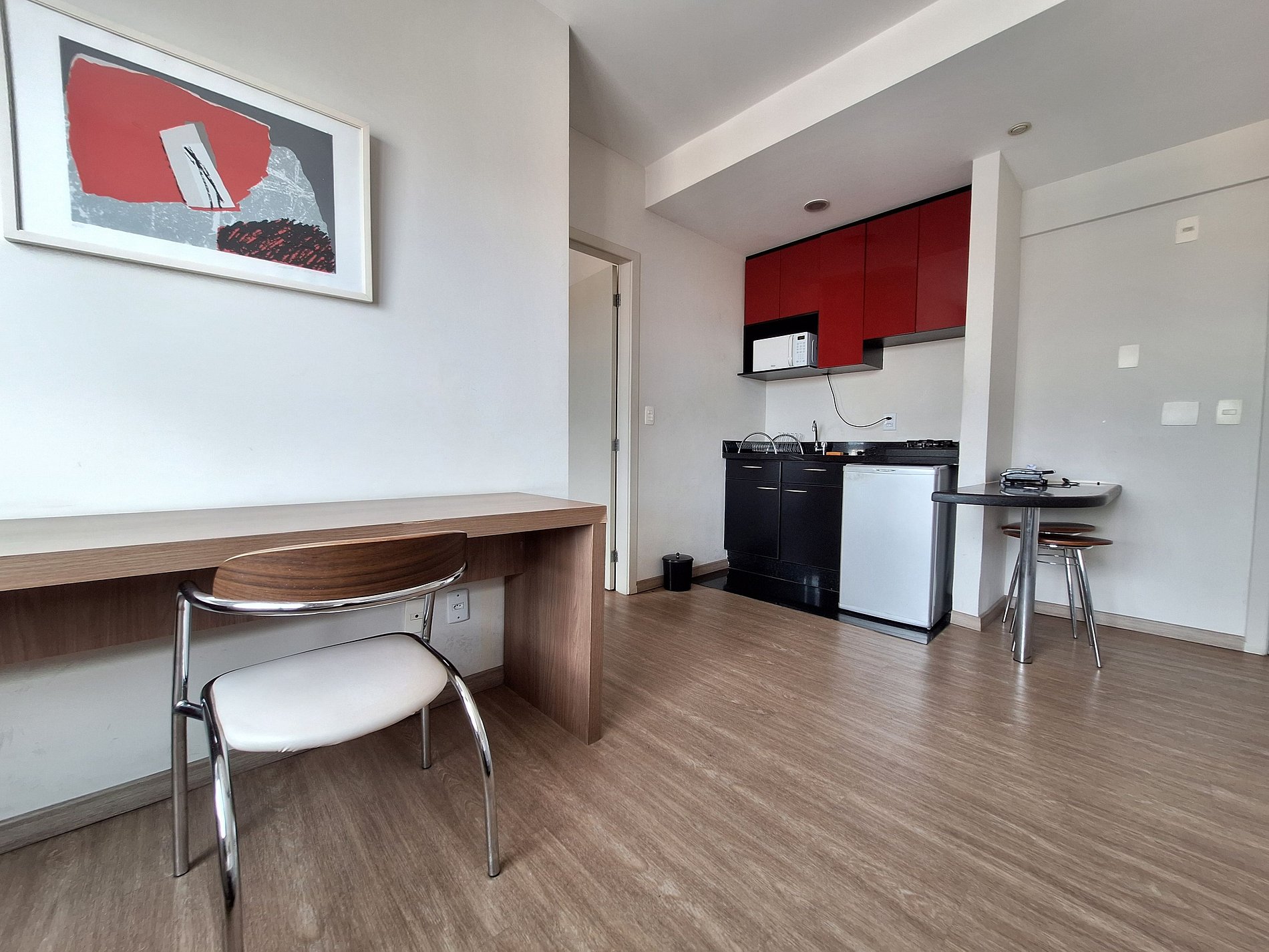 A suíte possui uma cama box de casal padrão, uma mesa de cabeceira com luminária e armário com cabides e televisão. O apartamento oferece travesseiros, roupa de cama e banho, shampoo e sabonete. A sala de estar possui um ambiente com uma estação de trabalho e uma mesa com duas cadeiras, um sofá-cama em tecido para duas pessoas. O outro ambiente é uma cozinha americana com armários, bancada com duas outras cadeiras, e está equipada com refrigerador tipo frigobar, forno de Micro-ondas de 20L, cooktop de duas bocas, sanduicheira inox grill, liquidificador, garrafa térmica com base de filtro para café e cafeteira elétrica. A cozinha possui também copos, taças, pratos rasos, pratos fundos, tigelas e talheres e xícaras. Estão disponíveis ferro, tábua de passar e produtos de limpeza.