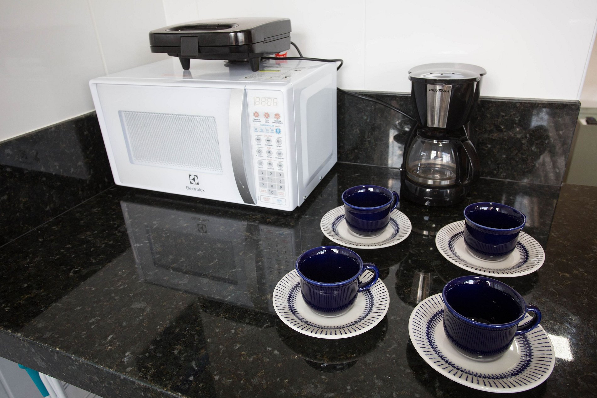 Possui no quarto uma camas de casal, um criado e aramado com cabides. Na sala sofá-cama casal com smartv de 32". Oferece travesseiros, roupa de cama e banho, shampoo e sabonete. Na cozinha americana um cooktop de uma boca, forno de Micro-ondas Eletrolux de 20L, sanduicheira inox grill, liquidificador, garrafa térmica com base de filtro para café e cafeteira elétrica, copos, taças, pratos rasos, pratos fundos, tigelas e talheres e xícaras para seis pessoas. Esta disponível ferro e taboa de passar.