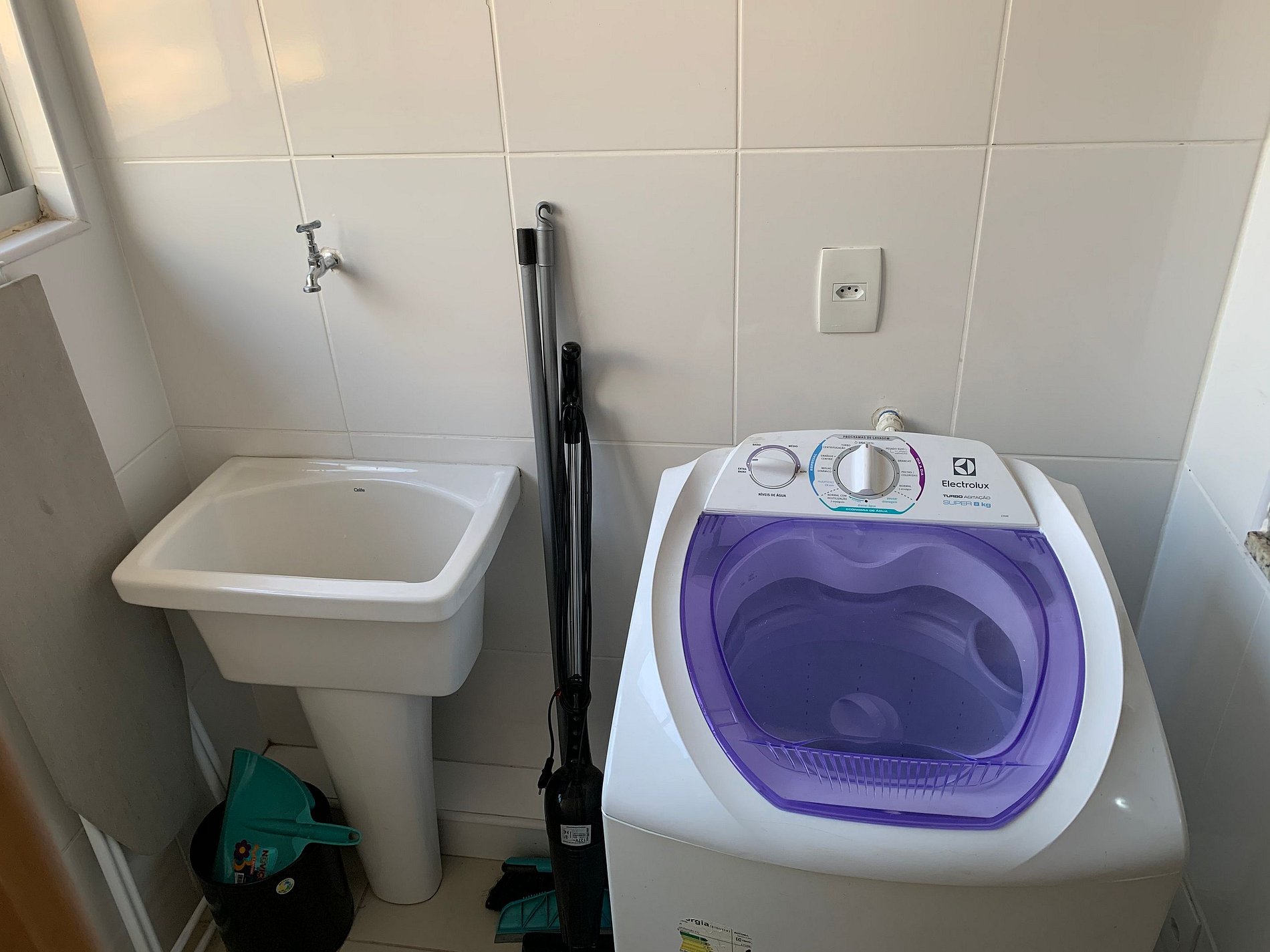 A suíte possui uma cama box de casal padrão com armário e cabides. O segundo quarto possui cama box de casal, criado mudo e também armário com cabides. Banheiro social no corredor. Todos os quartos e banheiros possuem travesseiros, roupa de cama e banho, shampoo e sabonete. A sala de estar possui um ambiente com uma mesa com quatro cadeiras, o outro ambiente conta com um sofá em couro para três pessoas, um rack em madeira e uma TV de 24”. A cozinha, com armários, está equipada com refrigerador Eletrolux de 240 L, forno de Micro-ondas Eletrolux de 20L, fogão de quatro bocas com acendimento automático, sanduicheira inox grill, liquidificador, garrafa térmica com base de filtro para café e cafeteira elétrica.A cozinha possui também um jogo de seis panelas (frigideira, leiteira e panela de pressão) taboa e faca de corte, escorredor de macarrão, amrinex, assadeiras, copos, taças, pratos rasos, pratos fundos, tigelas e talheres e xícaras para seis pessoas, e utensílios básicos de cozinha (escumadeira, peneira, concha, fouet, abridor de garrafa, saca rolha, cortador de pizza, cortador de queijo, etc). A área de serviço possui um tanque de 20 litros, lavadora de roupas Electrolux 8 kg turbo, taboa e ferro de passar Black Decker, varal de chão, cesto para roupa suja, balde, vassoura, rodo e pá, aspirador de pó, além de produtos básicos de limpeza.