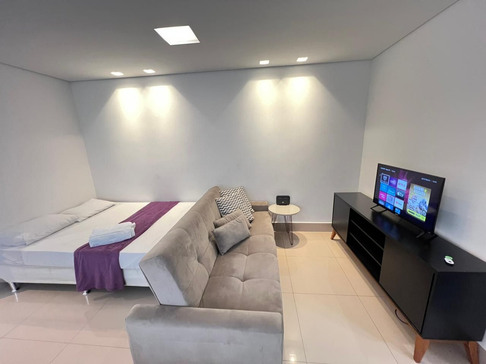 A suíte possui uma cama de casal, com closet grande e espaçoso. A sala de estar possui um ambiente de jantar com uma mesa com quatro cadeiras, o outro ambiente conta com um sofá retrátil em tecido para duas pessoas, um rack em madeira e uma TV smart de 43”, além de uma cama de casal adicional. A cozinha americana, com armários, está equipada com refrigerador de 320 L, forno de micro-ondas de 32L, cooktop de quatro bocas com acendimento automático, sanduicheira inox grill, liquidificador, garrafa térmica com base de filtro para café e cafeteira elétrica. A cozinha possui também um jogo de seis panelas (frigideira, leiteira e panela de pressão) taboa e faca de corte, escorredor de macarrão, marinex, assadeiras, copos, taças, pratos rasos, pratos fundos, tigelas e talheres e xícaras para seis pessoas, e utensílios básicos de cozinha (escumadeira, peneira, concha, fouet, abridor de garrafa, saca rolha, cortador de pizza, cortador de queijo, etc). A área de serviço possui tábua e ferro de passar , balde, vassoura, rodo e pá, aspirador de pó, máquina de lavar de 9kg além de produtos básicos de limpeza.