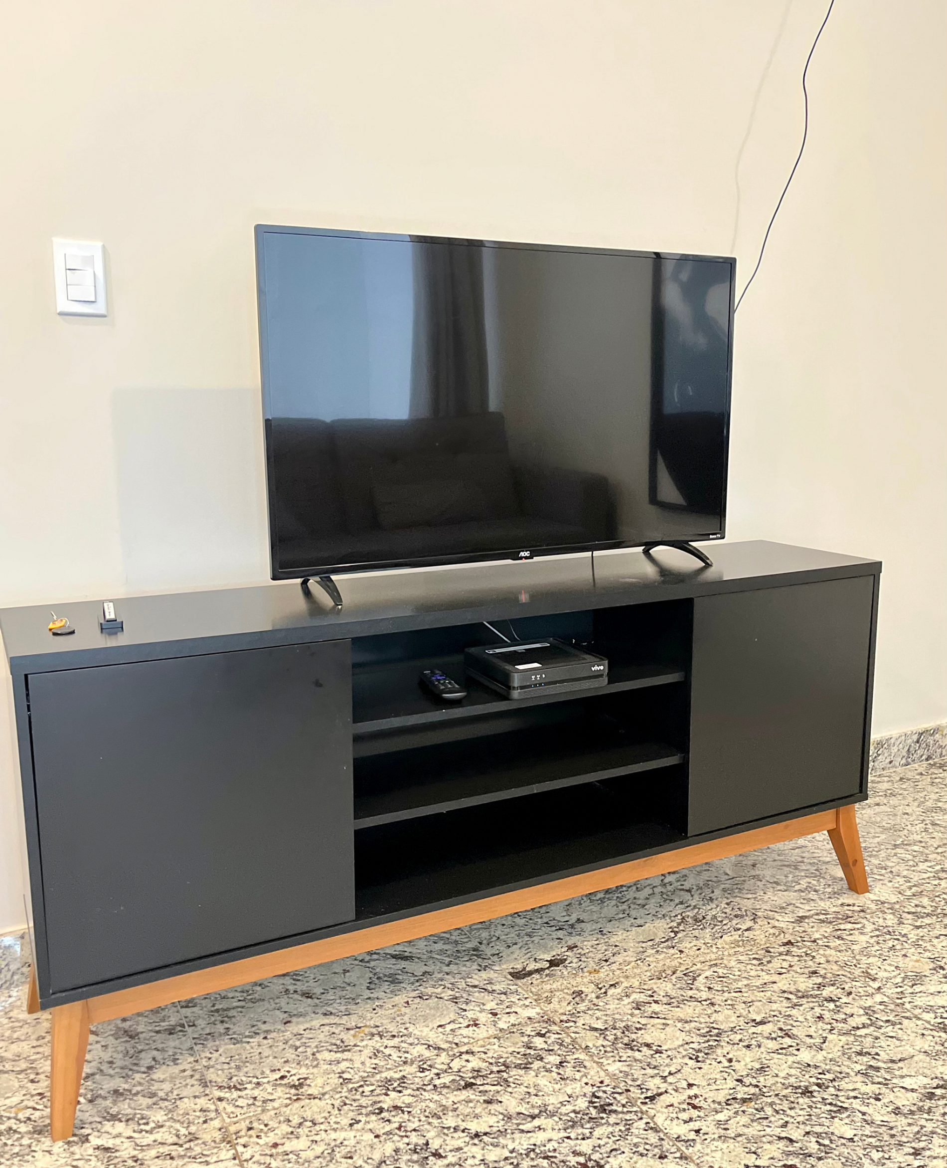 A suíte possui uma cama de casal e um de solteiro com um aramado com cabides e criado de apoio. O quarto, duas camas de solteiro, criado mudo e aramado com cabides. Todos os quartos e banheiros possuem travesseiros, roupa de cama e banho, shampoo e sabonete. A sala de estar possui um ambiente de jantar com uma mesa com quatro cadeiras, o outro ambiente conta com um sofá-cama de casal para duas pessoas, um rack em madeira e uma TV de 32”. A cozinha está equipada com refrigerador Consul de 320 L, forno de Micro-ondas Eletrolux de 27L, cooktop de quatro bocas com acendimento automático, sanduicheira inox grill, liquidificador, garrafa térmica com base de filtro para café e cafeteira elétrica. A cozinha possui também um jogo de seis panelas (frigideira, leiteira e panela de pressão) taboa e faca de corte, escorredor de macarrão, marinex, assadeiras, copos, taças, pratos rasos, pratos fundos, tigelas e talheres e xícaras para seis pessoas, e utensílios básicos de cozinha (escumadeira, peneira, concha, fouet, abridor de garrafa, saca rolha, cortador de pizza, cortador de queijo, etc). A área de serviço possui taboa e ferro de passar, balde, vassoura, rodo e pá, aspirador de pó, além de produtos básicos de limpeza.
