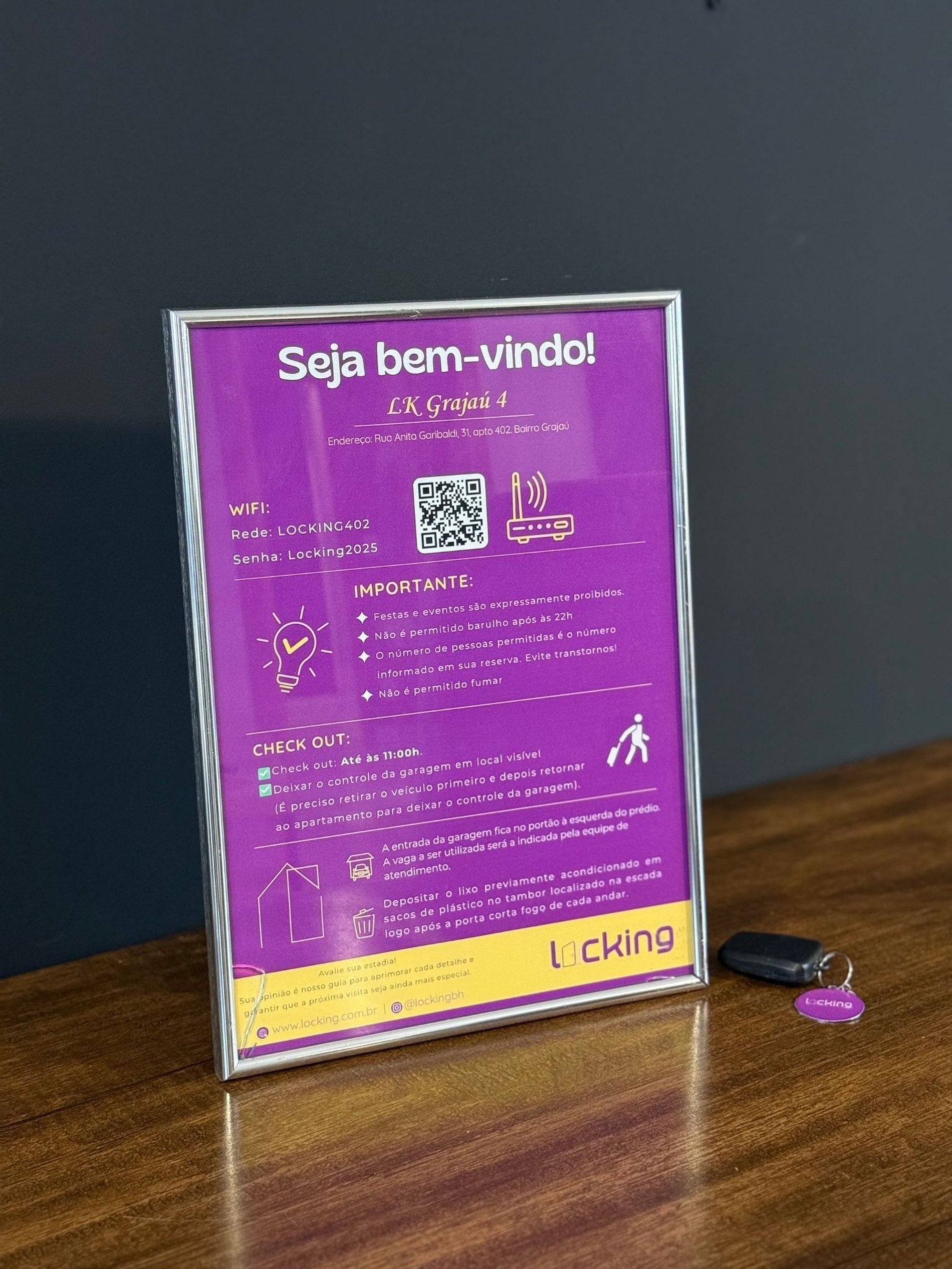 A unidade Locking`s Grajaú 4 é um apartamento arejado de aproximadamente 85 m² com três quartos sendo uma suíte, um banheiro social, sala com dois ambientes, cozinha, área de serviço e banho de serviço. O apartamento, situado em região residencial, local silencioso, é bem iluminado e arejado. Fica no quarto nível. O prédio possui elevador. Wi-Fi de 200 megas (internet fibra) e estacionamento para 02 carros (pequeno ou médio porte).