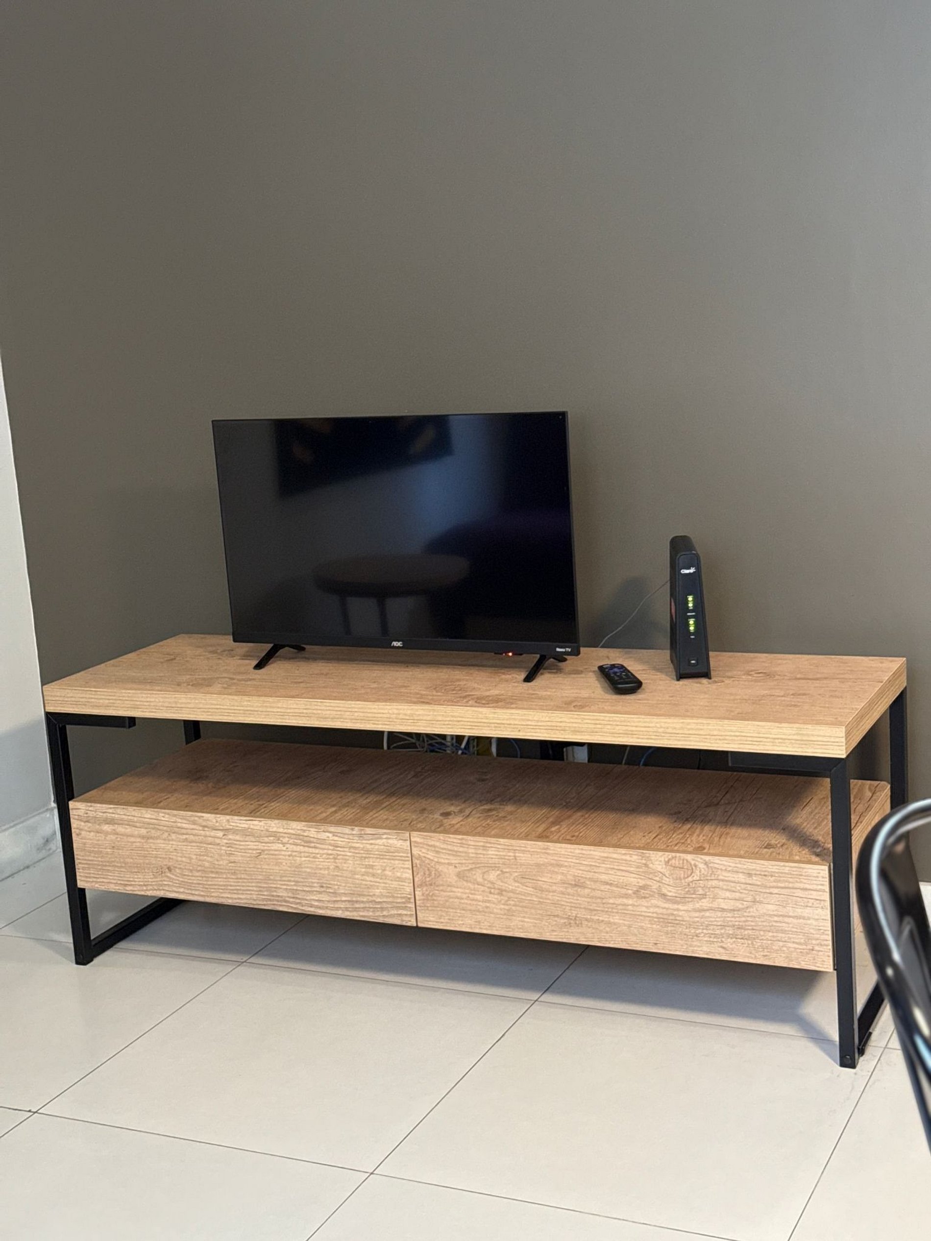 A suíte possui uma cama box de casal padrão com armário e cabides. O segundo e terceiro quartos possuem cama box de casal, mesa de cabeceira e também armário com cabides. Os dois quartos são atendidos por um banheiro social. Todos os quartos e banheiros possuem travesseiros, roupa de cama e banho, shampoo e sabonete. A sala de estar possui um ambiente com uma estação de trabalho e uma mesa com quatro cadeiras, o outro ambiente conta com um sofá em tecido para três pessoas, um hack em madeira e uma TV de 32”. A cozinha, com armários, está equipada com refrigerador de 240 L, forno de Micro-ondas de 20L, fogão de quatro bocas com acendimento automático, sanduicheira inox grill, liquidificador, garrafa térmica com base de filtro para café e cafeteira elétrica.A cozinha possui também um jogo de seis panelas (frigideira, leiteira e panela de pressão), tábua e faca de corte, escorredor de macarrão, marinex, assadeiras, copos, taças, pratos rasos, pratos fundos, tigelas e talheres e xícaras para seis pessoas, e utensílios básicos de cozinha. A área de serviço possui um tanque de 20 litros, lavadora de roupas 8 kg turbo, taboa e ferro de passar, varal de chão, cesto para roupa suja, balde, vassoura, rodo e pá, aspirador de pó, além de produtos básicos de limpeza.