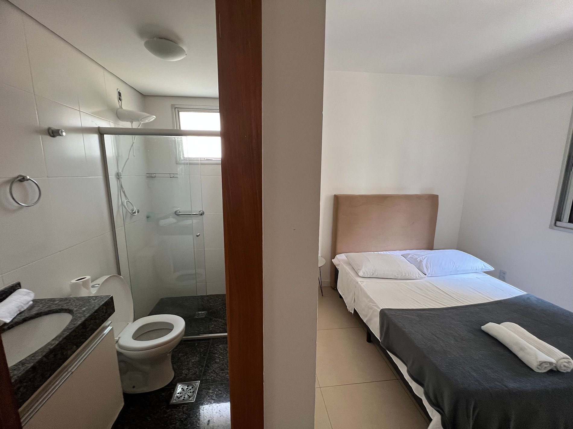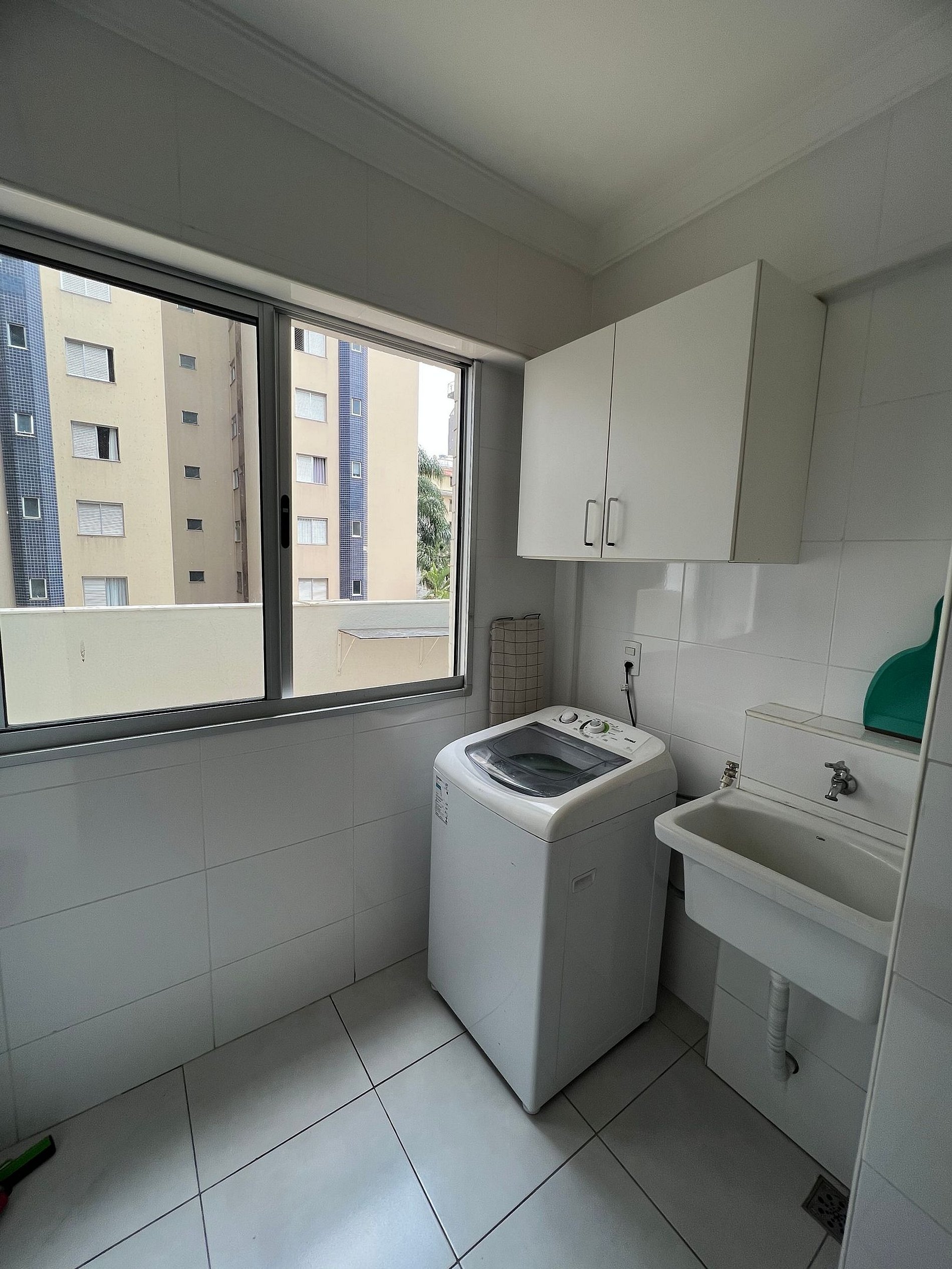 A suíte possui uma cama box de casal padrão, uma mesa de cabeceira e um armário com cabides. O segundo quarto possui duas camas de solteiro, mesa de cabeceira e uma estande em aramado cromado. Os quartos e banheiros possuem travesseiros, roupa de cama e banho. A sala de estar possui uma mesa com quatro cadeiras, o outro ambiente conta com um sofá cama em tecido para duas pessoas, uma smart TV de 32`` já conectada ao Wi-Fi do apartamento. A varanda possui uma estação de trabalho. A cozinha, com armários, está equipada com Refrigerador de 240 L, forno de Micro-ondas de 20L, fogão de quatro bocas com acendimento automático e sanduicheira inox grill. Além de um jogo de quatro panelas, taboa de corte, escorredor de macarrão, copos, pratos e talheres de jantar e sobremesa para quatro pessoas, cafeteira, garrafa térmica e xícaras também para quatro pessoas. A área de serviço possui um tanque de 20 litros, lavadora de roupas 8 kg turbo, taboa e ferro de passar, varal de chão, cesto para roupa suja, balde, vassoura, rodo e pá, além de produtos básicos de limpeza.