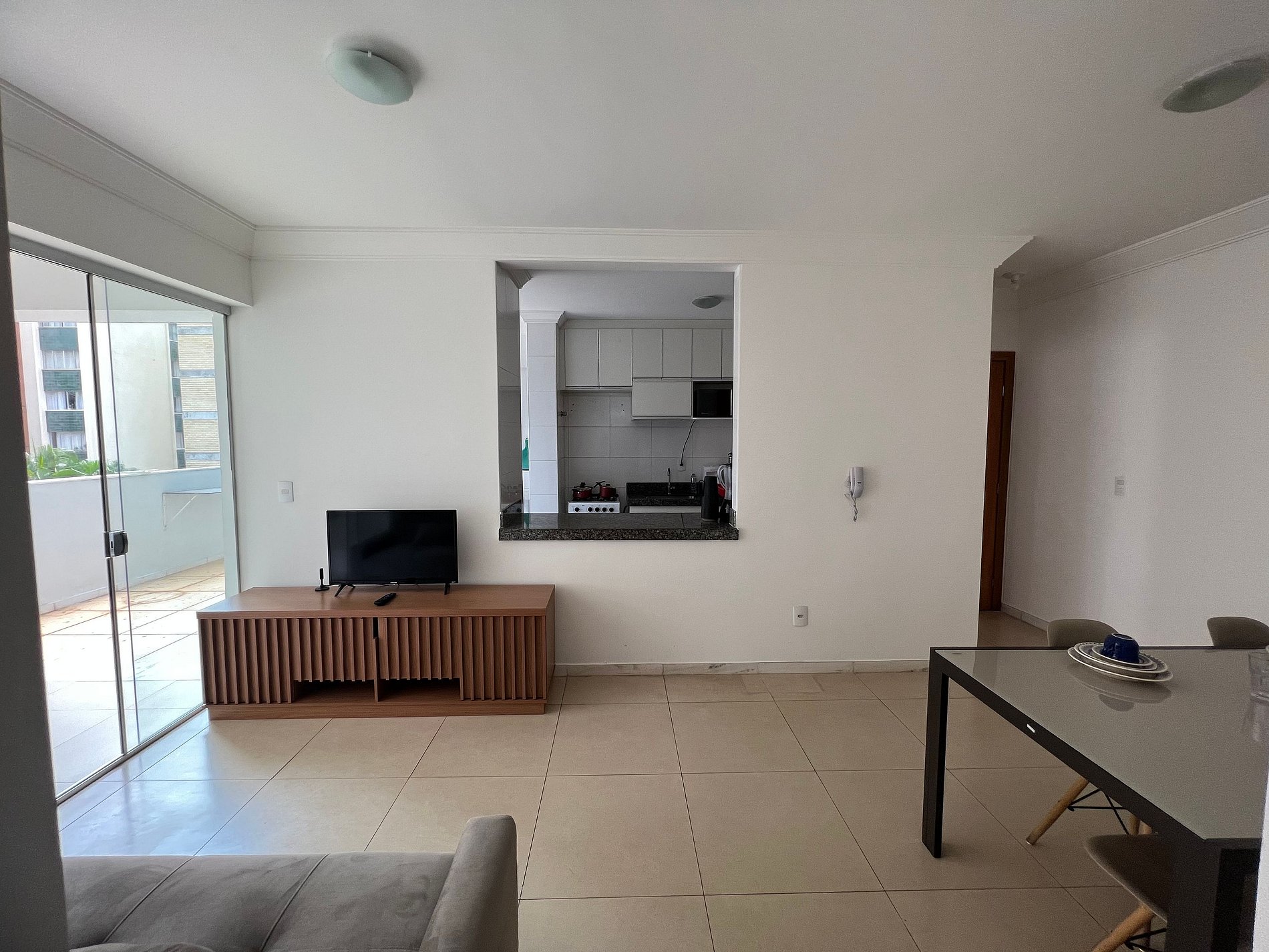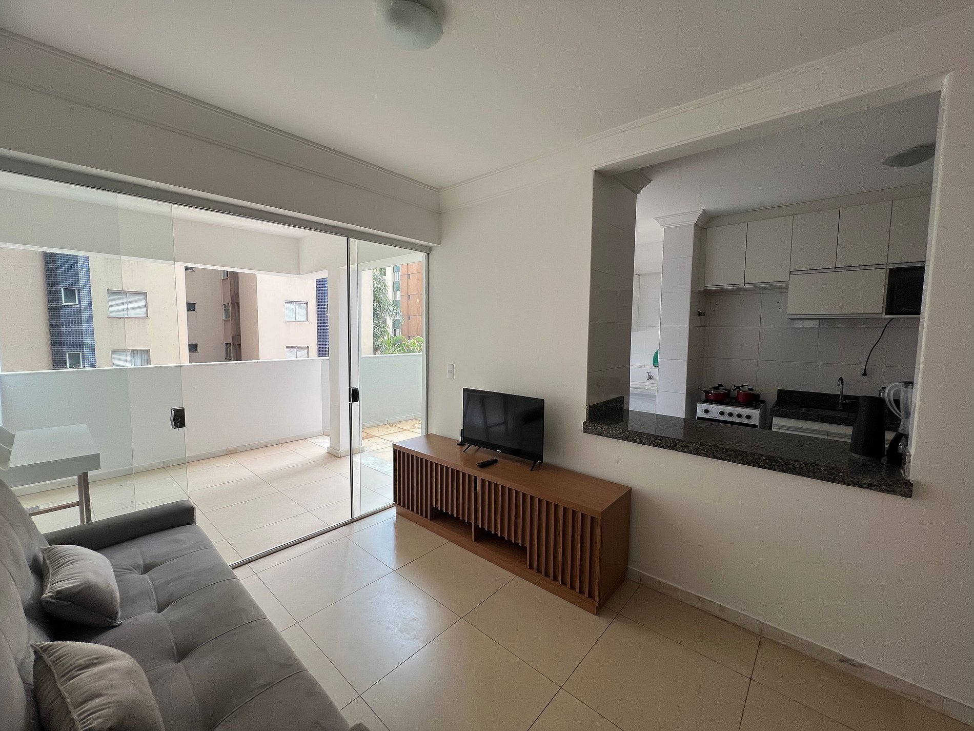 A suíte possui uma cama box de casal padrão, uma mesa de cabeceira e um armário com cabides. O segundo quarto possui duas camas de solteiro, mesa de cabeceira e uma estande em aramado cromado. Os quartos e banheiros possuem travesseiros, roupa de cama e banho. A sala de estar possui uma mesa com quatro cadeiras, o outro ambiente conta com um sofá cama em tecido para duas pessoas, uma smart TV de 32`` já conectada ao Wi-Fi do apartamento. A varanda possui uma estação de trabalho. A cozinha, com armários, está equipada com Refrigerador de 240 L, forno de Micro-ondas de 20L, fogão de quatro bocas com acendimento automático e sanduicheira inox grill. Além de um jogo de quatro panelas, taboa de corte, escorredor de macarrão, copos, pratos e talheres de jantar e sobremesa para quatro pessoas, cafeteira, garrafa térmica e xícaras também para quatro pessoas. A área de serviço possui um tanque de 20 litros, lavadora de roupas 8 kg turbo, taboa e ferro de passar, varal de chão, cesto para roupa suja, balde, vassoura, rodo e pá, além de produtos básicos de limpeza.