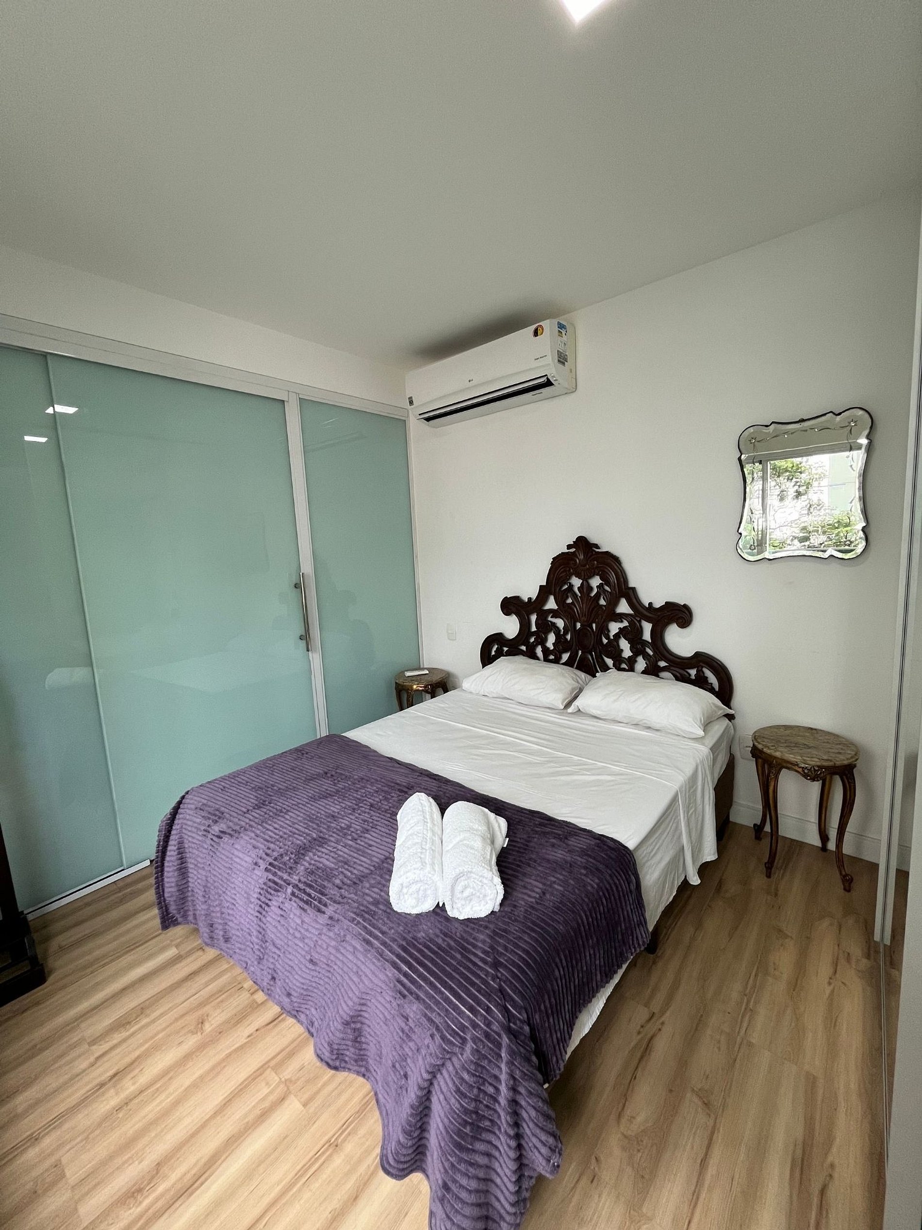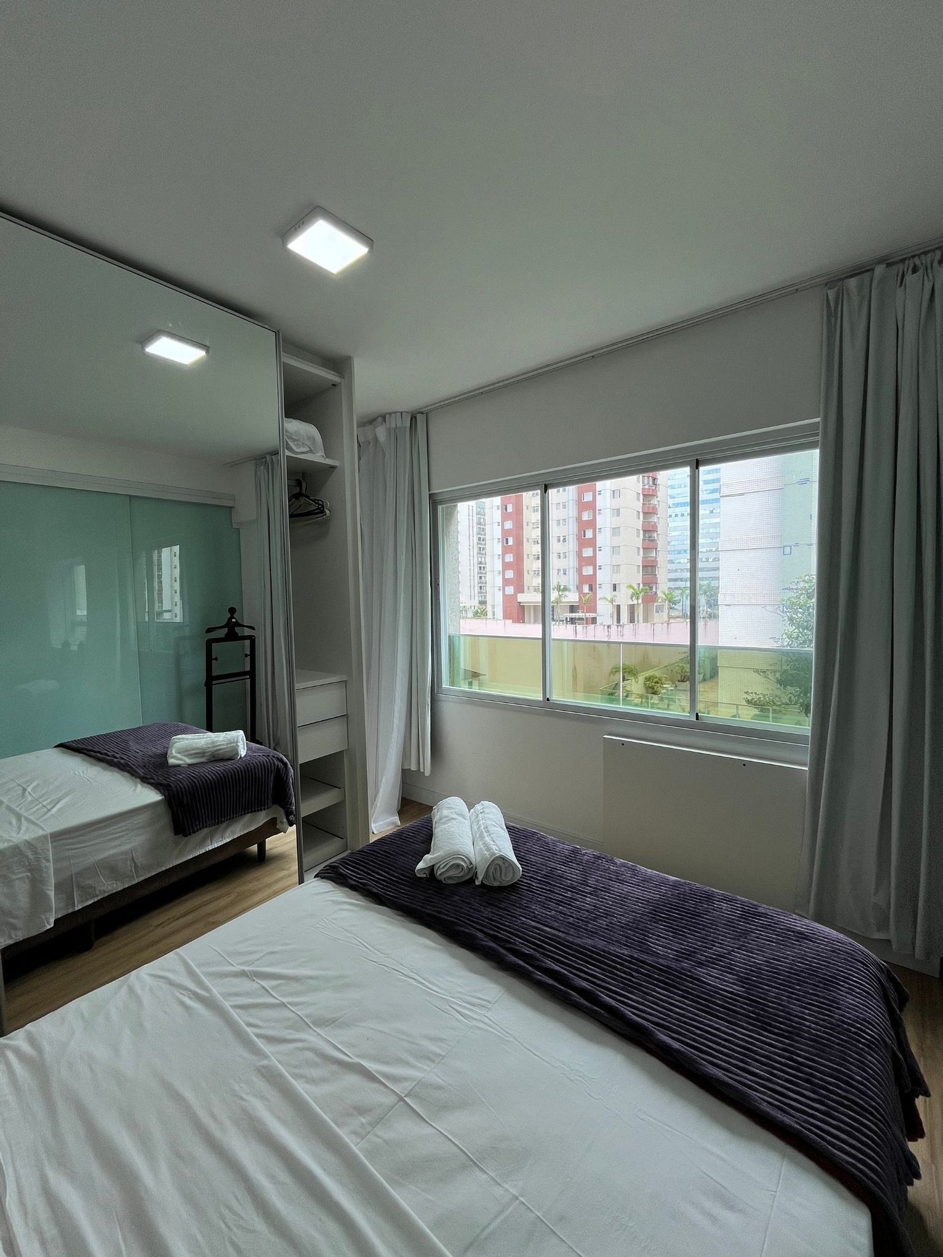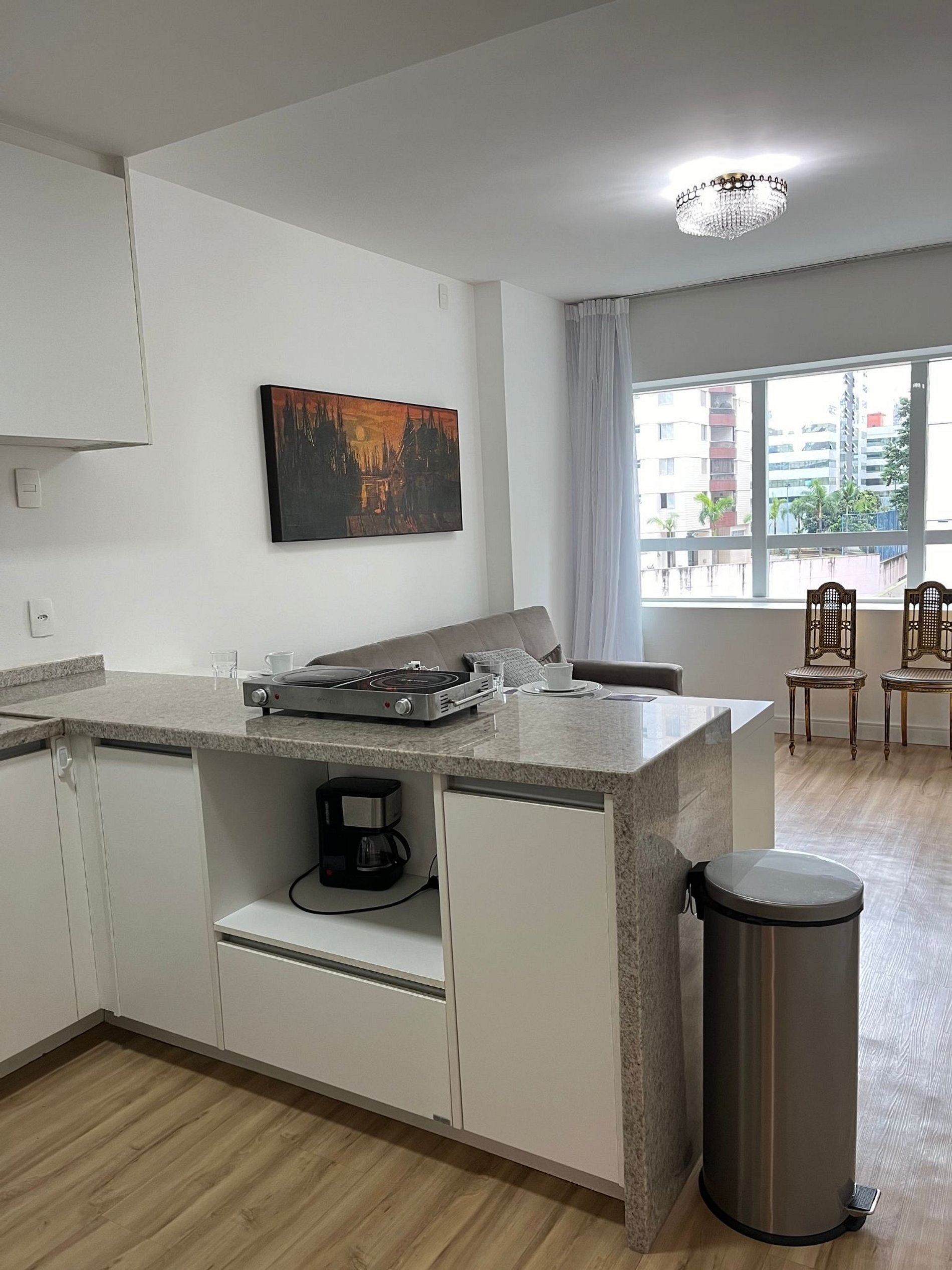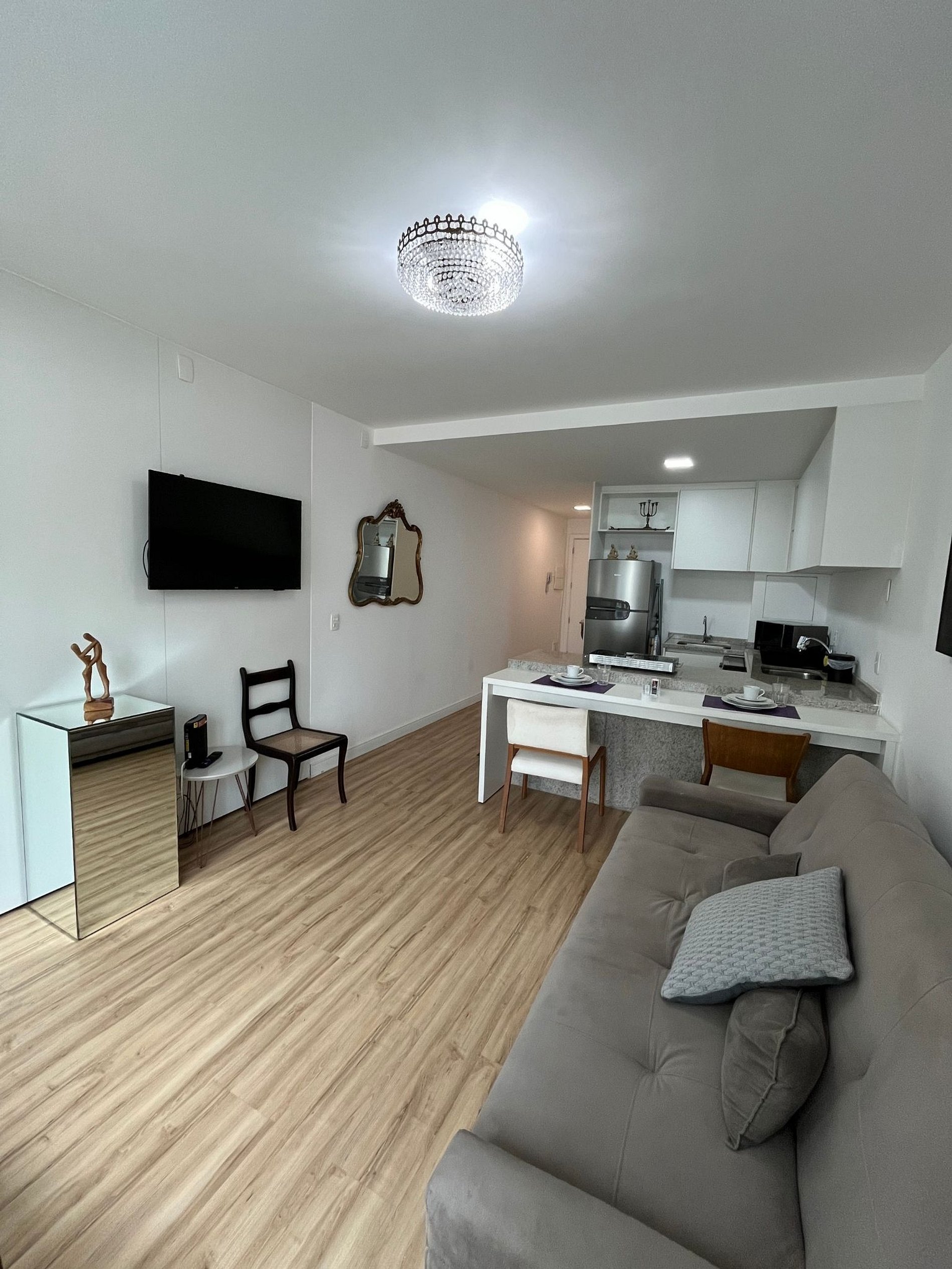 O apartamento conta com com dois ambientes sendo o primeiro uma sala com cozinha americana e o segundo com uma camas de casal, um mesa de cabeceira e armário com cabides, além do banheiro. Oferece travesseiros, roupa de cama e banho, shampoo e sabonete. Ar condicionado na suíte.A cozinha americana conta com cooktop de duas bocas, geladeira 240 litros forno de Micro-ondas de 20L, sanduicheira inox grill, liquidificador, garrafa térmica com base de filtro para café e cafeteira elétrica, copos, taças, pratos rasos, pratos fundos, tigelas e talheres e xícaras. Possui máquina de lavar roupa. Esta disponível ferro e tábua de passar. Na sala há um sofá cama, TV 34" e um colchão de solteiro avulso.
