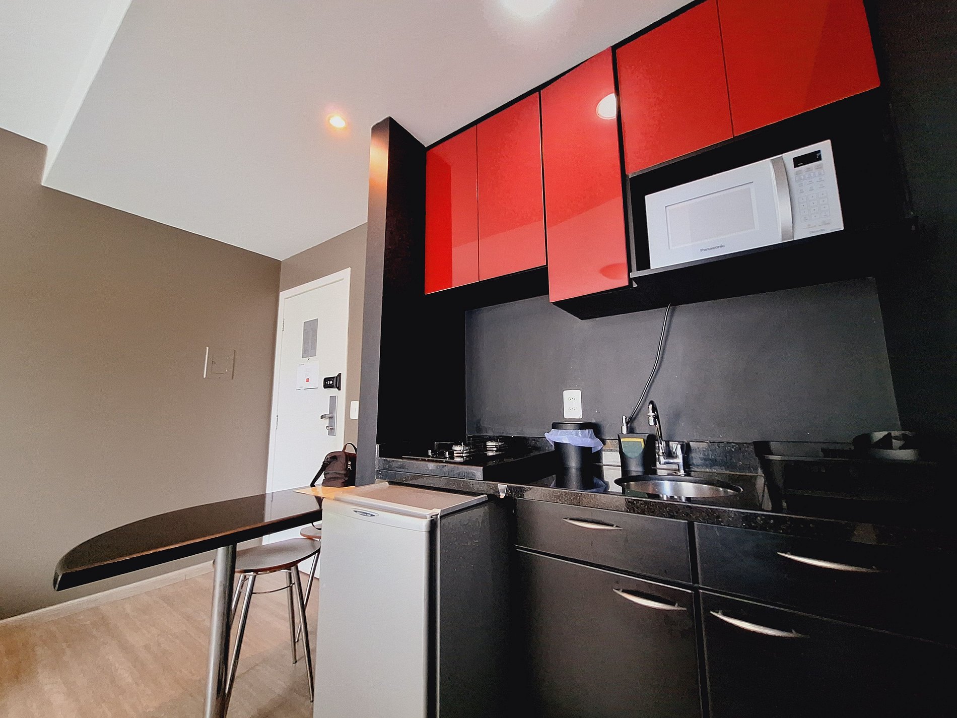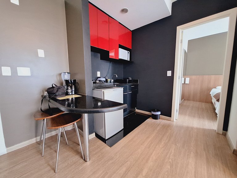 A suíte possui duas camas de solteiro, um criado e armário com cabides e televisão. O apartamento oferece travesseiros, roupa de cama e banho, shampoo e sabonete. A sala de estar possui um ambiente com uma estação de trabalho e uma mesa com duas cadeiras, um sofá-cama em tecido para duas pessoas. O outro ambiente é uma cozinha americana com armários, bancada com duas outras cadeiras, e está equipada com refrigerador tipo frigobar, forno de Micro-ondas de 20L, cooktop de duas bocas, sanduicheira inox grill, liquidificador, garrafa térmica com base de filtro para café e cafeteira elétrica. A cozinha possui também copos, taças, pratos rasos, pratos fundos, tigelas e talheres e xícaras para quatro pessoas. Estão disponíveis ferro, tábua de passar e produtos de limpeza.