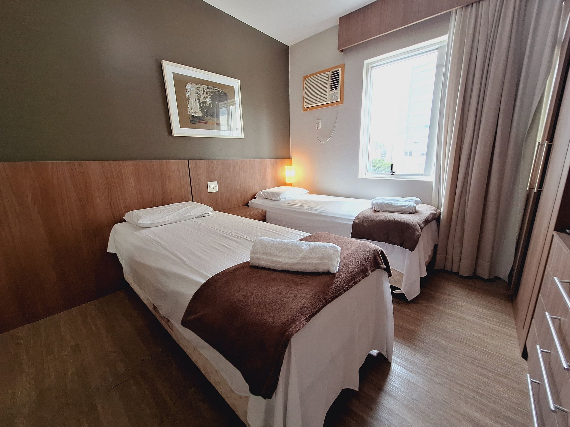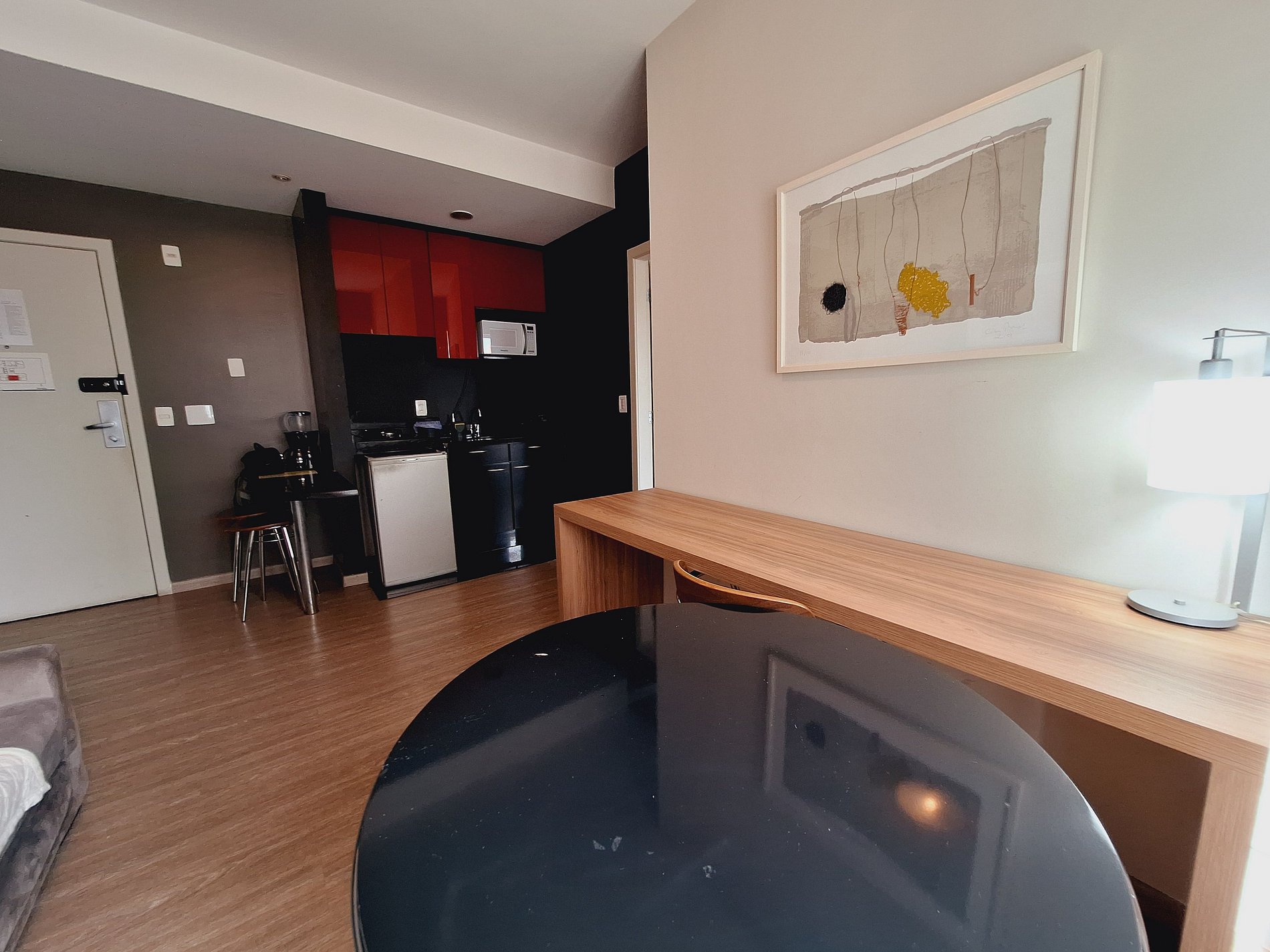 A suíte possui duas camas de solteiro, um criado e armário com cabides e televisão. O apartamento oferece travesseiros, roupa de cama e banho, shampoo e sabonete. A sala de estar possui um ambiente com uma estação de trabalho e uma mesa com duas cadeiras, um sofá-cama em tecido para duas pessoas. O outro ambiente é uma cozinha americana com armários, bancada com duas outras cadeiras, e está equipada com refrigerador tipo frigobar, forno de Micro-ondas de 20L, cooktop de duas bocas, sanduicheira inox grill, liquidificador, garrafa térmica com base de filtro para café e cafeteira elétrica. A cozinha possui também copos, taças, pratos rasos, pratos fundos, tigelas e talheres e xícaras para quatro pessoas. Estão disponíveis ferro, tábua de passar e produtos de limpeza.