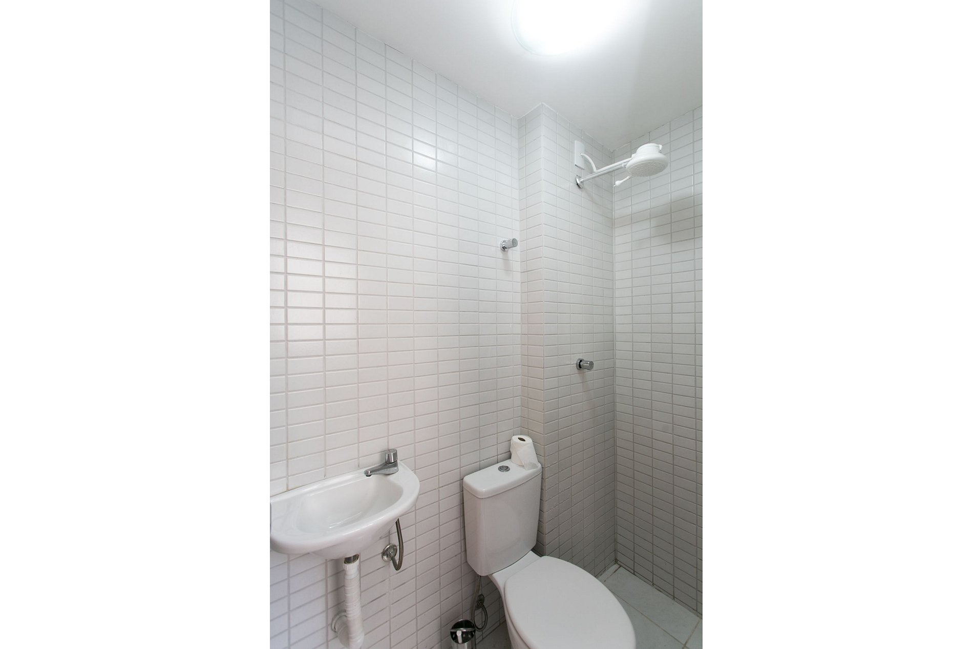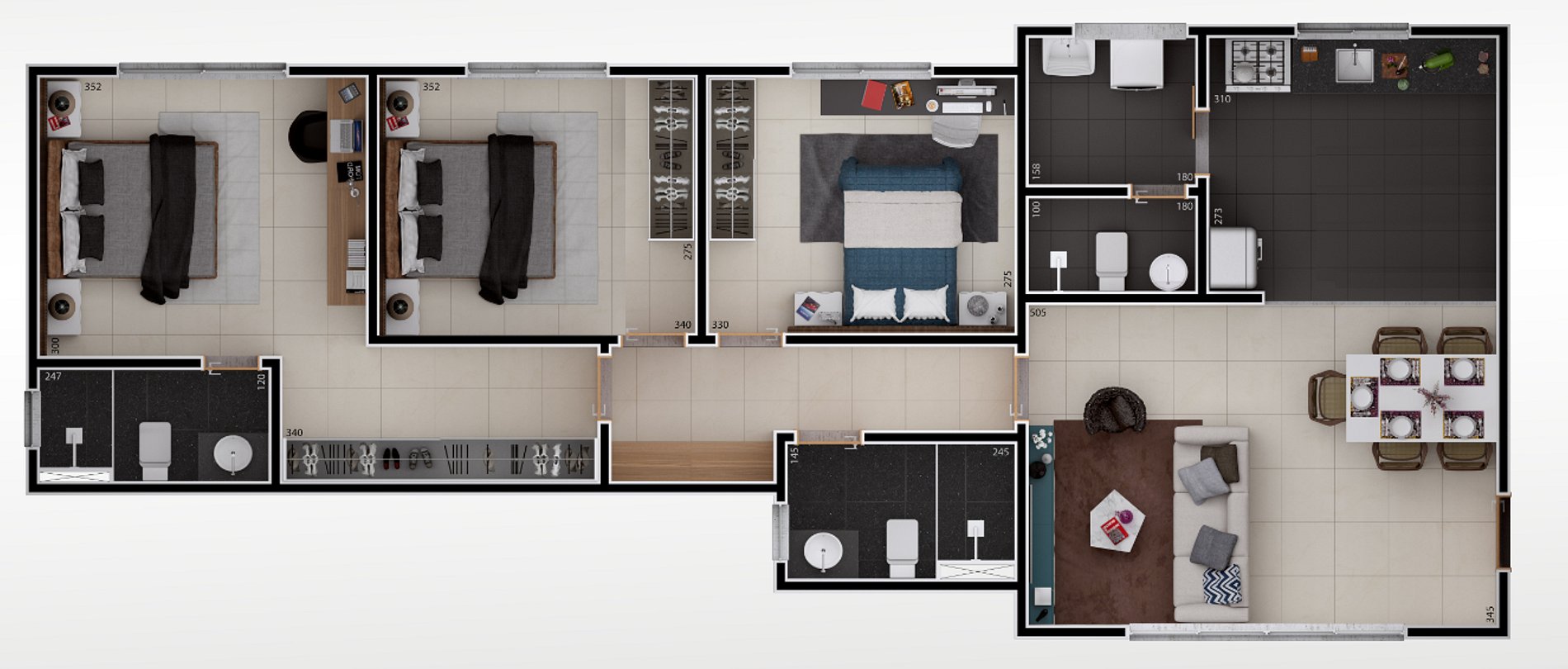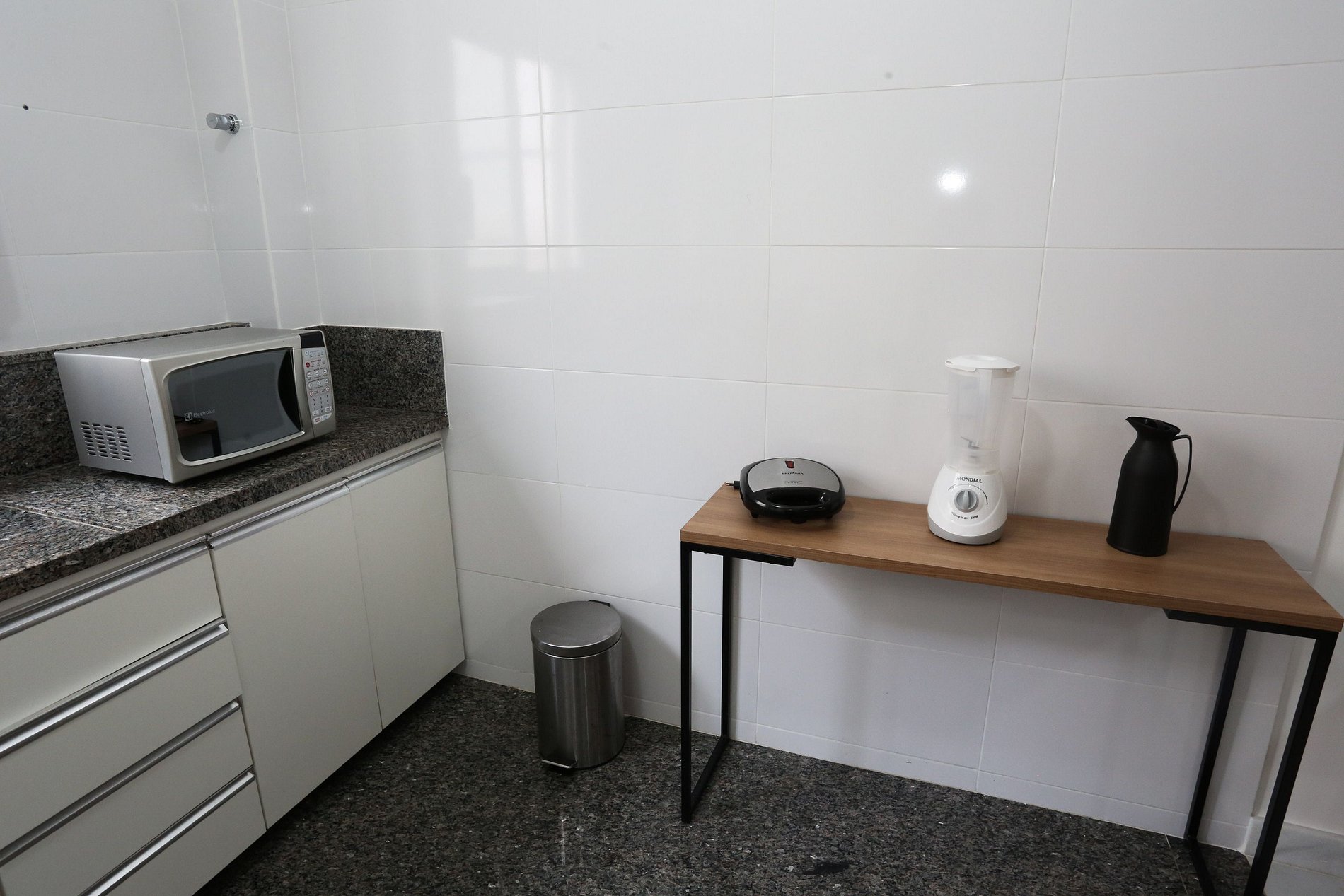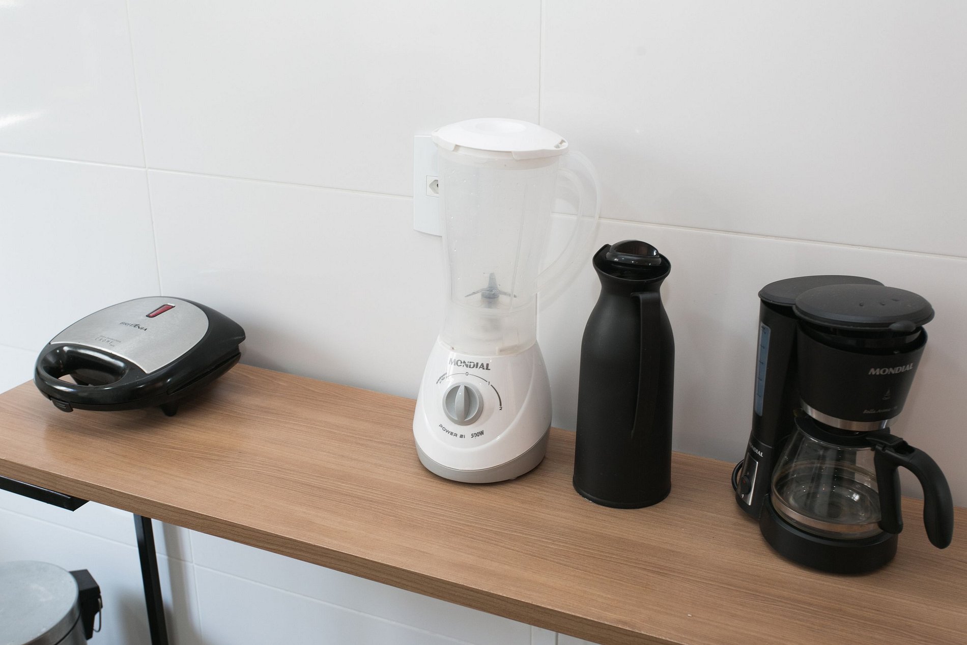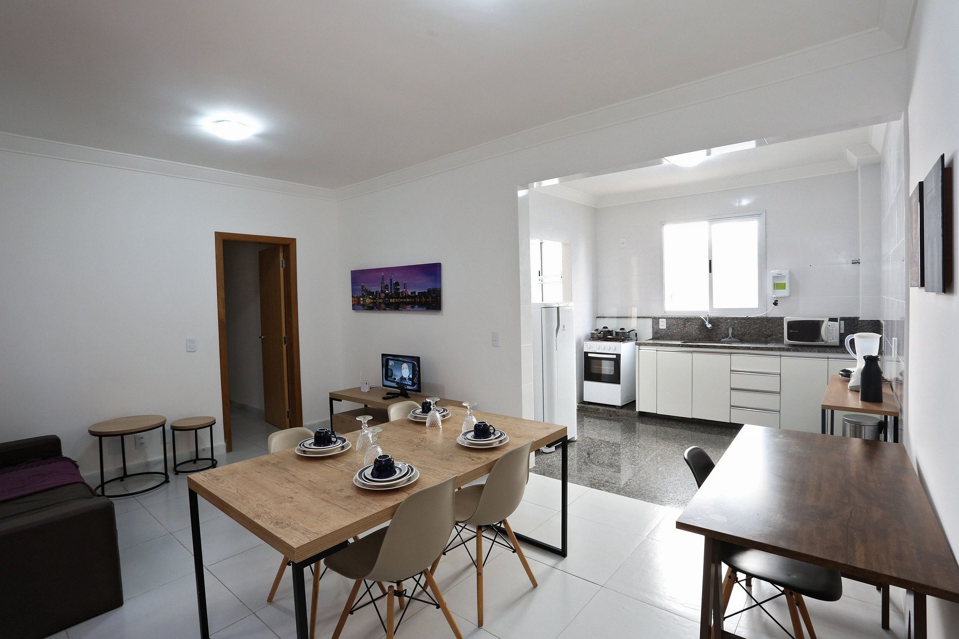 A suíte possui uma cama box de casal padrão com armário e cabides. O segundo e terceiro quartos possuem cama box de casal, criado mudo e também armário com cabides. Os dois quartos são atendidos por um banheiro social. Todos os quartos e banheiros possuem travesseiros, roupa de cama e banho, shampoo e sabonete. A sala de estar possui um ambiente com uma estação de trabalho e uma mesa com quatro cadeiras, o outro ambiente conta com um sofá em tecido para três pessoas, um rack em madeira e uma TV de 24”. A cozinha, com armários, está equipada com refrigerador de 240 L, forno de Micro-ondas de 20L, fogão de quatro bocas com acendimento automático, sanduicheira inox grill, liquidificador, garrafa térmica com base de filtro para café e cafeteira elétrica.A cozinha possui também um jogo de seis panelas (frigideira, leiteira e panela de pressão) taboa e faca de corte, escorredor de macarrão, marinex, assadeiras, copos, taças, pratos rasos, pratos fundos, tigelas e talheres e xícaras para seis pessoas, e utensílios básicos de cozinha (escumadeira, peneira, concha, fouet, abridor de garrafa, saca rolha, cortador de pizza, cortador de queijo, etc). A área de serviço possui um tanque de 20 litros, lavadora de roupas 8 kg turbo, taboa e ferro de passar, varal de chão, cesto para roupa suja, balde, vassoura, rodo e pá, aspirador de pó, além de produtos básicos de limpeza.