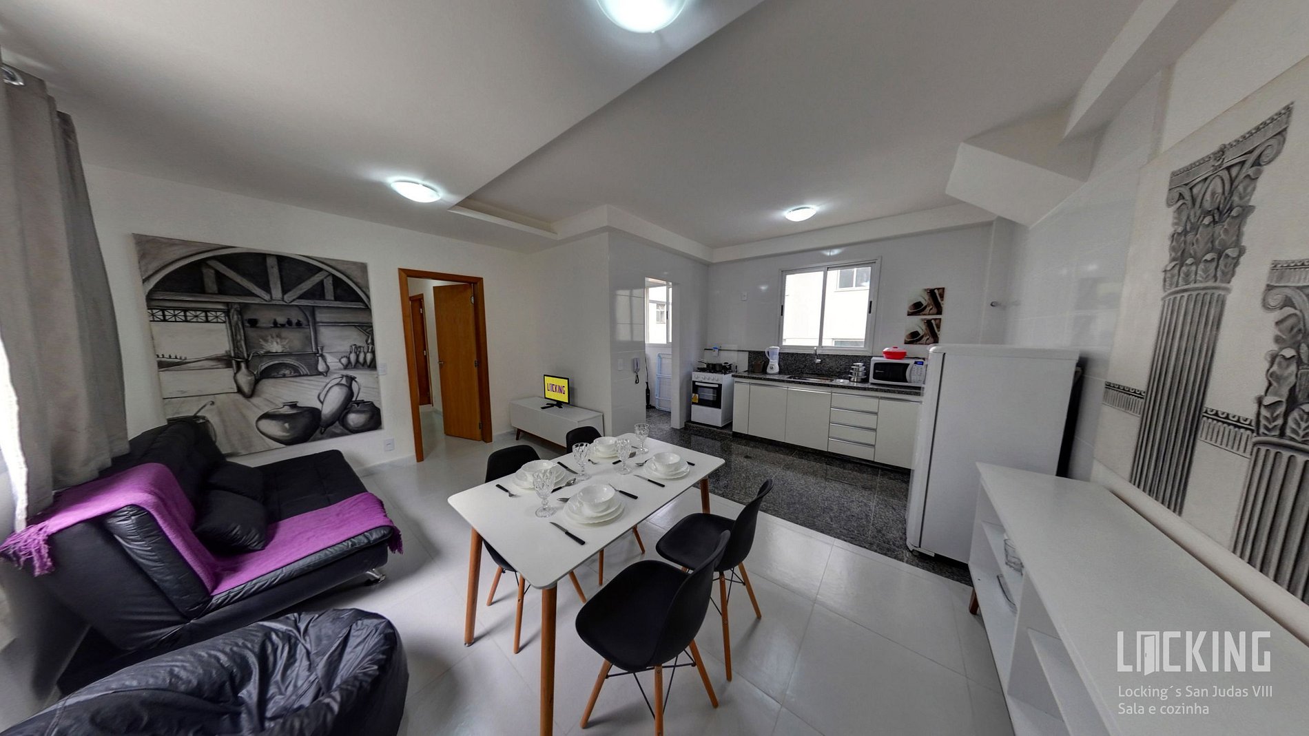 A suíte possui uma cama box de casal padrão com armário e cabides. O segundo e terceiro quartos possuem cama box de casal, criado mudo e também armário com cabides. Os dois quartos são atendidos por dois banheiros sociais. Todos os quartos e banheiros possuem travesseiros, roupa de cama e banho, shampoo e sabonete. A sala de estar possui um ambiente com uma estação de trabalho e uma mesa com quatro cadeiras, o outro ambiente conta com um sofá em tecido para três pessoas, um rack em madeira e uma TV de 24”. A cozinha, com armários, está equipada com refrigerador de 240 L, forno de Micro-ondas de 20L, fogão de quatro bocas com acendimento automático, sanduicheira inox grill, liquidificador, garrafa térmica com base de filtro para café e cafeteira elétrica. A cozinha possui também um jogo de seis panelas (frigideira, leiteira e panela de pressão) taboa e faca de corte, escorredor de macarrão, marinex, assadeiras, copos, taças, pratos rasos, pratos fundos, tigelas e talheres e xícaras para seis pessoas, e utensílios básicos de cozinha (escumadeira, peneira, concha, fouet, abridor de garrafa, saca rolha, cortador de pizza, cortador de queijo, etc). A área de serviço possui um tanque de 20 litros, lavadora de roupas 8 kg turbo, taboa e ferro de passar, varal de chão, cesto para roupa suja, balde, vassoura, rodo e pá, aspirador de pó, além de produtos básicos de limpeza. O terraço possui um mesa com ombrelone e seis cadeiras.