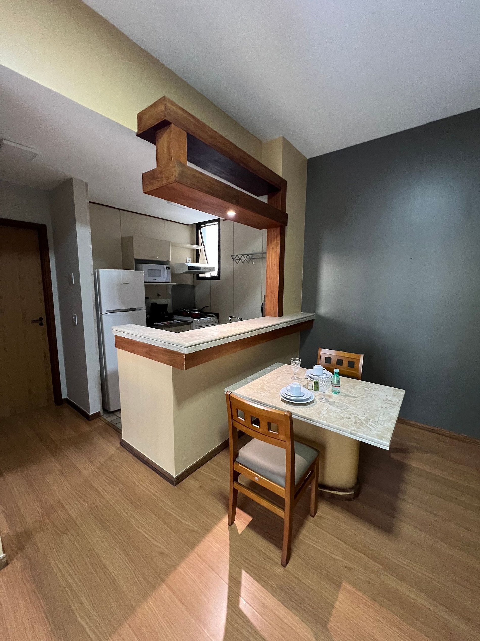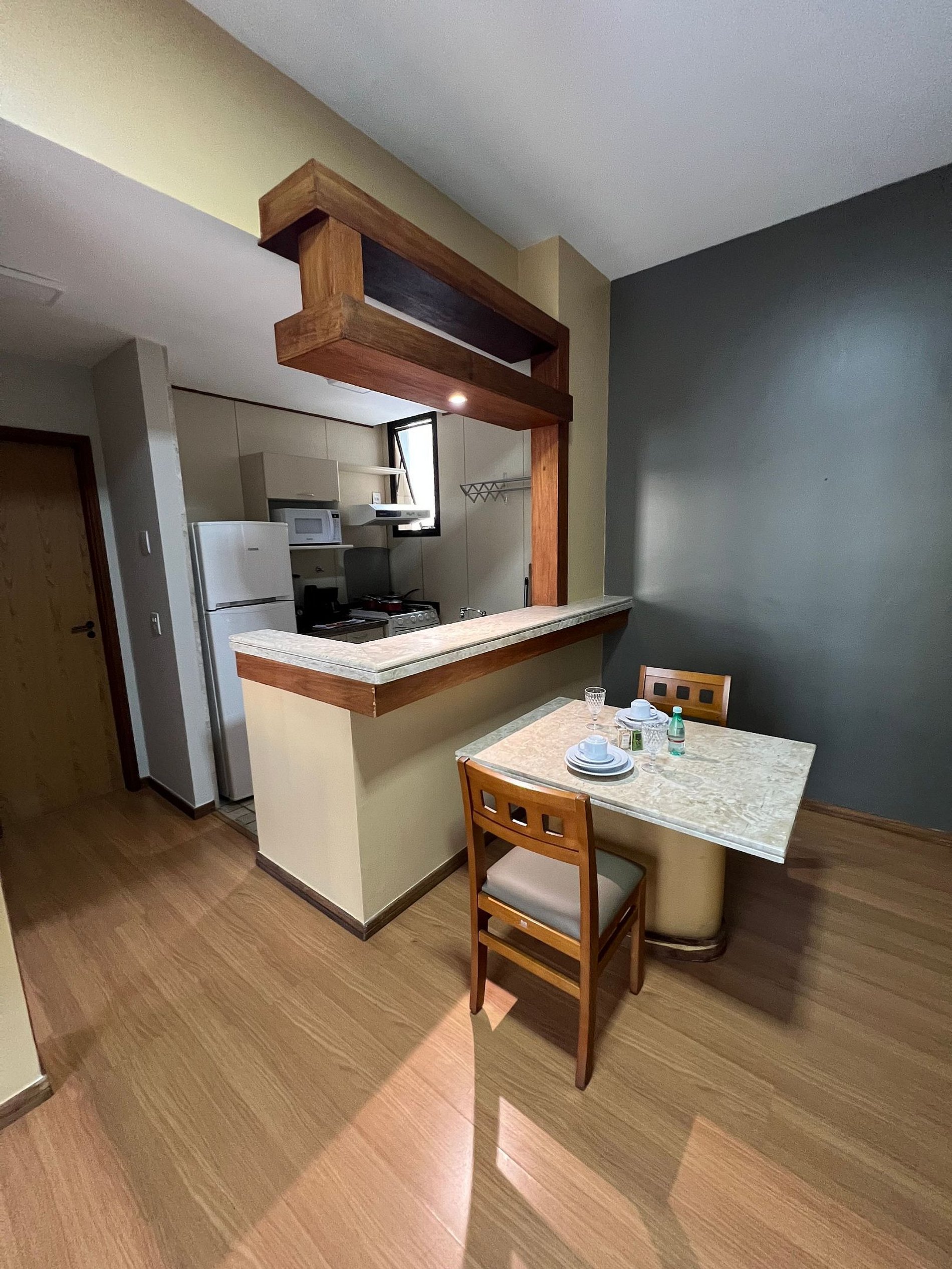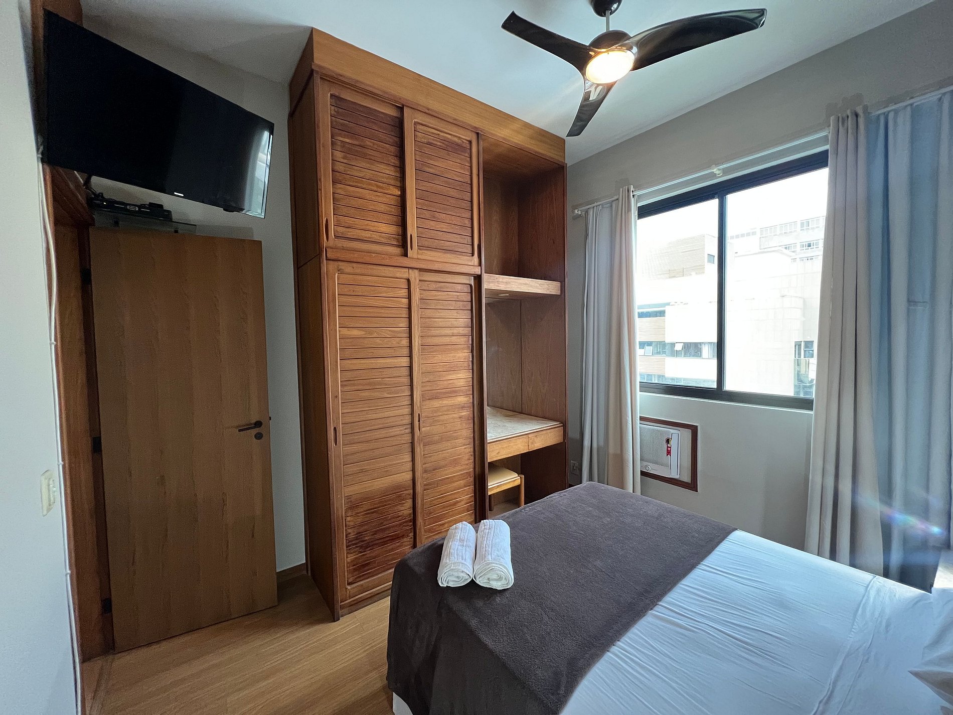 O quarto possui uma cama queen, uma mesa de cabeceira e armário com cabides e televisão. O apartamento oferece travesseiros, roupa de cama e banho, shampoo e sabonete. A sala de estar possui um ambiente com uma uma mesa com duas cadeiras para refeição e trabalho e um sofá com televisão 43". O outro ambiente é uma cozinha americana com armários, e está equipada com refrigerador fogão quatro bocas com forno, micro-ondas de 20L, sanduicheira inox grill, liquidificador, garrafa térmica com base de filtro para café e cafeteira elétrica .A cozinha possui também copos, taças, pratos rasos, pratos fundos, tigelas e talheres e xícaras. Esta disponível ferro e taboa de passar.