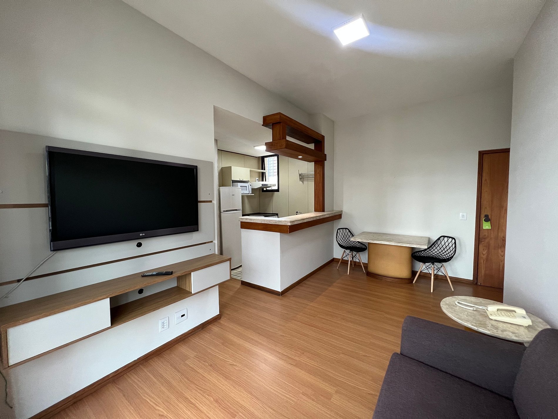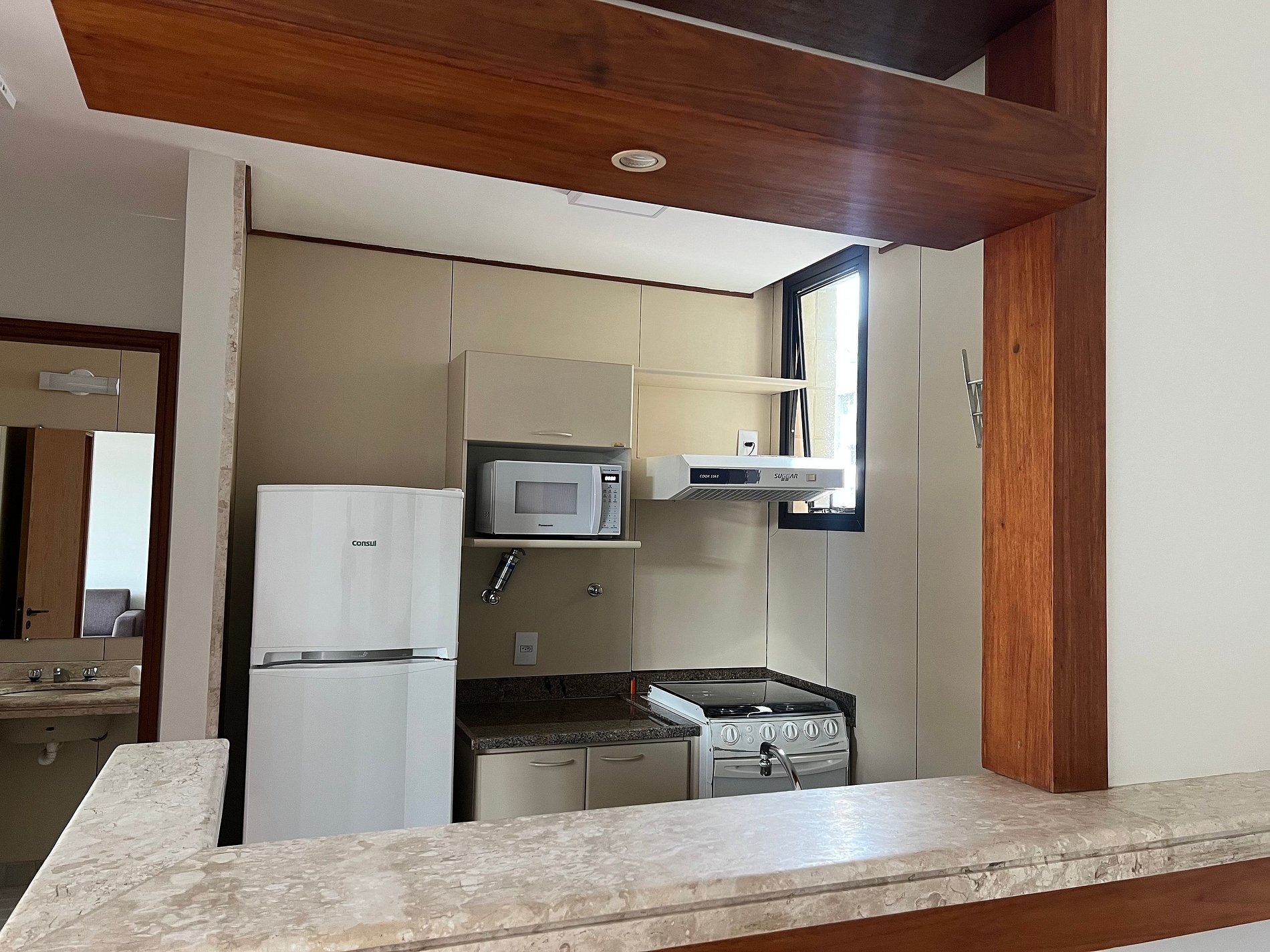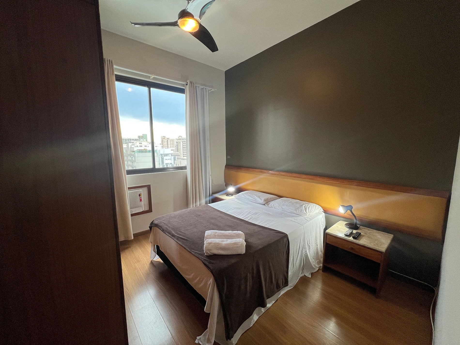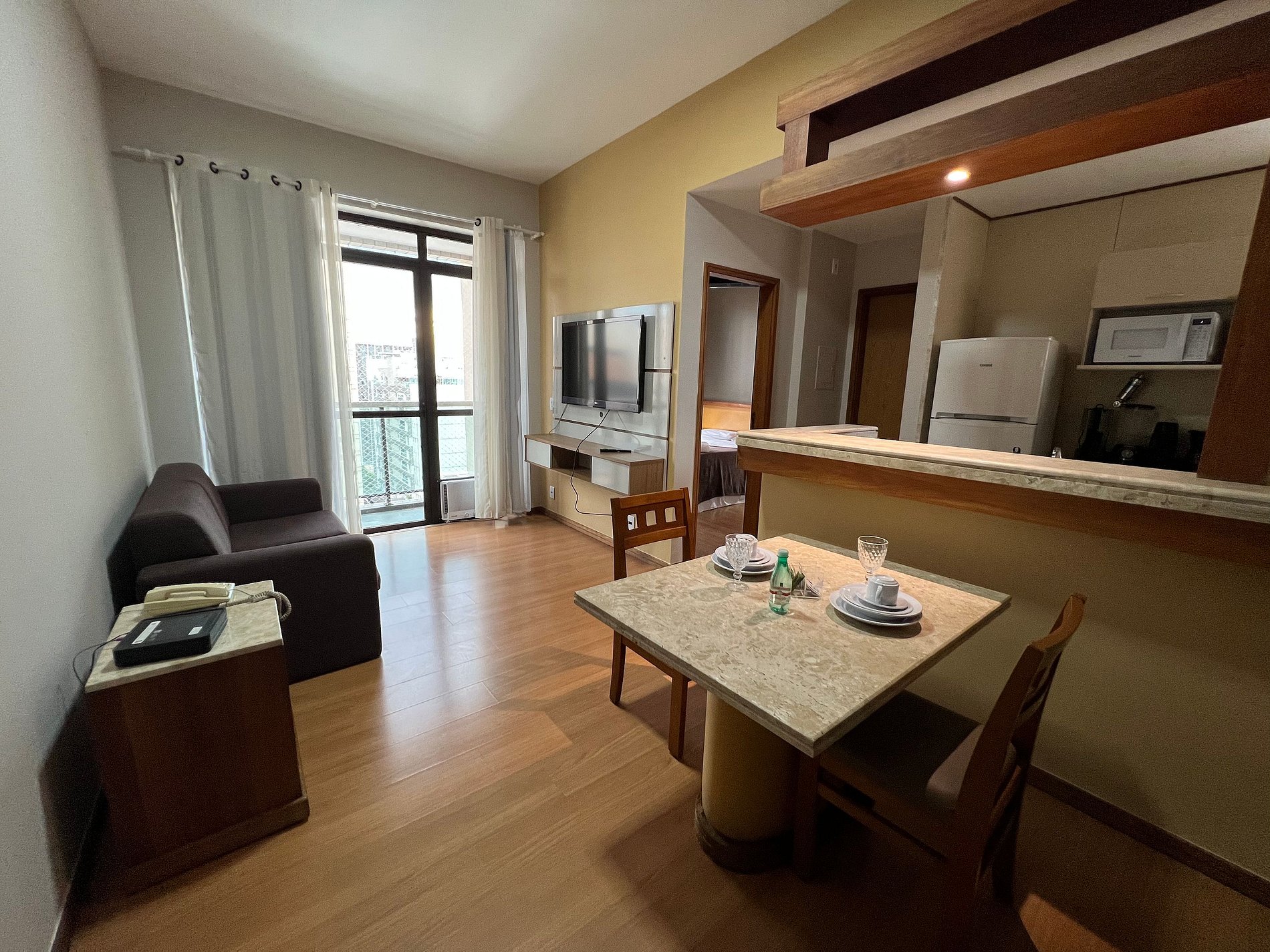 O quarto possui uma cama queen, uma mesa de cabeceira e armário com cabides e televisão. O apartamento oferece travesseiros, roupa de cama e banho, shampoo e sabonete. A sala de estar possui um ambiente com uma uma mesa com duas cadeiras para refeição e trabalho e um sofá com televisão 43". O outro ambiente é uma cozinha americana com armários, e está equipada com refrigerador fogão quatro bocas com forno, micro-ondas de 20L, sanduicheira inox grill, liquidificador, garrafa térmica com base de filtro para café e cafeteira elétrica .A cozinha possui também copos, taças, pratos rasos, pratos fundos, tigelas e talheres e xícaras. Esta disponível ferro e taboa de passar.