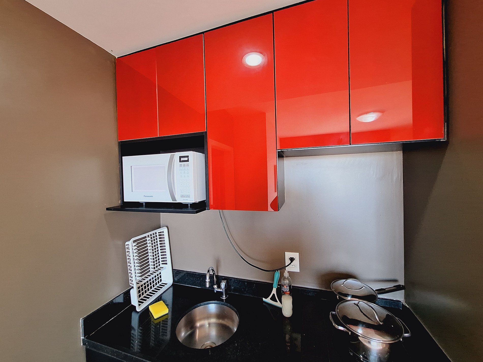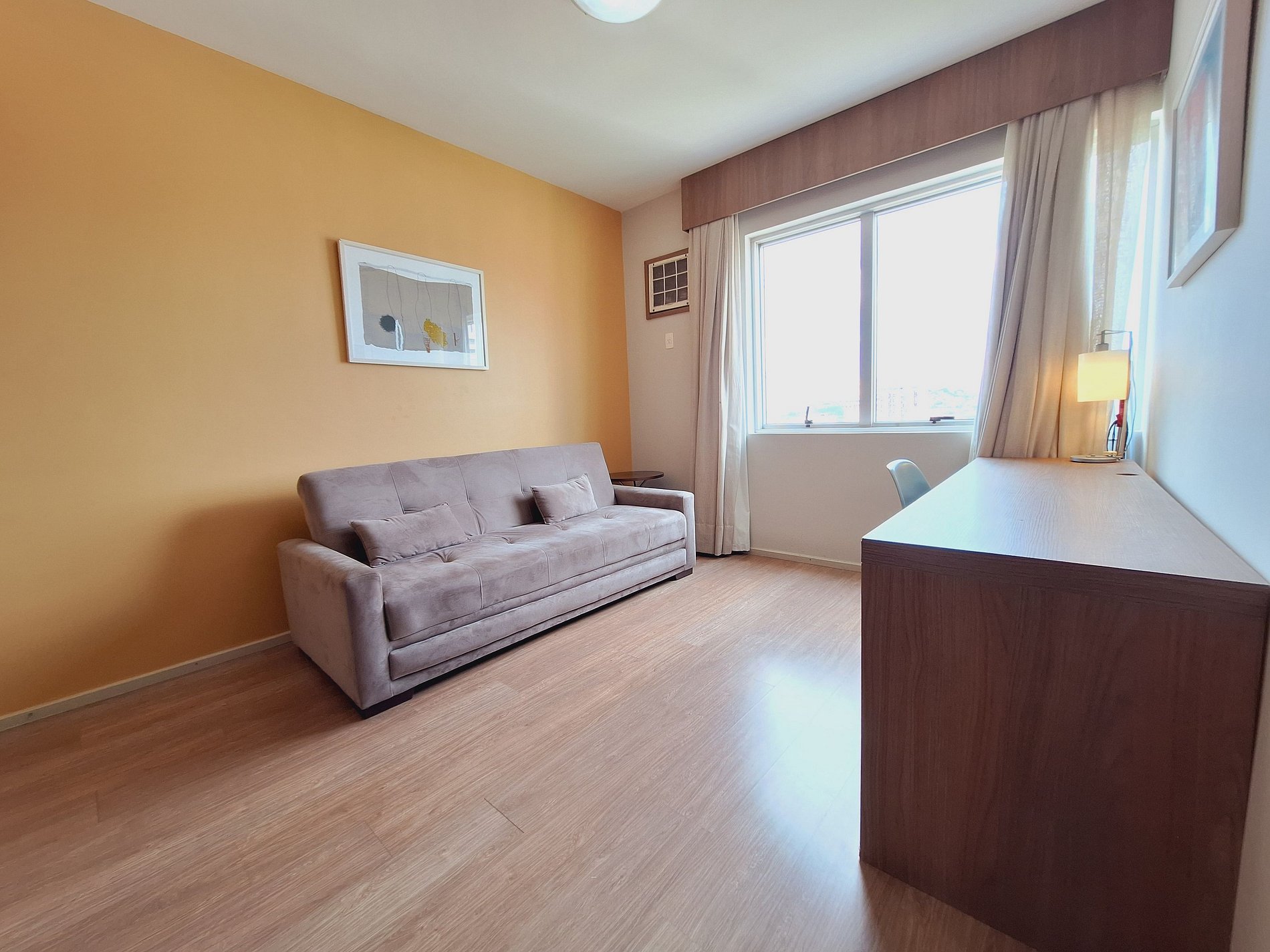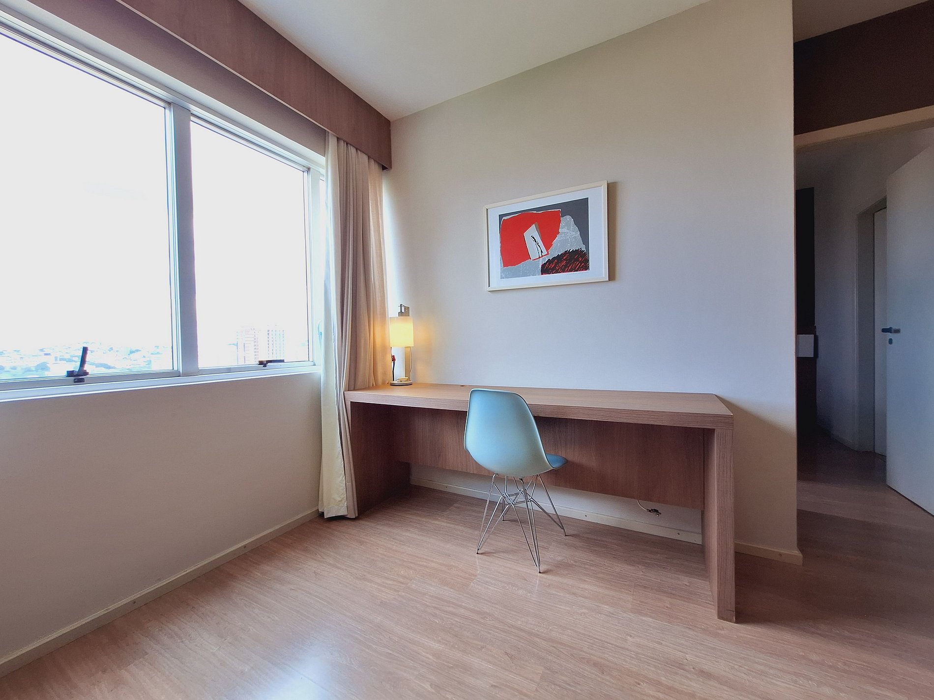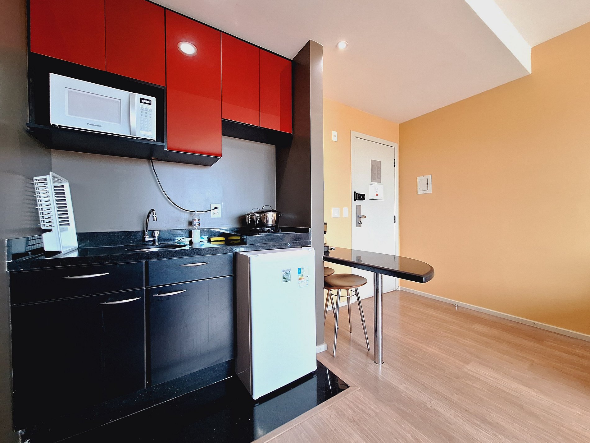 A suíte possui uma cama box queen, uma mesa de cabeceira com luminária e armário com cabides e televisão. O apartamento oferece travesseiros, roupa de cama e banho, shampoo e sabonete. A sala de estar possui um ambiente com uma estação de trabalho e uma mesa com duas cadeiras, um sofá-cama em tecido para duas pessoas. O outro ambiente é uma cozinha americana com armários, bancada com duas outras cadeiras, e está equipada com refrigerador tipo frigobar, forno de Micro-ondas de 20L, cooktop de duas bocas, sanduicheira inox grill, liquidificador, garrafa térmica com base de filtro para café e cafeteira elétrica. A cozinha possui também copos, taças, pratos rasos, pratos fundos, tigelas e talheres e xícaras. Estão disponíveis ferro, tábua de passar e produtos de limpeza.