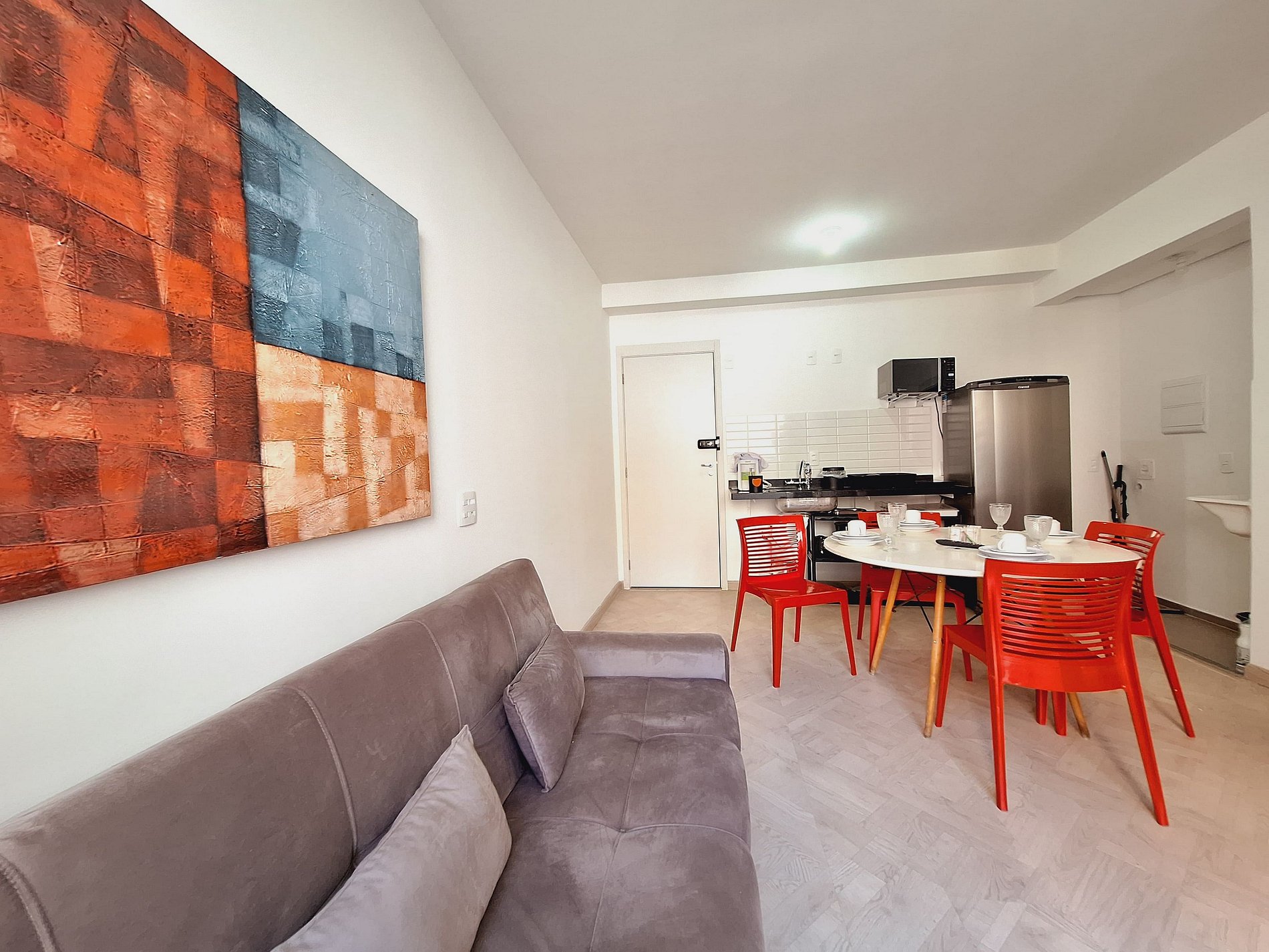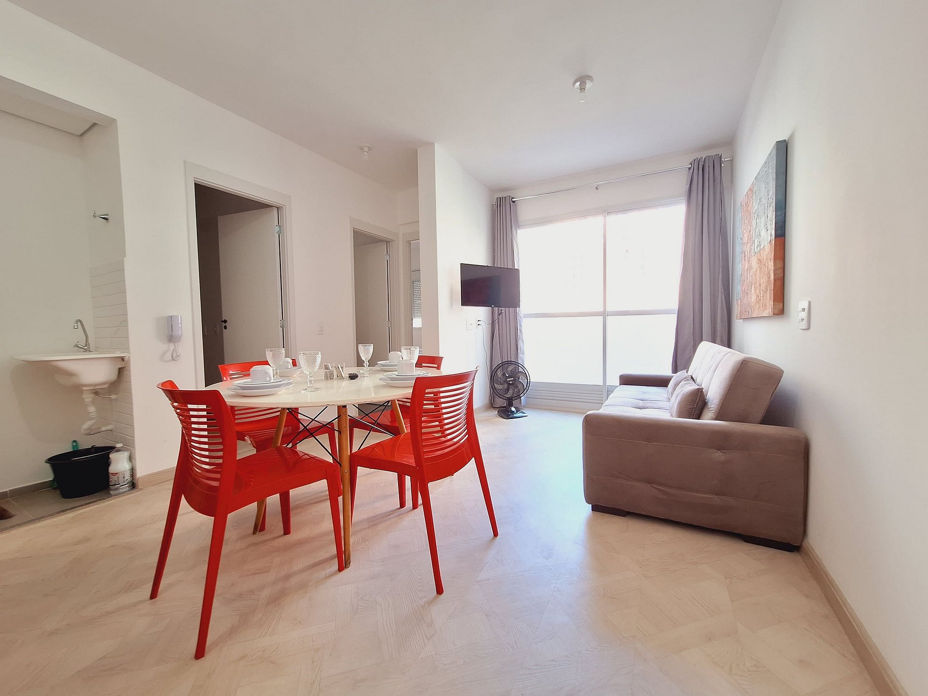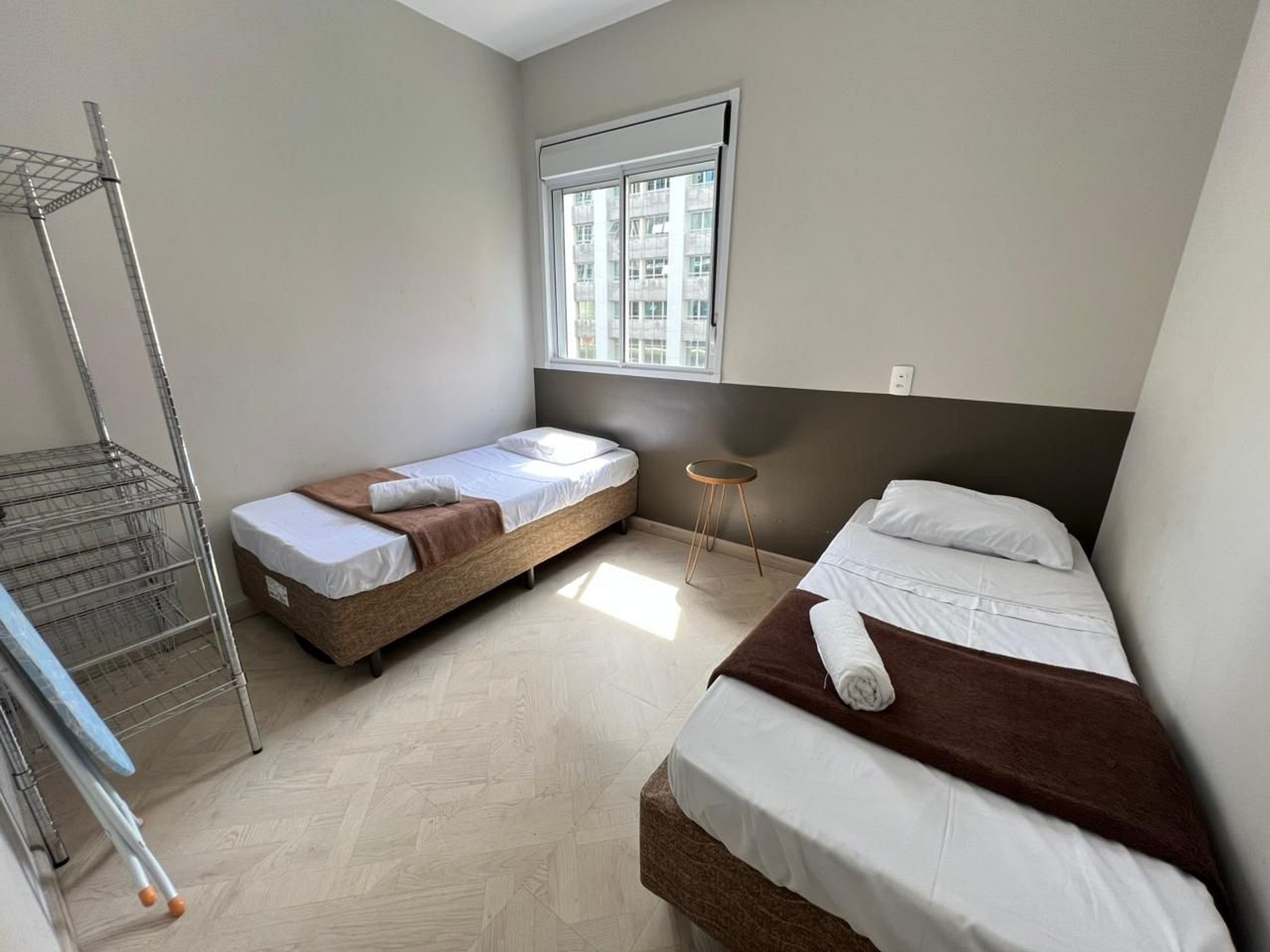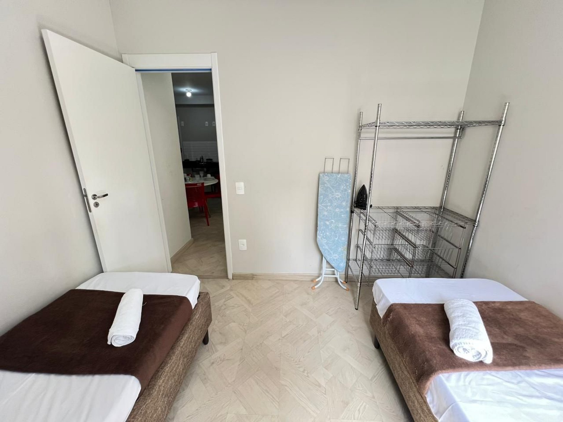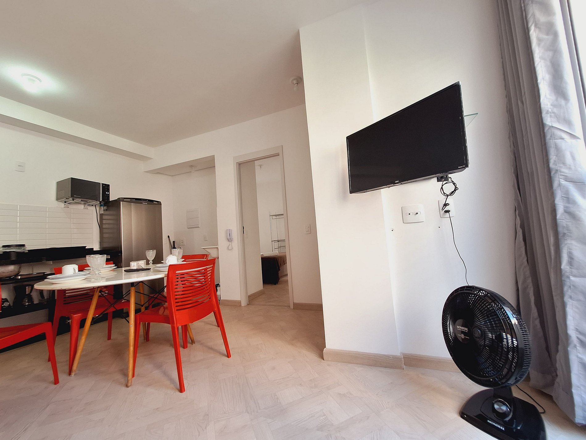 A suíte possui uma cama de casal, uma mesa de cabeceira e aramados com cabides. O segundo quarto conta com duas camas de solteiro. O apartamento oferece travesseiros, roupa de cama e banho, shampoo e sabonete. A sala de estar possui um ambiente com uma uma mesa com quatro cadeiras para refeição e trabalho e um sofá com televisão 43". Possui ainda varanda. O outro ambiente é uma cozinha americana , e está equipada com refrigerador, fogão de indução, micro-ondas de 20L, sanduicheira inox grill, liquidificador, garrafa térmica com base de filtro para café e cafeteira elétrica . Máquina de lavar e produtos de limpeza à disposição. A cozinha possui também copos, taças, pratos rasos, pratos fundos, tigelas e talheres e xícaras para quatro pessoas. Esta disponível ferro e tábua de passar.
