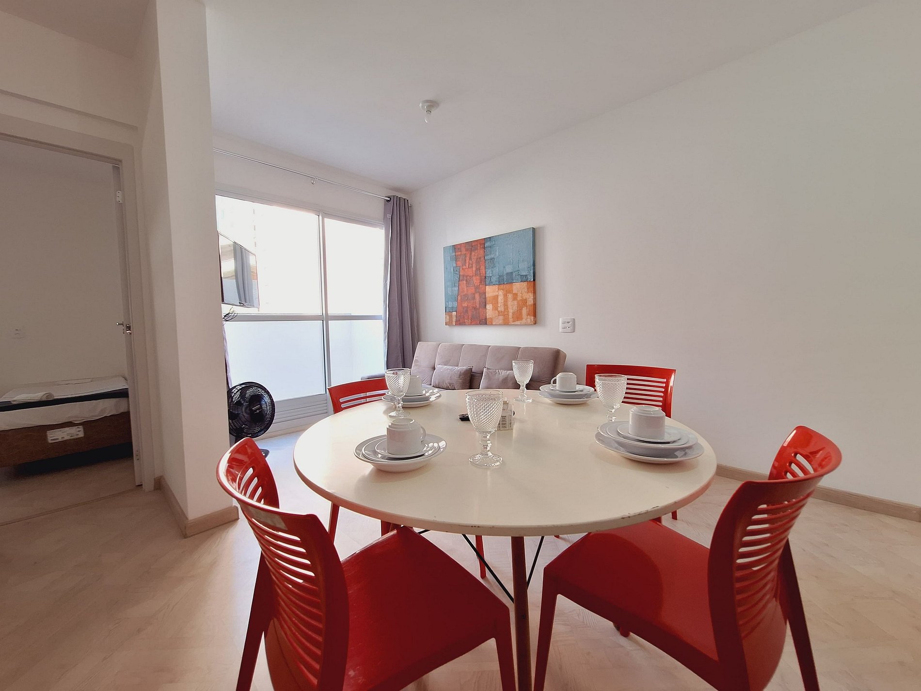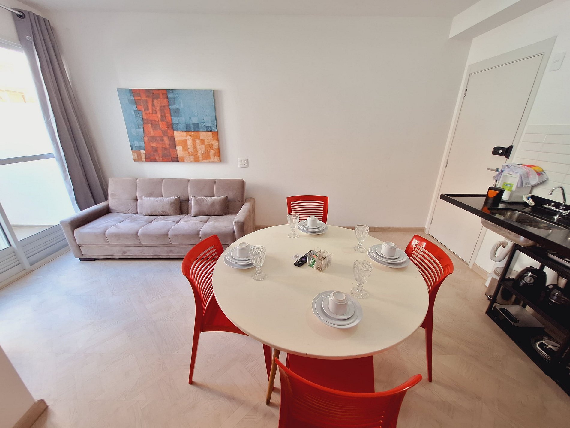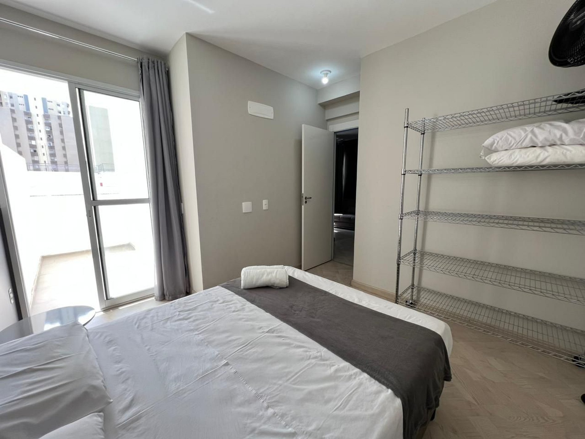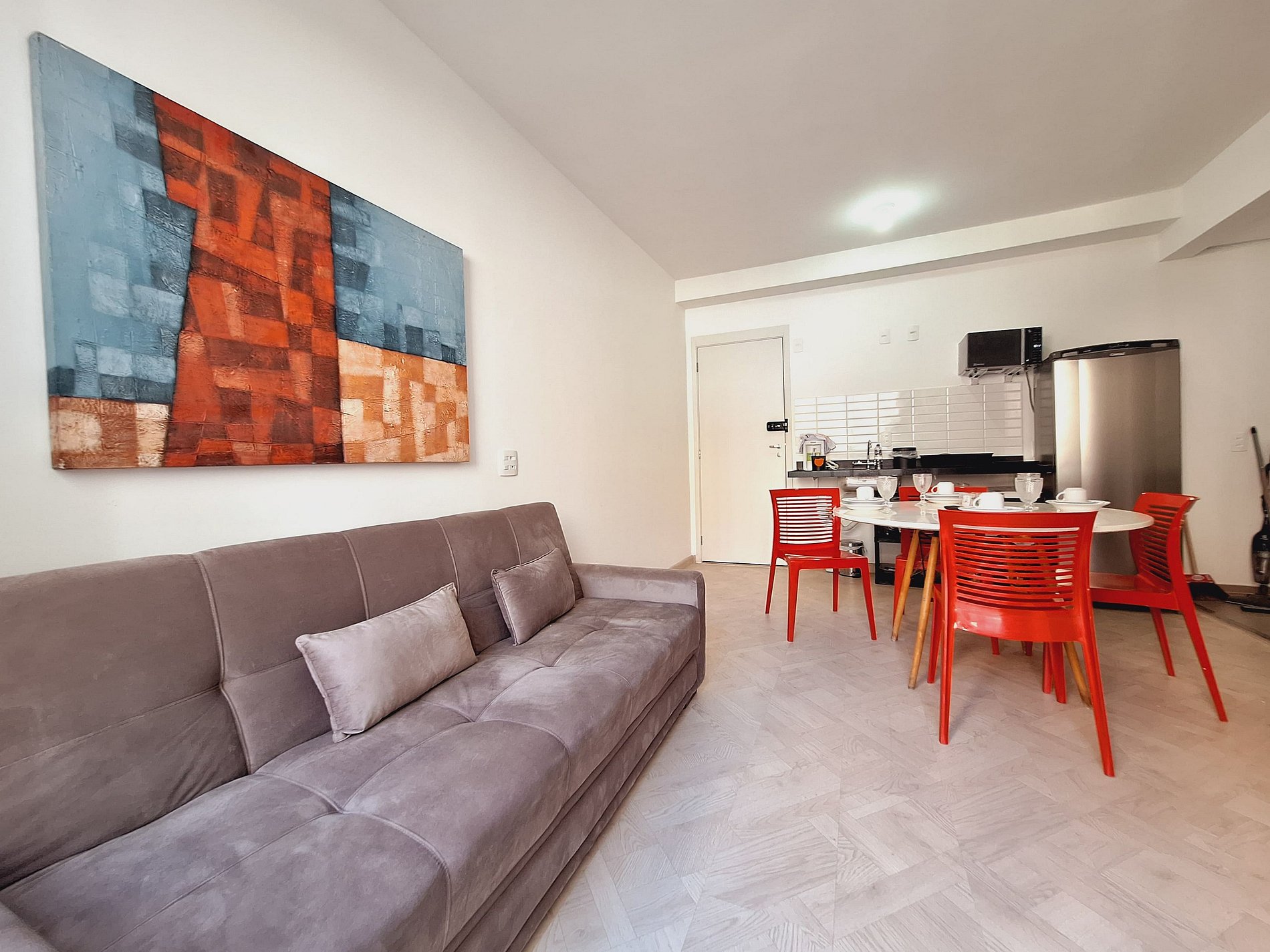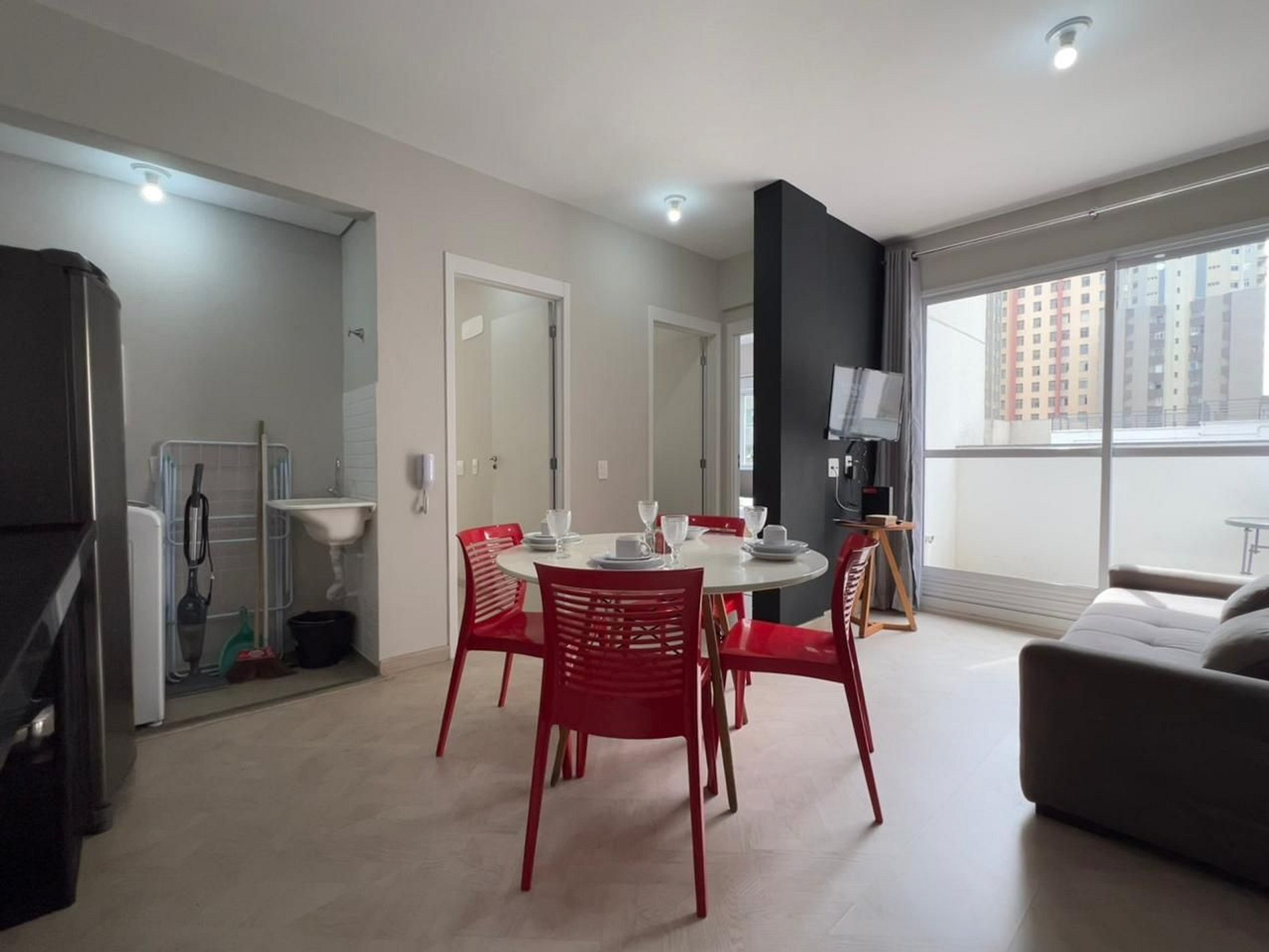 A suíte possui uma cama de casal, uma mesa de cabeceira e aramados com cabides. O segundo quarto conta com duas camas de solteiro. O apartamento oferece travesseiros, roupa de cama e banho, shampoo e sabonete. A sala de estar possui um ambiente com uma uma mesa com quatro cadeiras para refeição e trabalho e um sofá com televisão 43". Possui ainda varanda. O outro ambiente é uma cozinha americana , e está equipada com refrigerador, fogão de indução, micro-ondas de 20L, sanduicheira inox grill, liquidificador, garrafa térmica com base de filtro para café e cafeteira elétrica . Máquina de lavar e produtos de limpeza à disposição. A cozinha possui também copos, taças, pratos rasos, pratos fundos, tigelas e talheres e xícaras para quatro pessoas. Esta disponível ferro e tábua de passar.