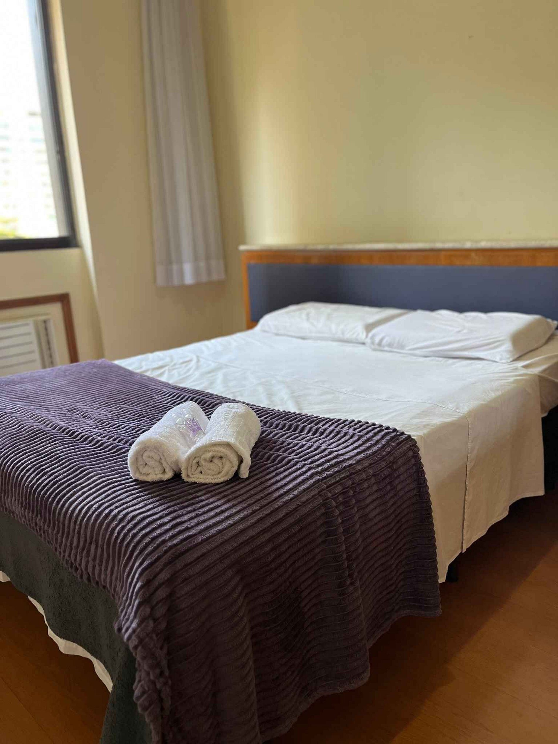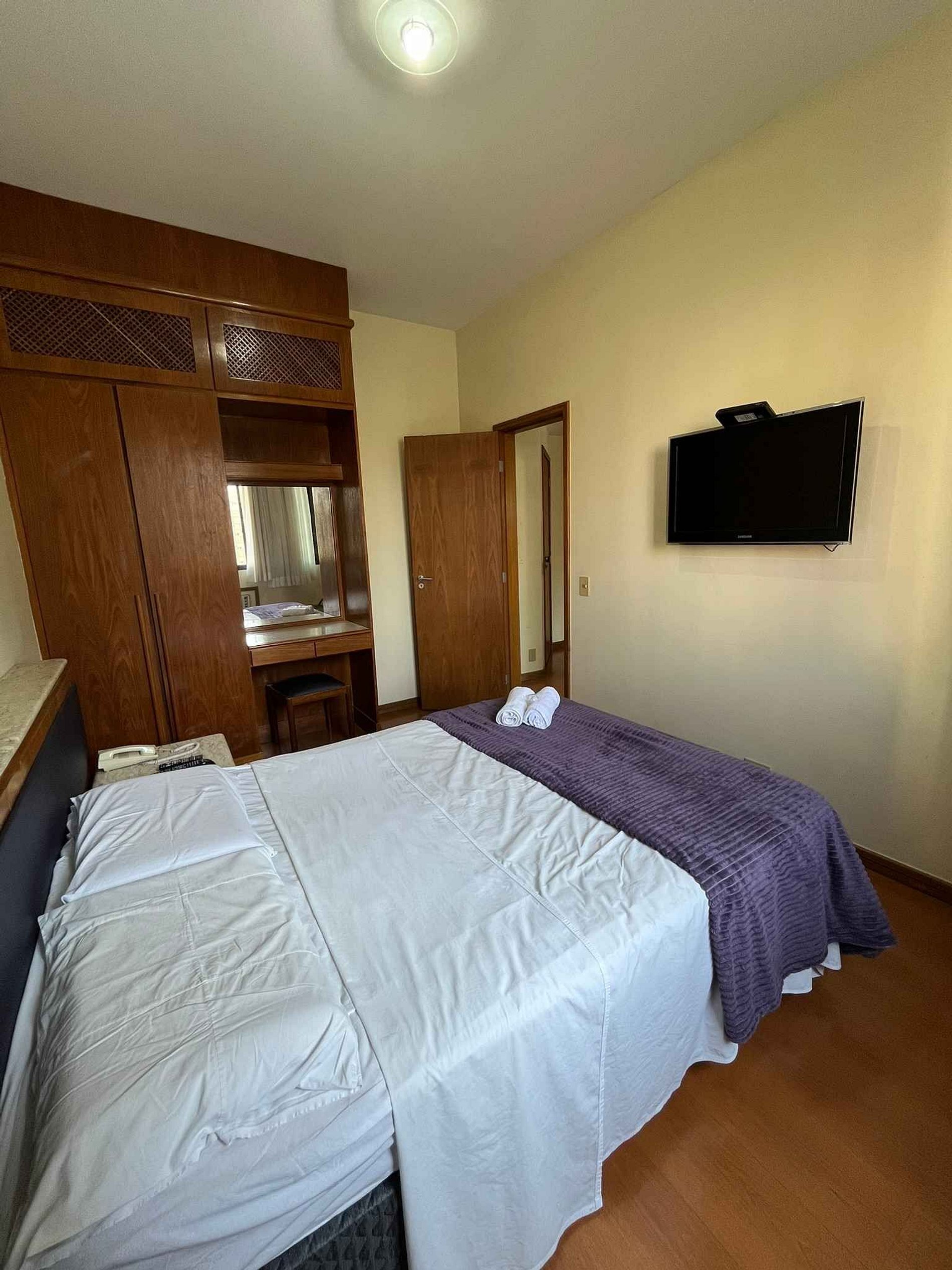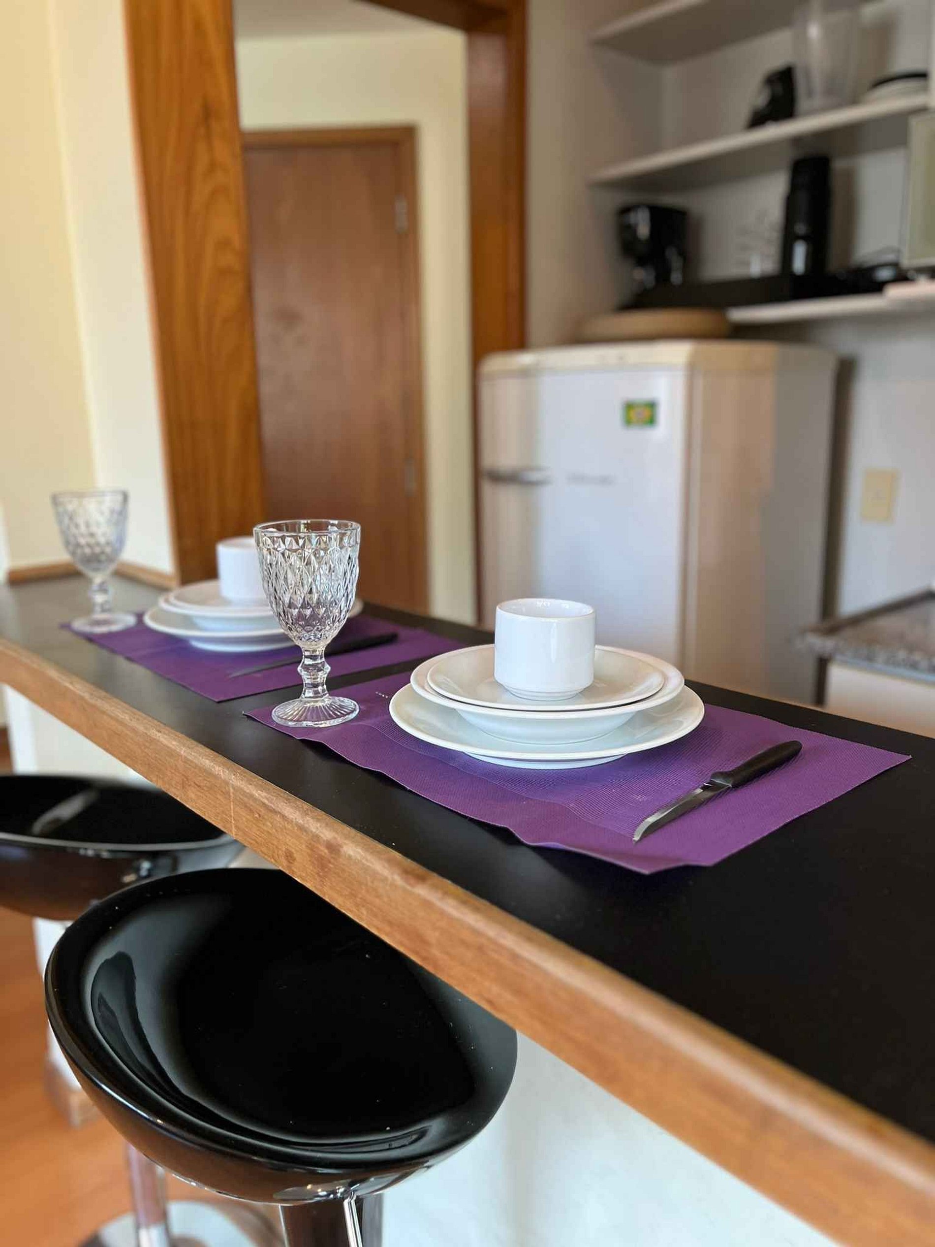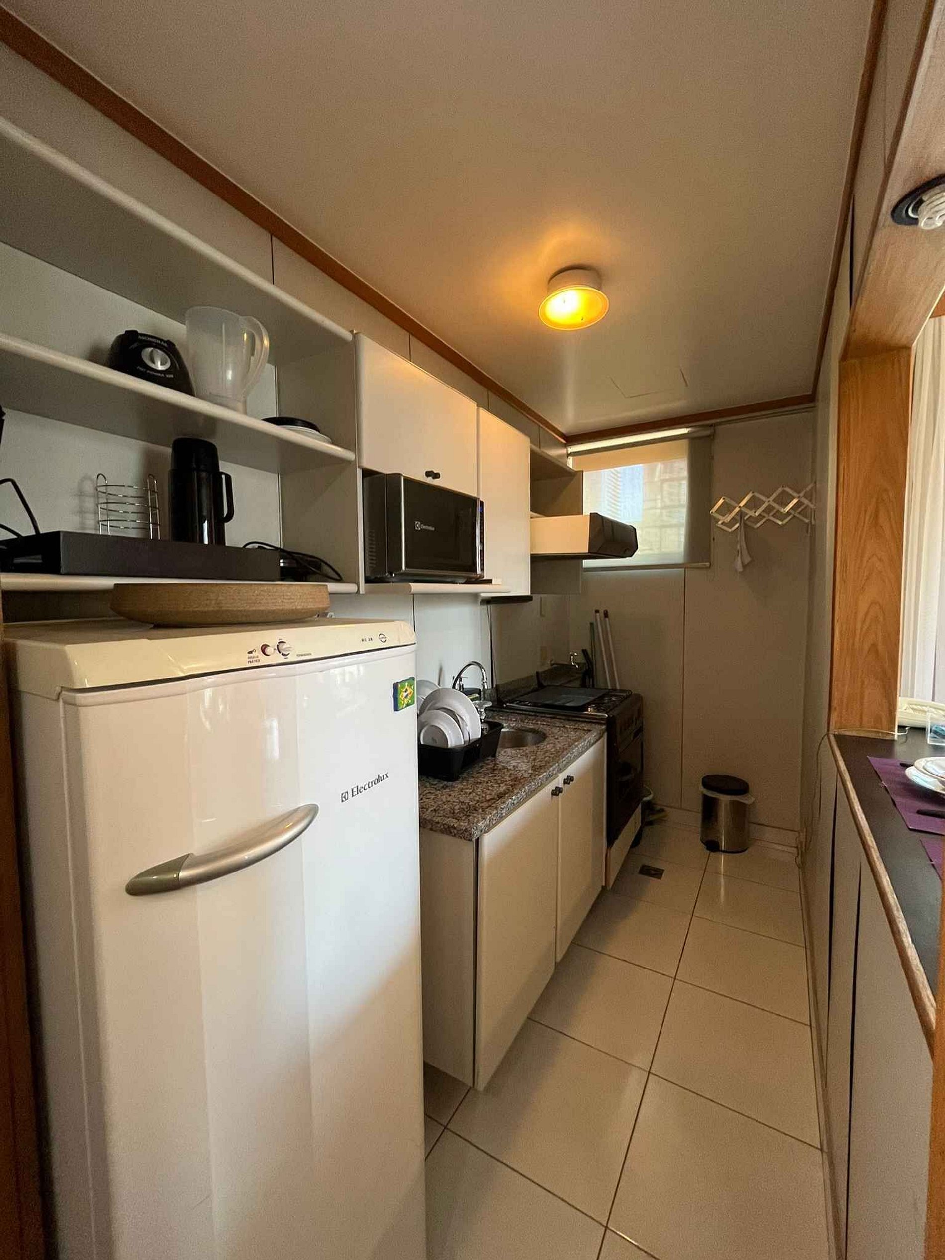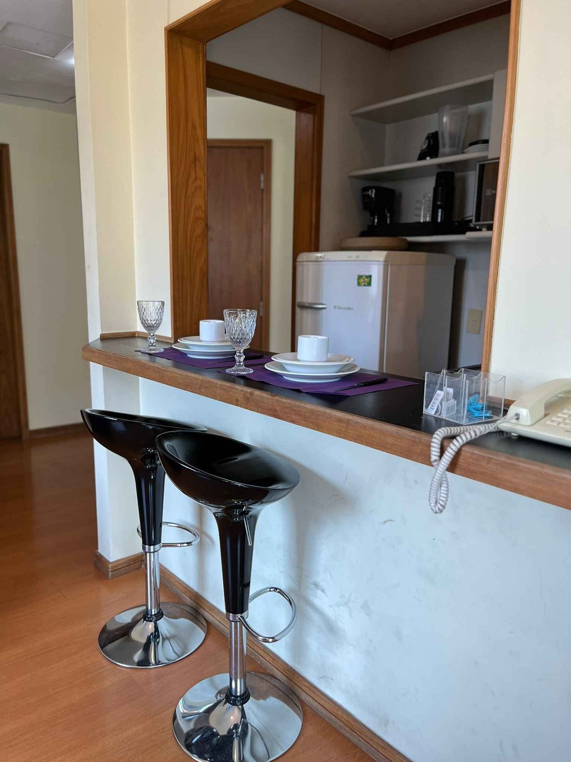O quarto possui uma cama de casal padrão, um criado e armário com cabides e televisão. O apartamento oferece travesseiros, roupa de cama e banho, shampoo e sabonete. A sala de estar possui um ambiente com uma uma bancada com duas cadeiras para refeição e trabalho e um sofá com televisão 43". O outro ambiente é uma cozinha americana com armários, e está equipada com refrigerador fogão quatro bocas com forno, Micro-ondas de 20L, sanduicheira inox grill, liquidificador, garrafa térmica com base de filtro para café e cafeteira elétrica. A cozinha possui também copos, taças, pratos rasos, pratos fundos, tigelas e talheres e xícaras para quatro pessoas. Esta disponível ferro e taboa de passar.