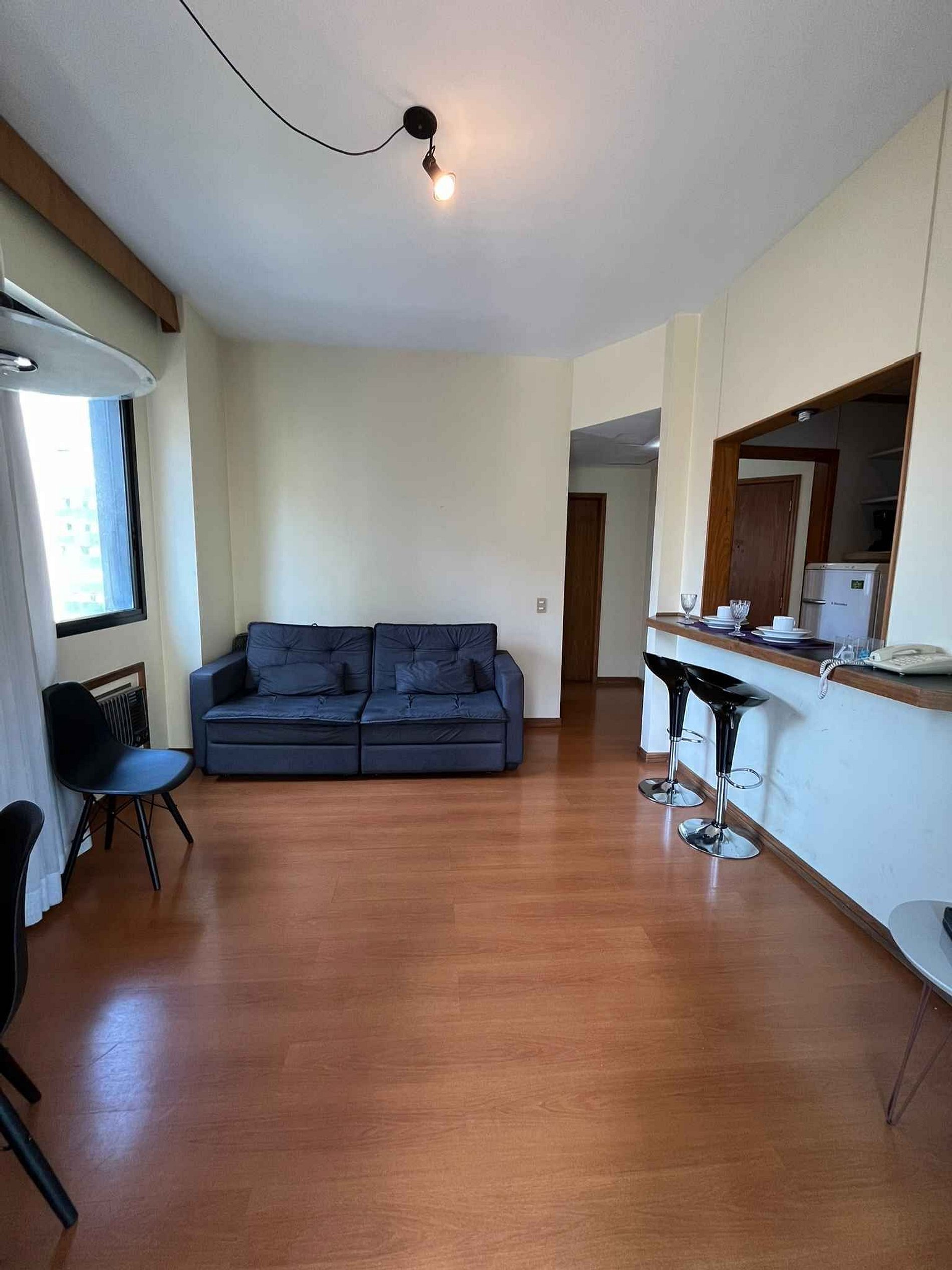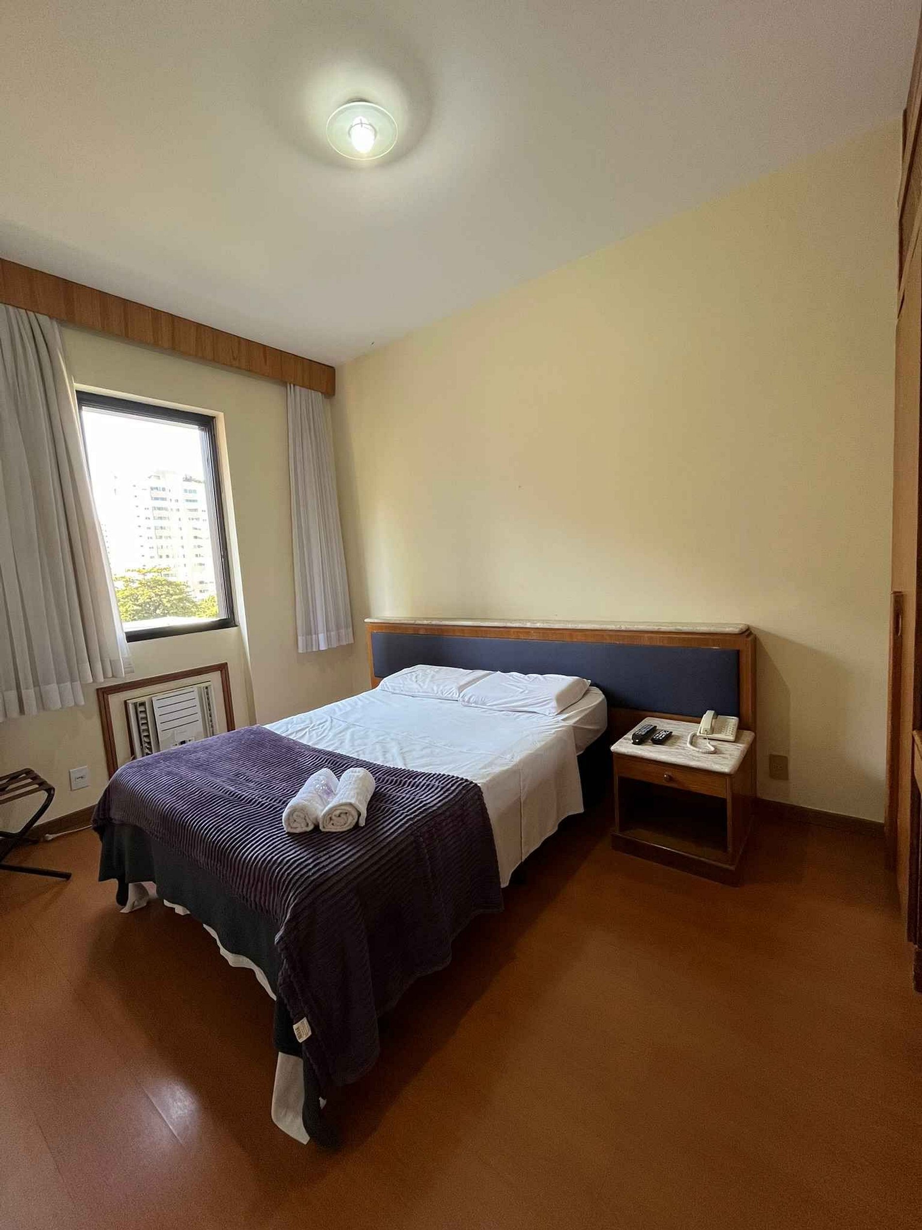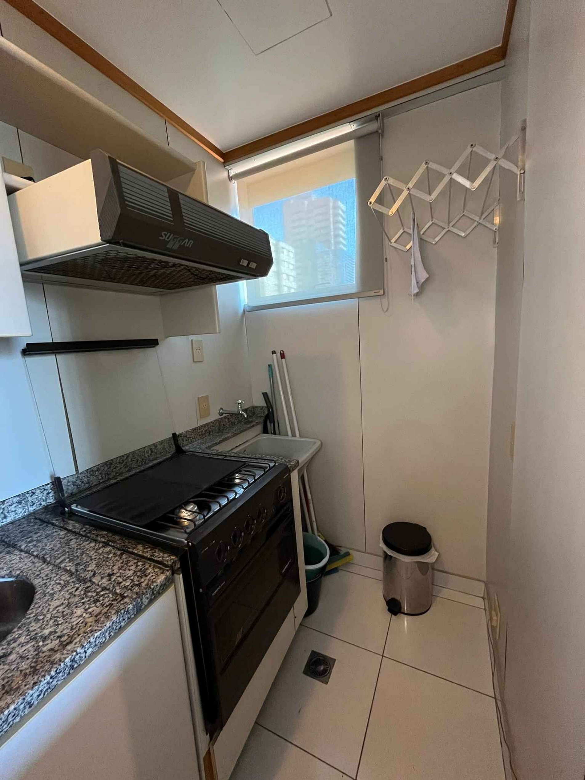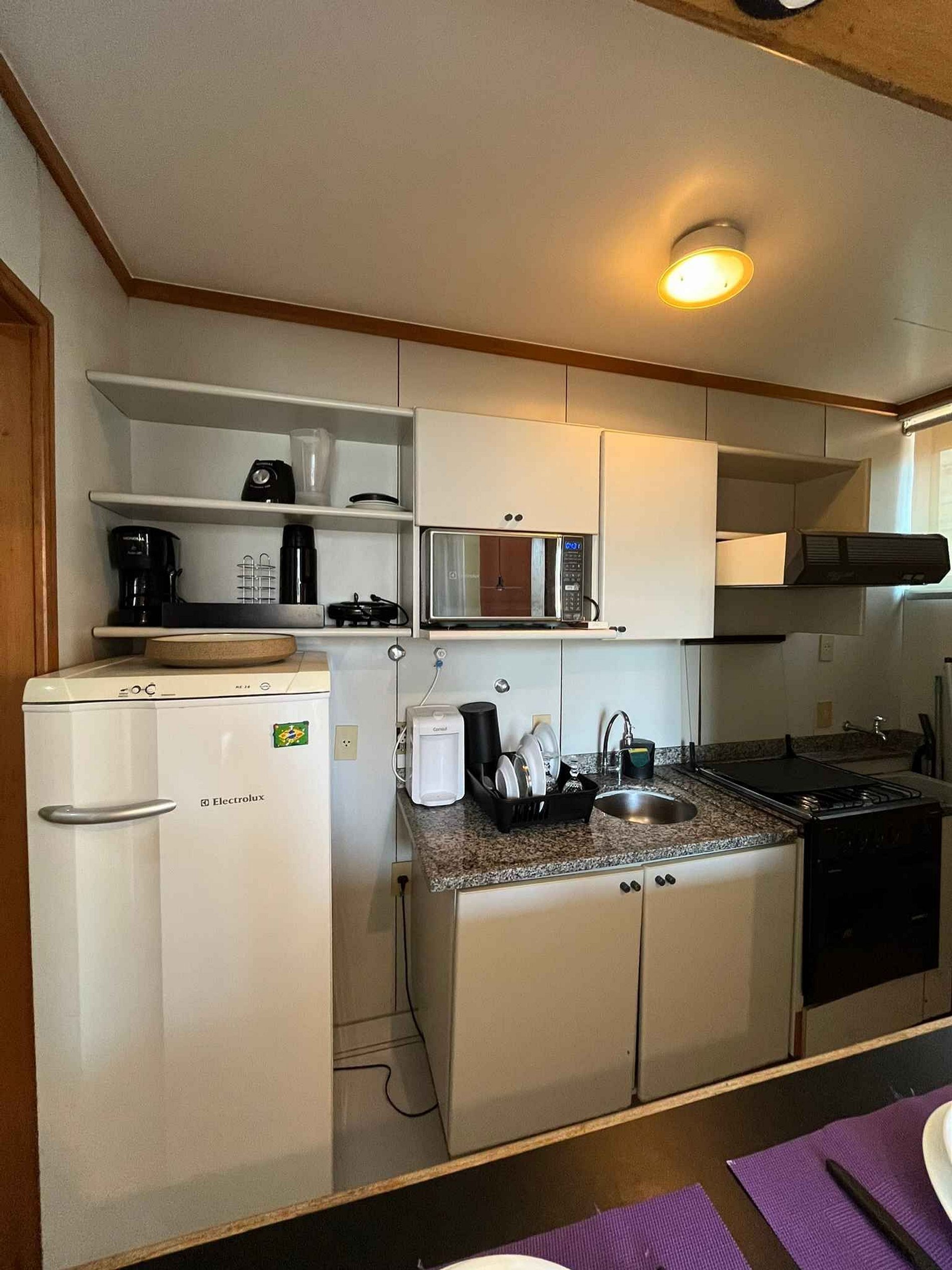 O quarto possui uma cama de casal padrão, um criado e armário com cabides e televisão. O apartamento oferece travesseiros, roupa de cama e banho, shampoo e sabonete. A sala de estar possui um ambiente com uma uma bancada com duas cadeiras para refeição e trabalho e um sofá com televisão 43". O outro ambiente é uma cozinha americana com armários, e está equipada com refrigerador fogão quatro bocas com forno, Micro-ondas de 20L, sanduicheira inox grill, liquidificador, garrafa térmica com base de filtro para café e cafeteira elétrica. A cozinha possui também copos, taças, pratos rasos, pratos fundos, tigelas e talheres e xícaras para quatro pessoas. Esta disponível ferro e taboa de passar.